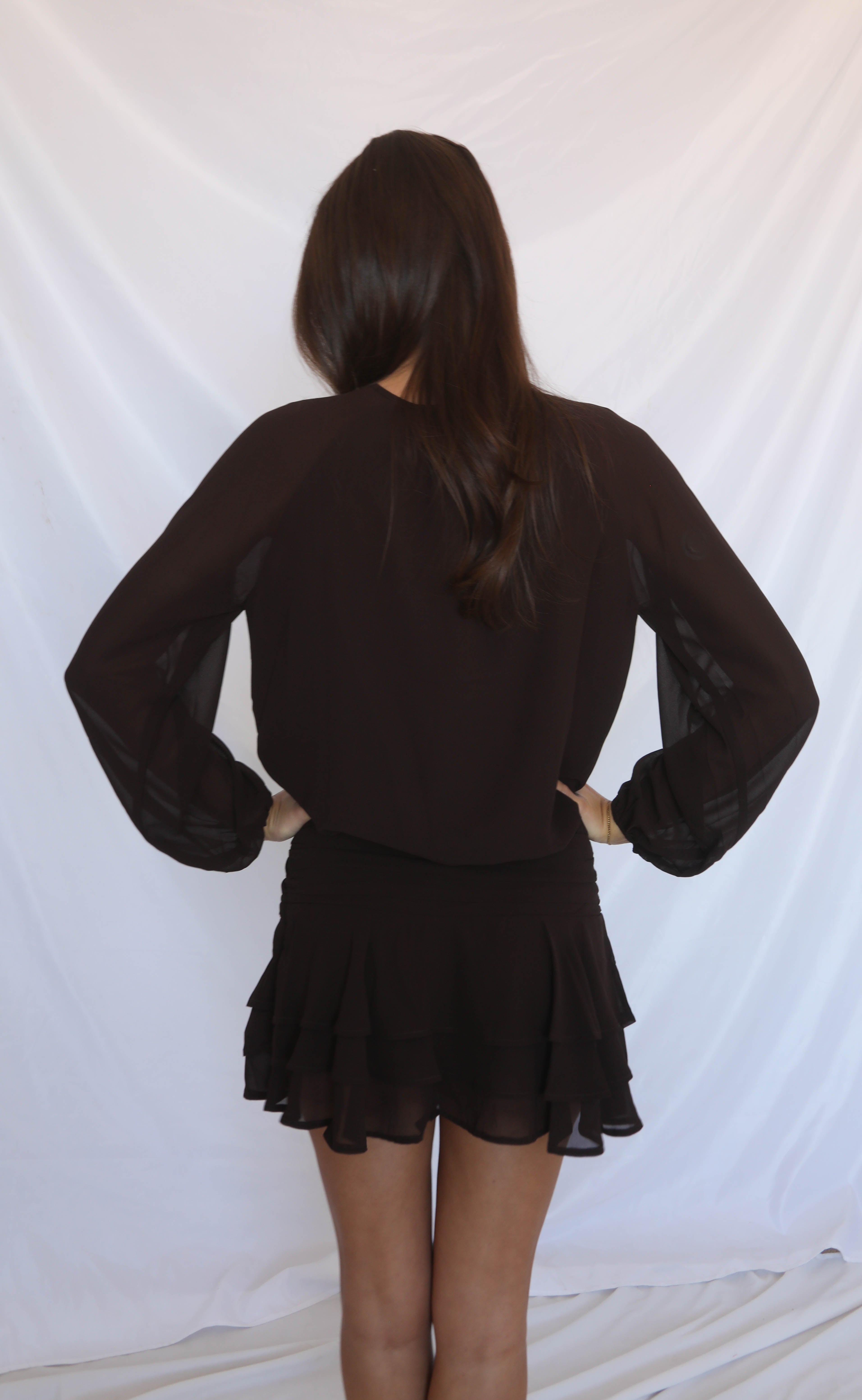 This chocolate brown mini dress features a surplice V-neckline, long sheer sleeves, a flattering drop waist, and a tiered mini skirt for movement and style. Perfect for brunch, date night, or any seasonal outing where you want to feel polished and playful.