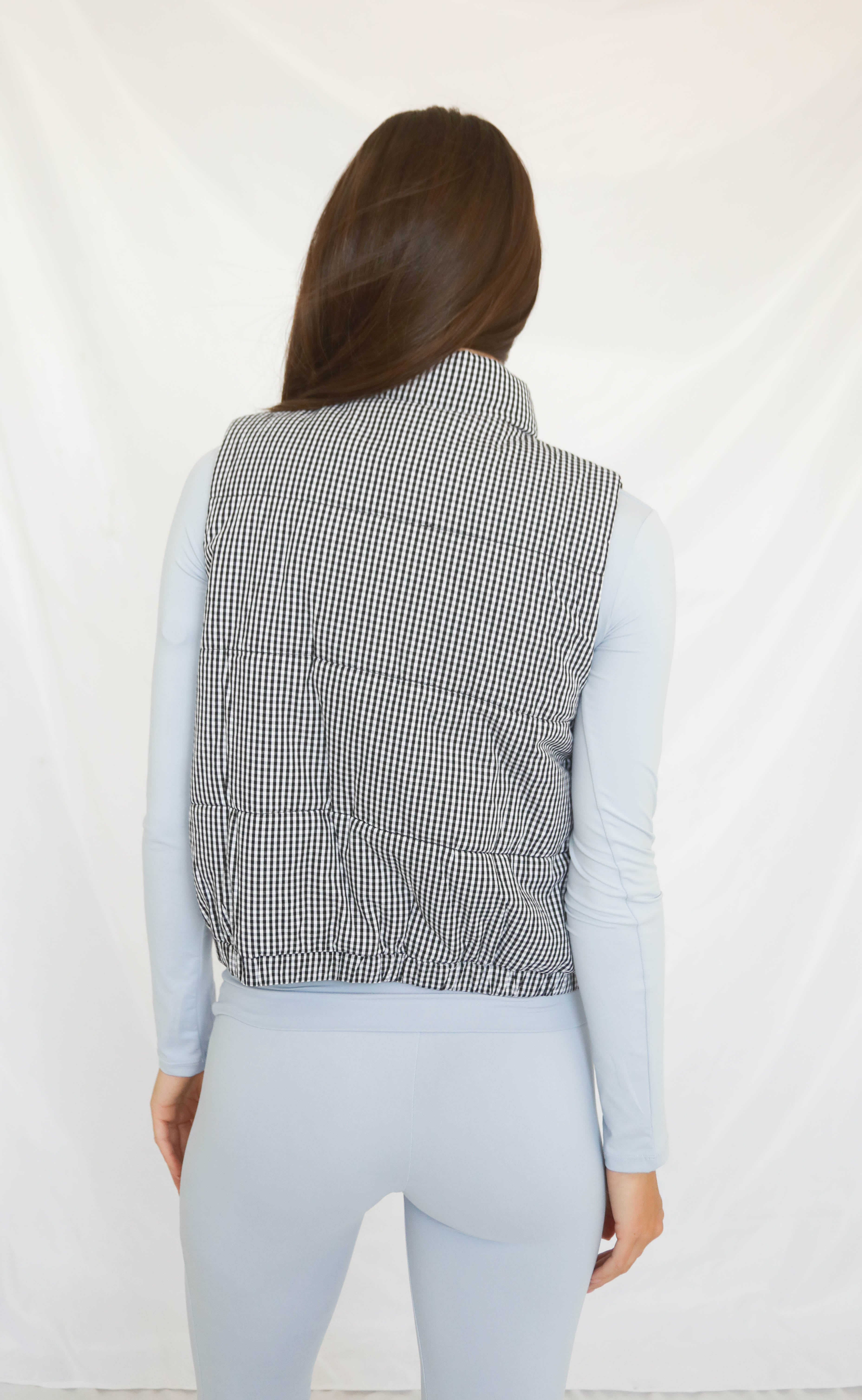 Add playful charm to your cold weather layers with this black and white gingham puffer vest. Featuring a snap-front closure and sherpa heart details outlined in delicate lace, it’s cozy, cute, and perfect for layering over sweaters, long sleeves, or even casual dresses for an extra touch of fall whimsy.