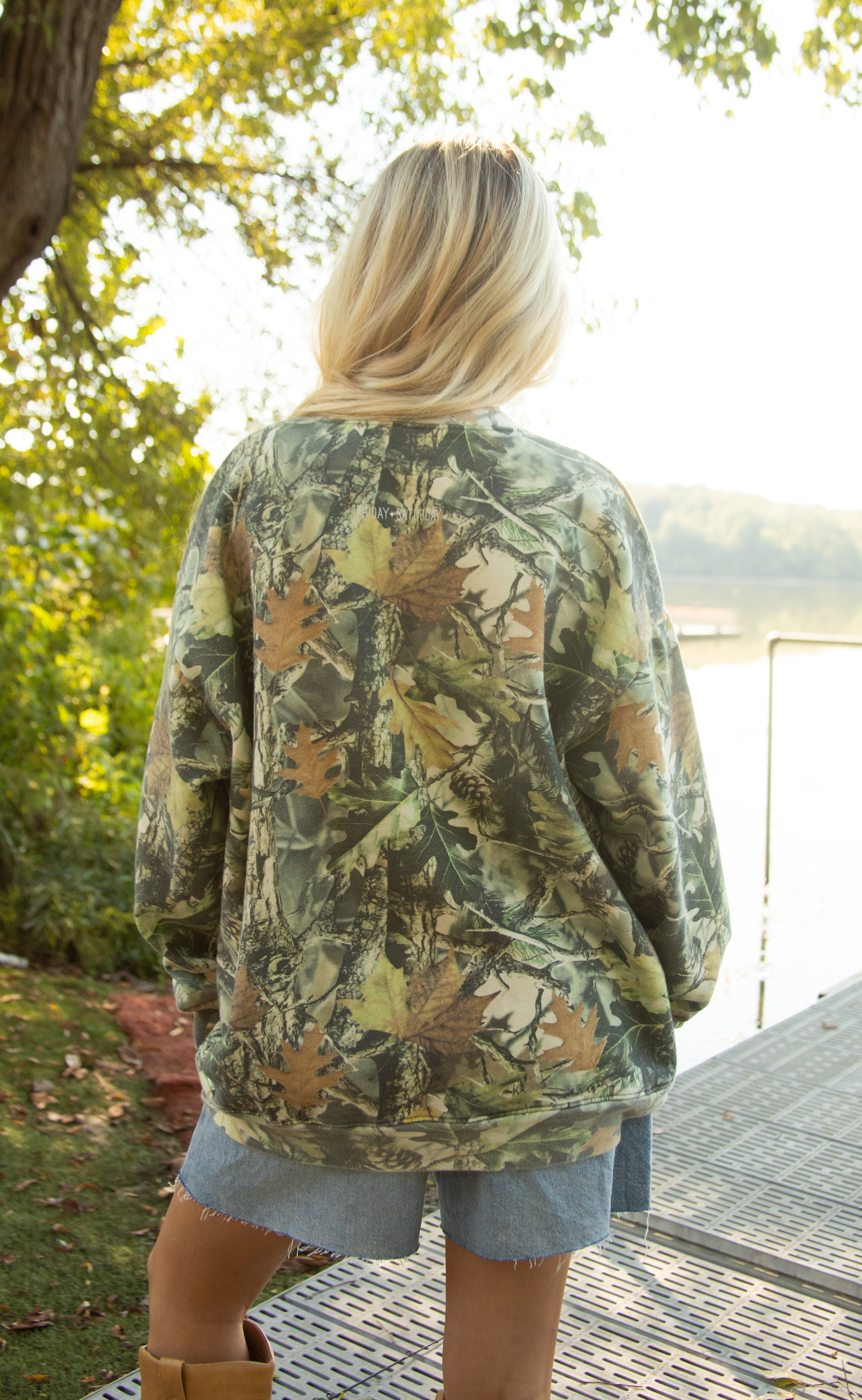 This camo fisherman sweatshirt features a bold white fish print with the motto “Keep Moving Forward.” Perfect for layering on crisp mornings or wearing oversized.. A must-have camo crewneck for fall that takes fisherman core to the next level.