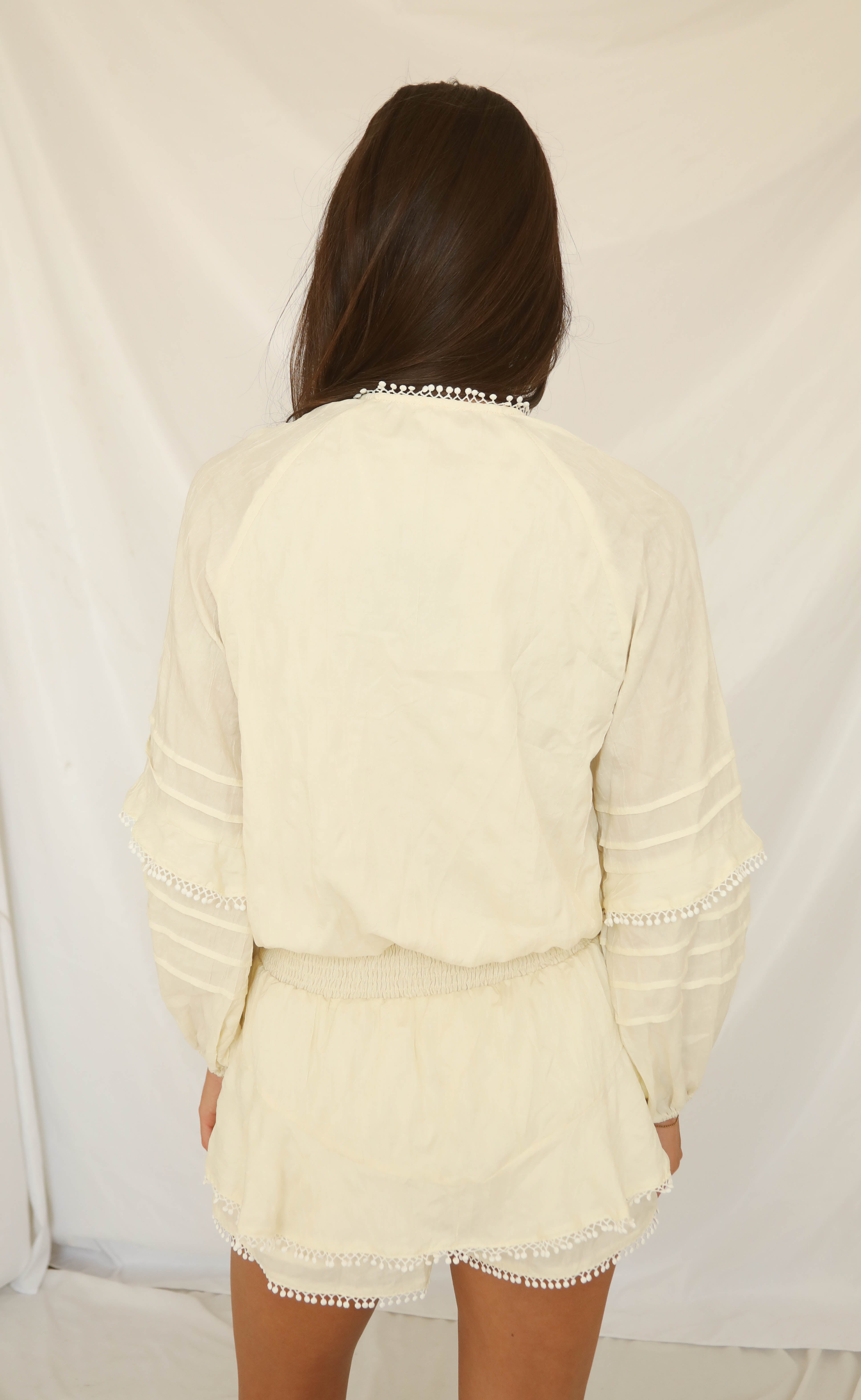 Soft, flirty, and effortlessly chic - the Sweet Talk Romper is your new go-to for any season. Featuring a V-neckline with button-front details, a flattering smocked waist, and tiered shorts for the perfect flowy fit. The long sleeves with tiny pom pom trim add just the right touch of whimsy.