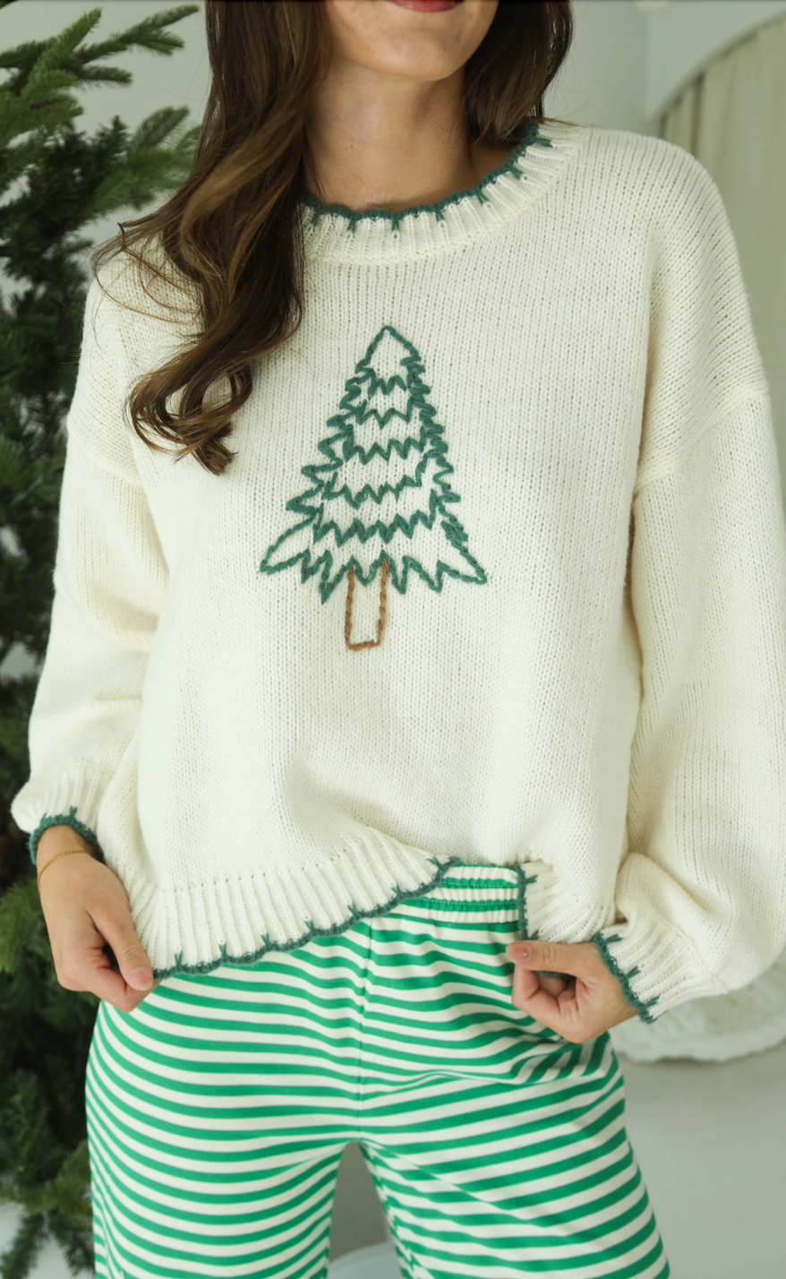Bring classic holiday cheer to your wardrobe. This white knit sweater features drop shoulders and a charming embroidered Christmas tree on the front, with green-trimmed collar, cuffs, and hem for a playful seasonal touch. Cozy, cute, and perfect for holiday gatherings, photos, or layering for crisp winter days.