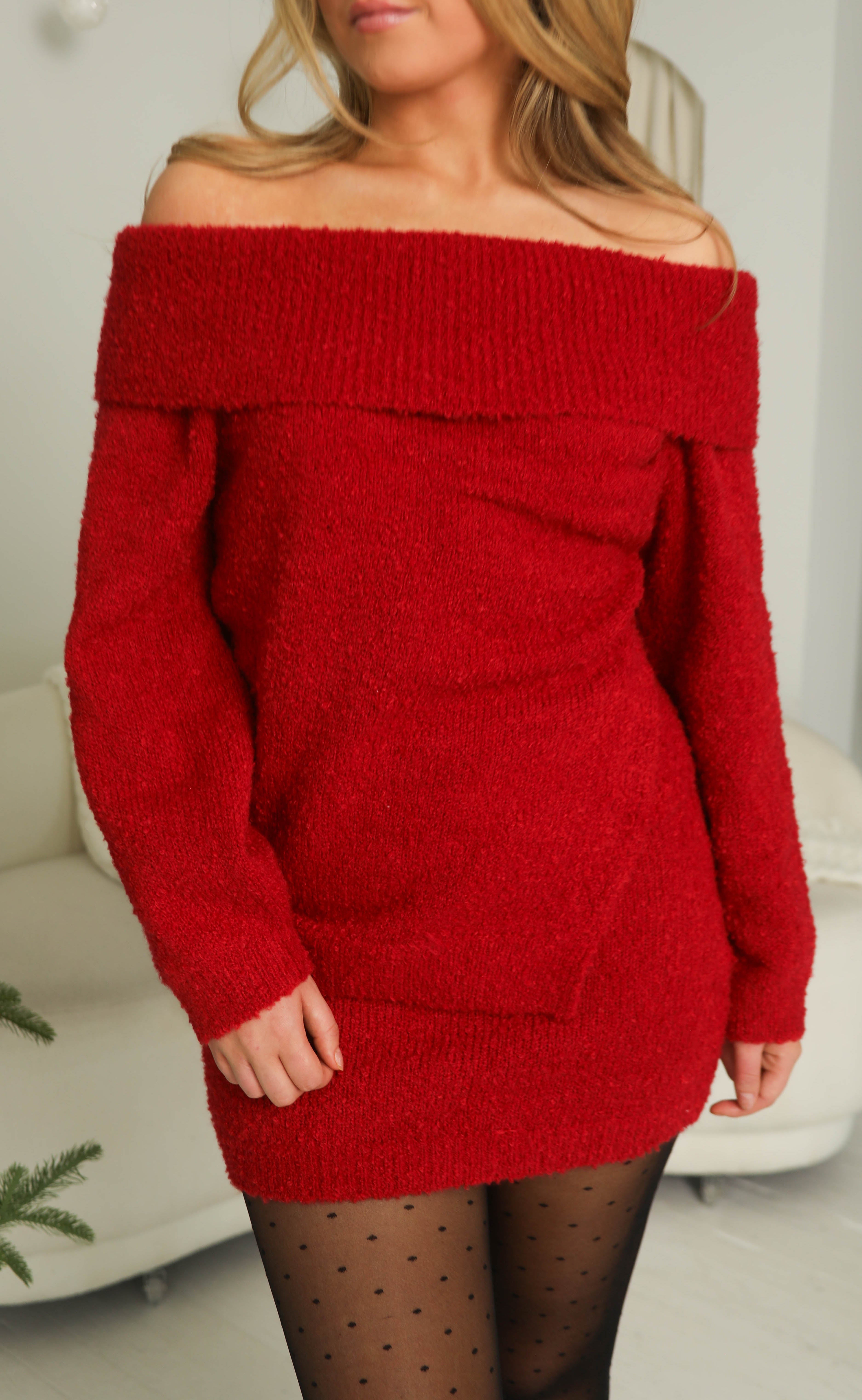 This ruby red sweater set is cozy, chic, and holiday-ready. The off-the-shoulder long sleeve top adds a touch of flirty elegance, while the matching mini skirt keeps the look playful and polished. Perfect for festive gatherings or stylish nights out.