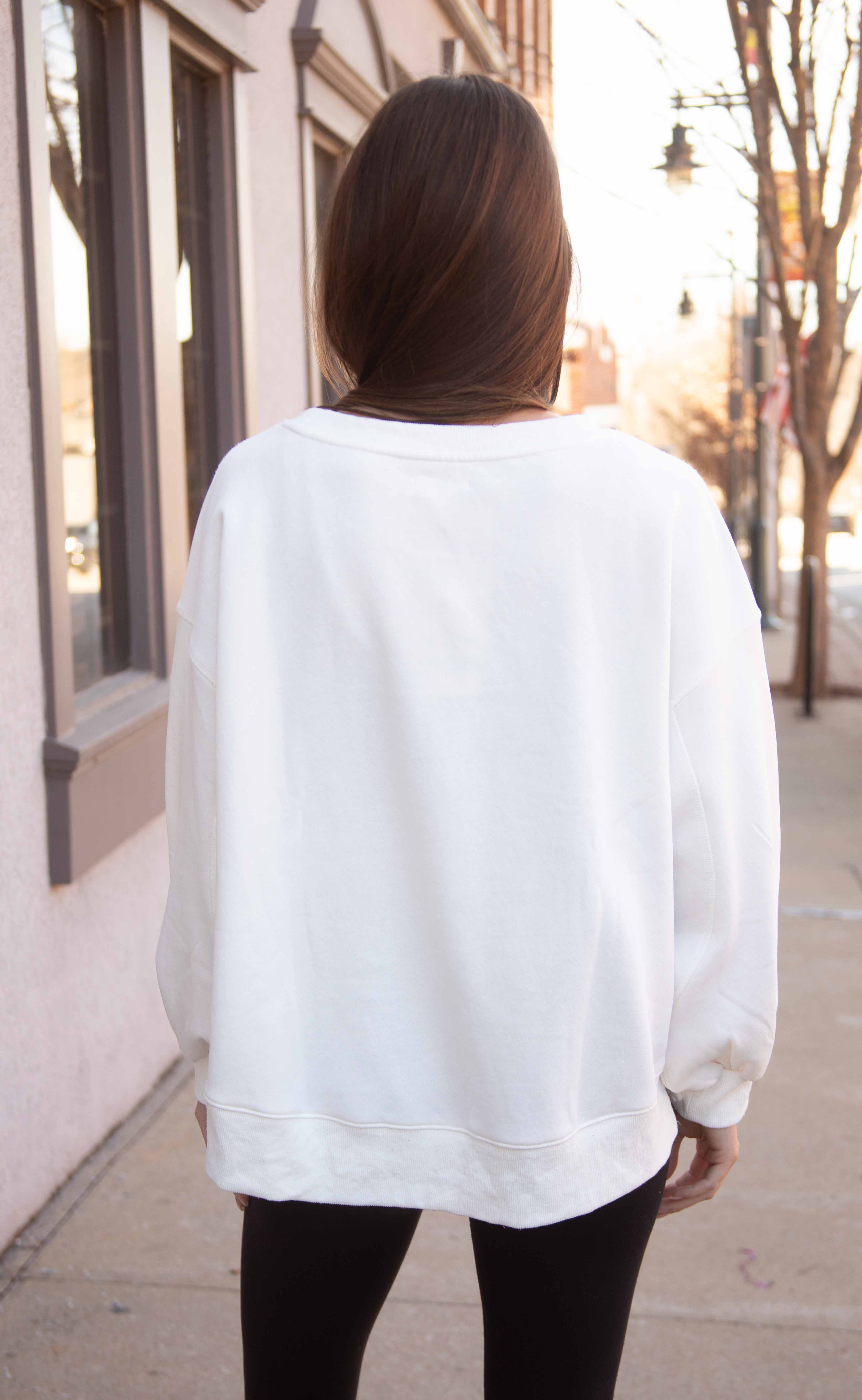 Introducing your new favorite pullover! The All Star Distressed Pullover is a cream colored crewneck, long sleeve pullover with drop shoulders and ribbed cuffs. It has a boxy, oversized fit and is adorned with red ARKANSAS lettering across the chest and onto the sleeves with pearl details.