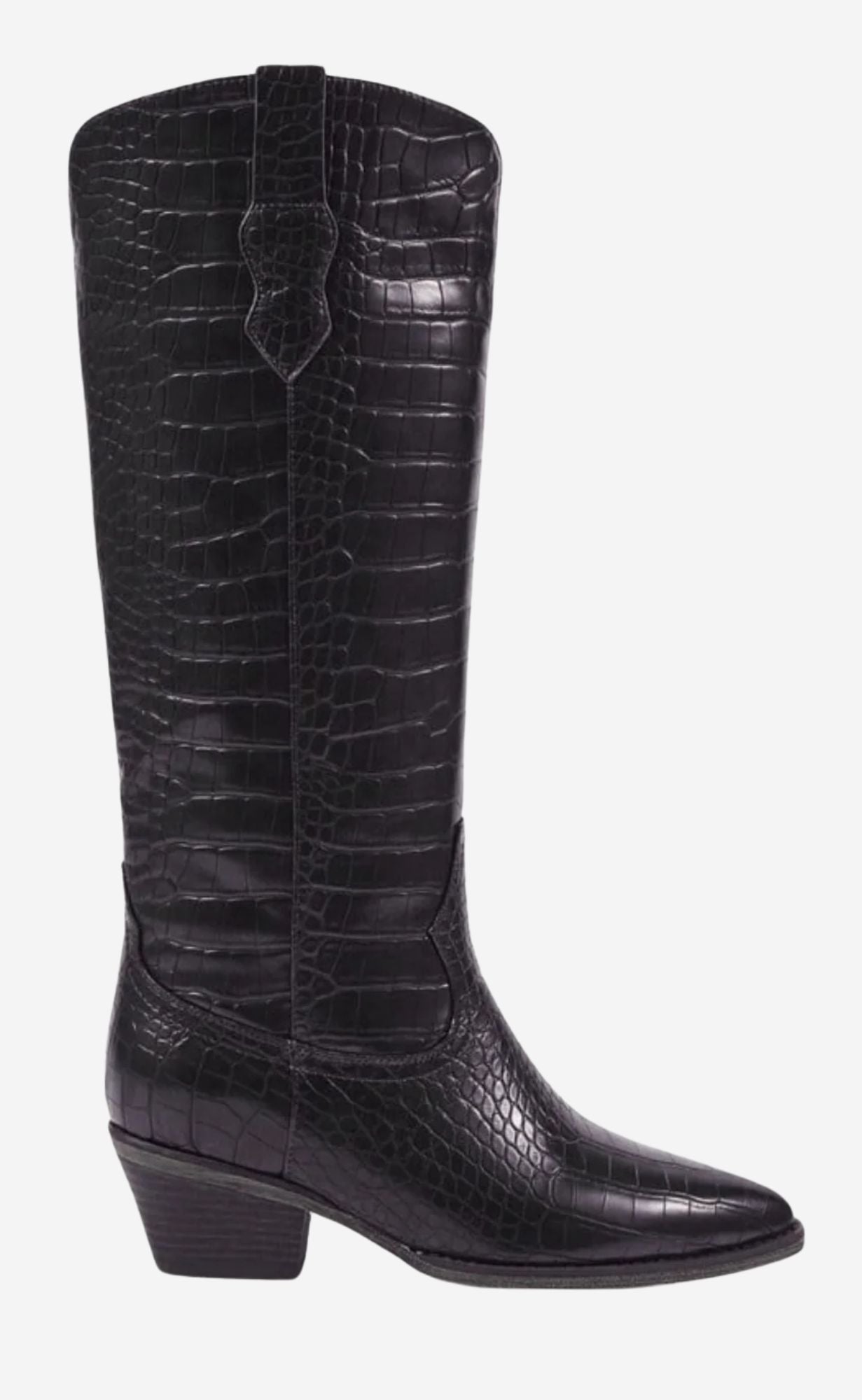 Introducing The LeAnn in Licorice- Elevate your wardrobe with a stunning pair of glossy, black cowgirl boots. Carefully crafted with a luxurious embossed crocodile texture, these boots are guaranteed to get you compliments. The vegan leather is durable, yet comfortable enough to wear all day.