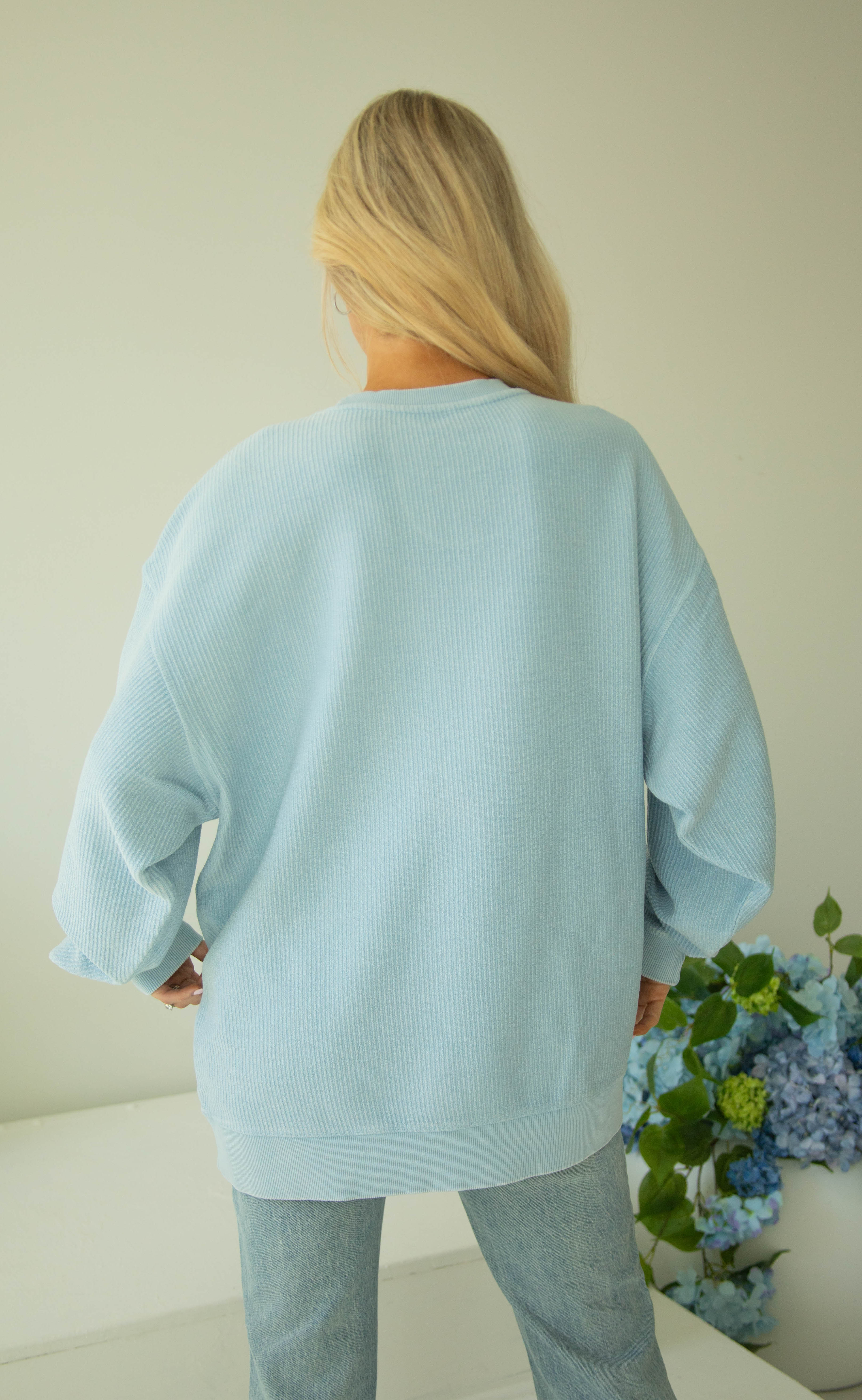 Our best-selling corded crewneck is back and making a major statement! This oversized favorite comes in a gorgeous light blue, featuring a bold, varsity-style "MOM" graphic in royal blue with a crisp white outline. The unique corded texture gives it that perfectly lived-in, vintage feel that only gets better with every wash.