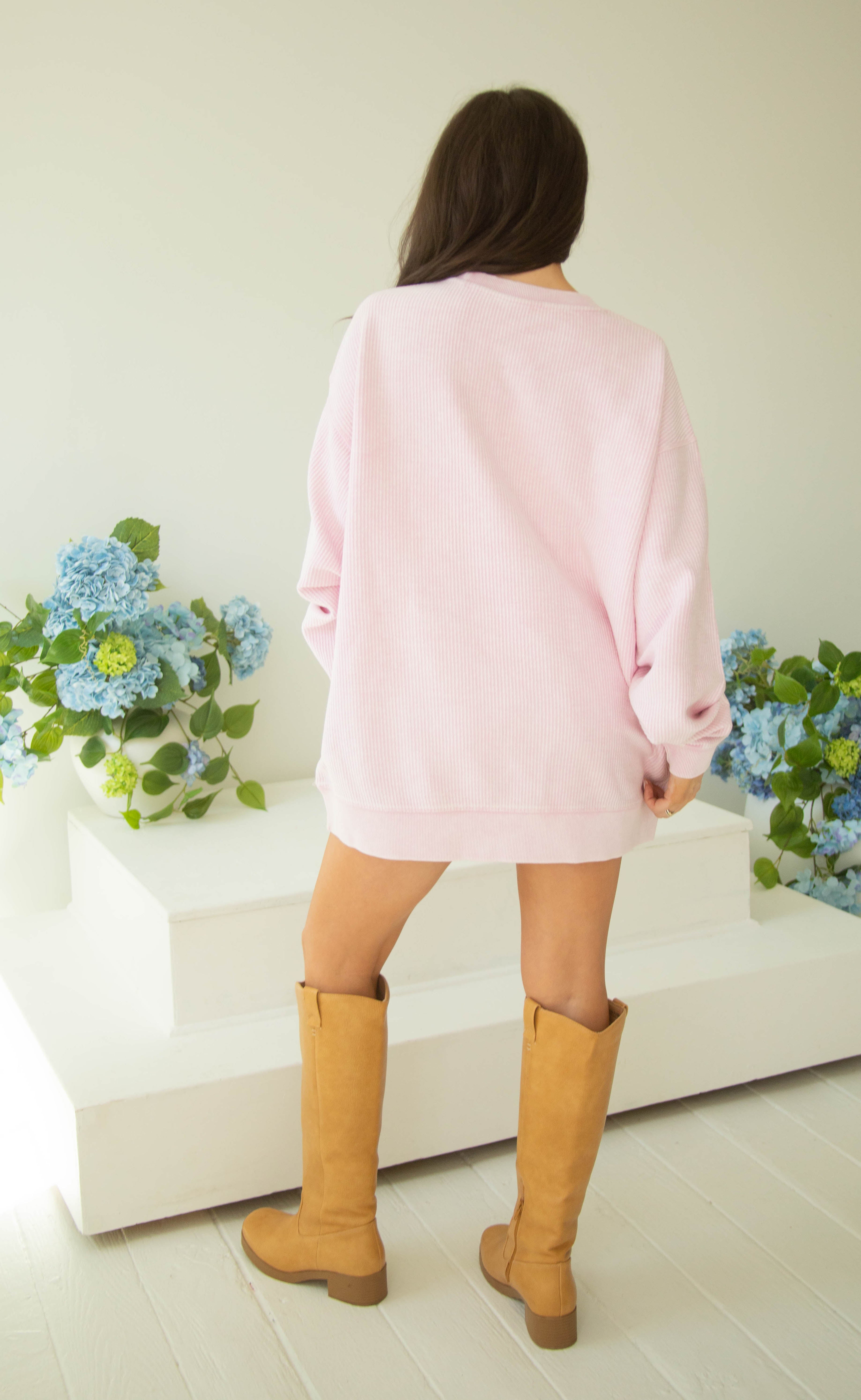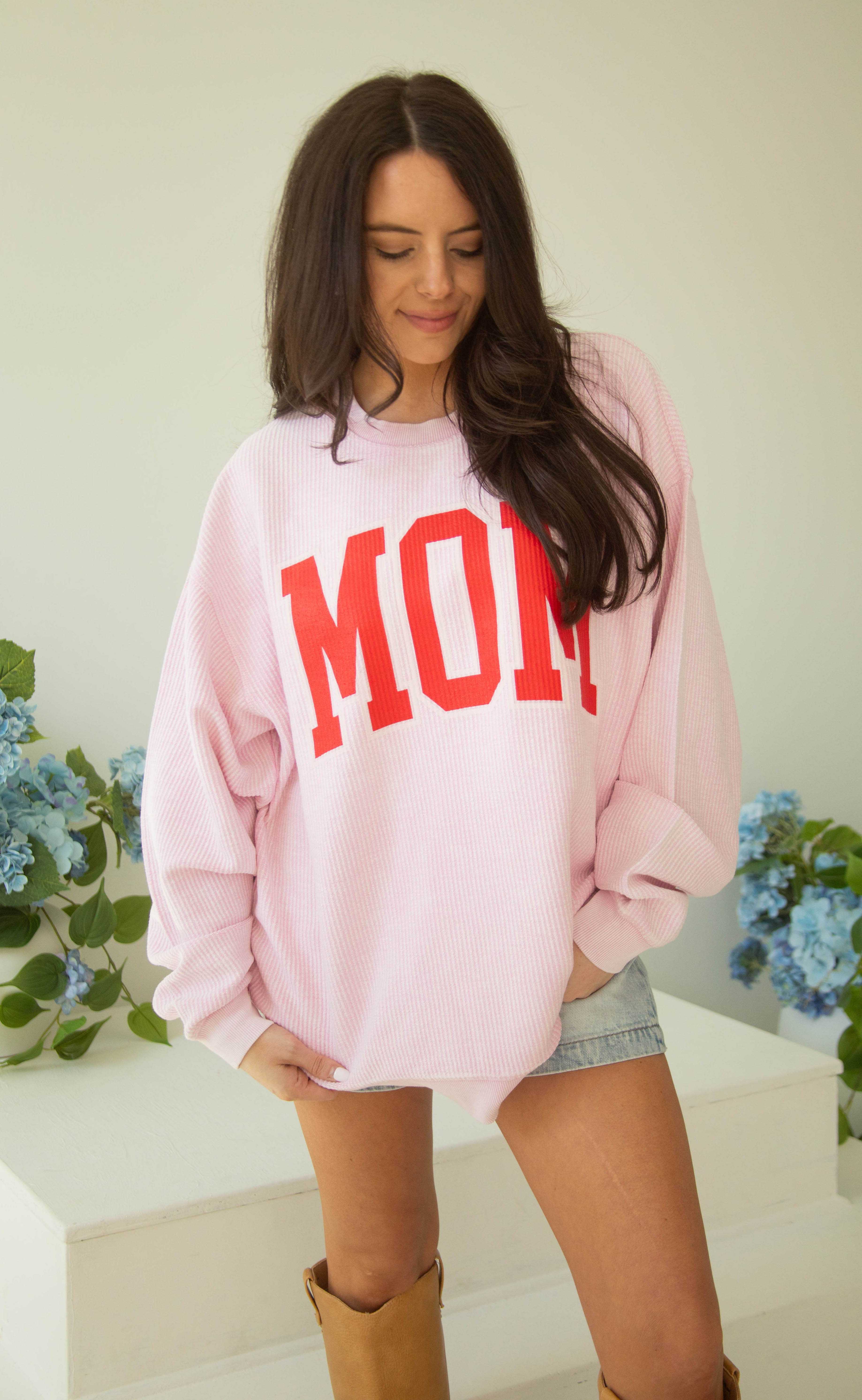 Our best-selling corded crewneck is back and making a major statement! This oversized favorite comes in a gorgeous light pink, featuring a bold, varsity-style "MOM" graphic in hot pink with a crisp white outline. The unique corded texture gives it that perfectly lived-in, vintage feel that only gets better with every wash.