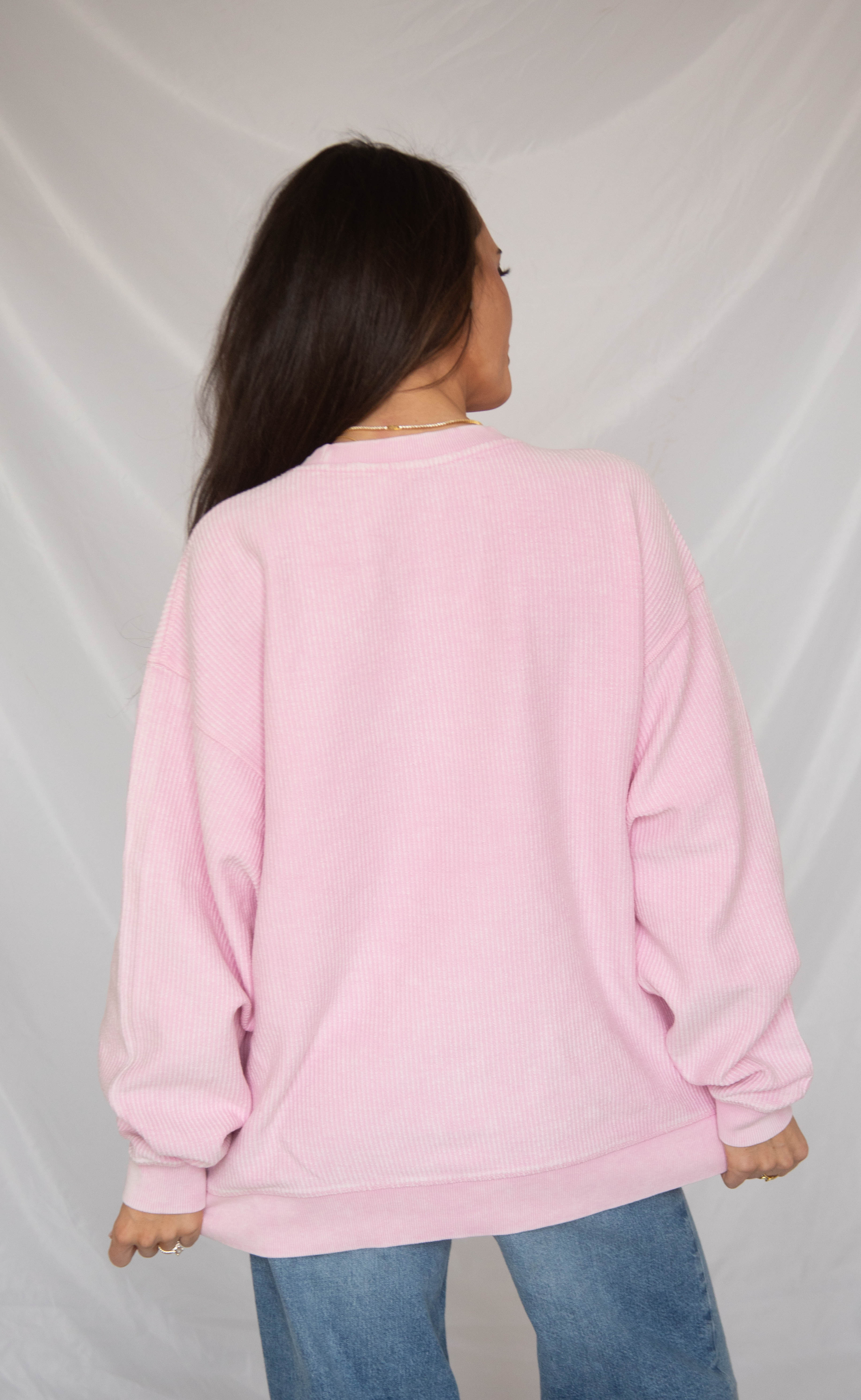 The corded sweatshirts are back and even better than before! The new pink Mom cord is a pretty soft pink shade with an oversized light pink and red graphic.