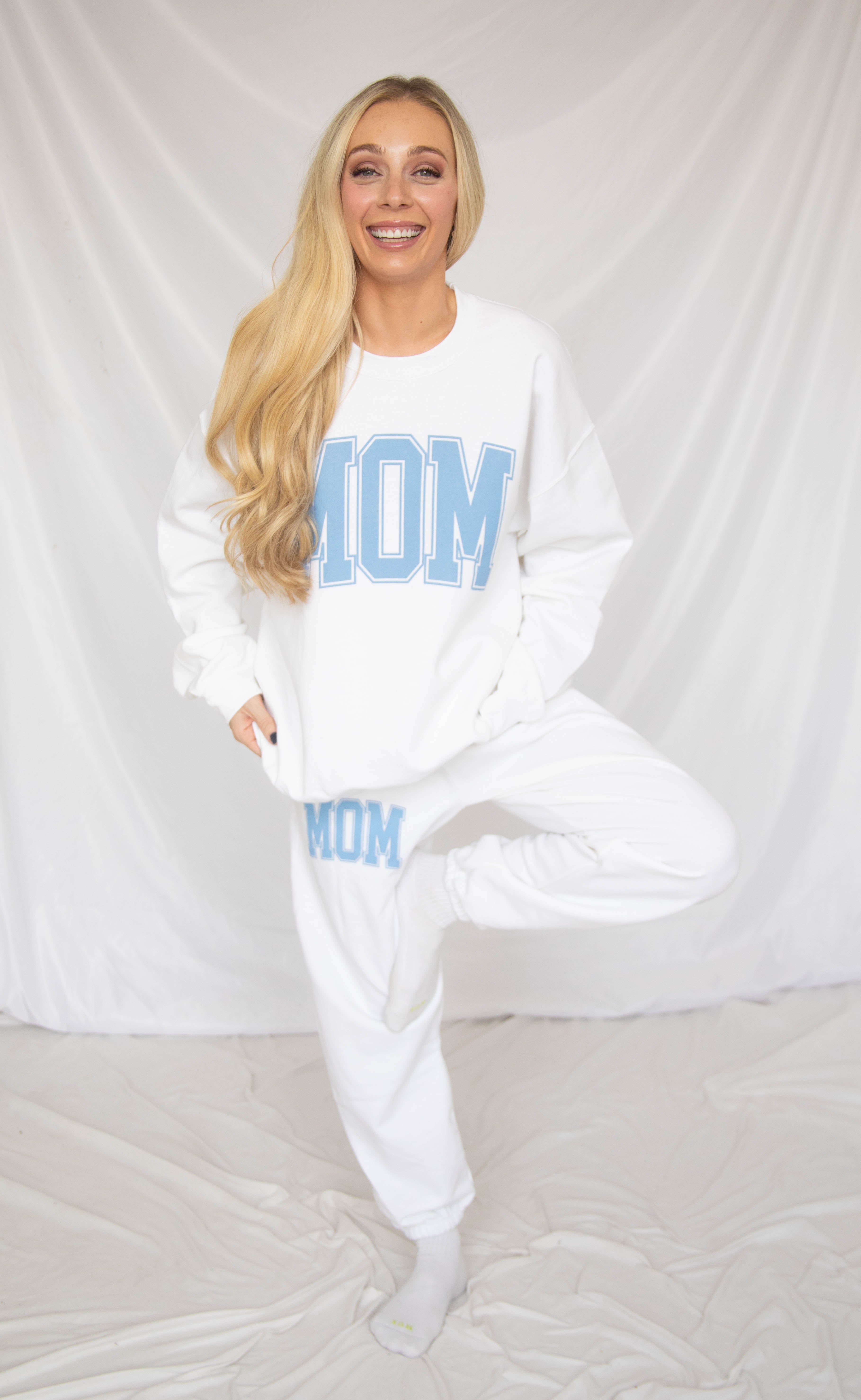 The classic mom uniform is back. These white sweatpants features a blue "mom" on the upper right thigh. Don't forget to pair with the matching sweatshirt for the ultimate comfy mom uniform.