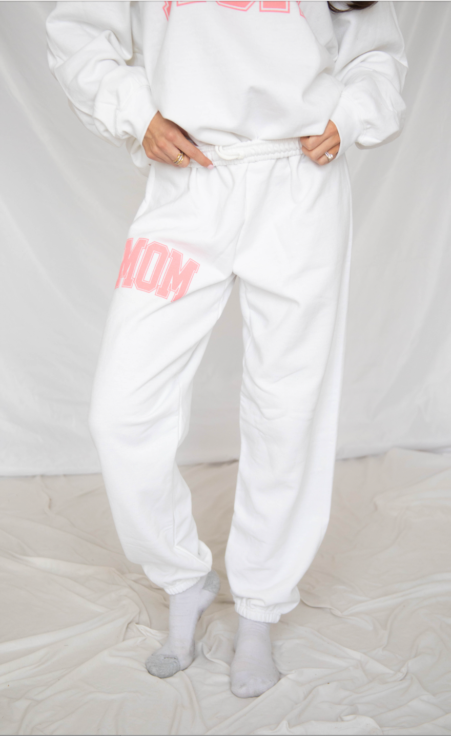The classic mom uniform is back. These white sweatpants features a pink "mom" on the upper right thigh. Don't forget to pair with the matching sweatshirt for the ultimate comfy mom uniform.