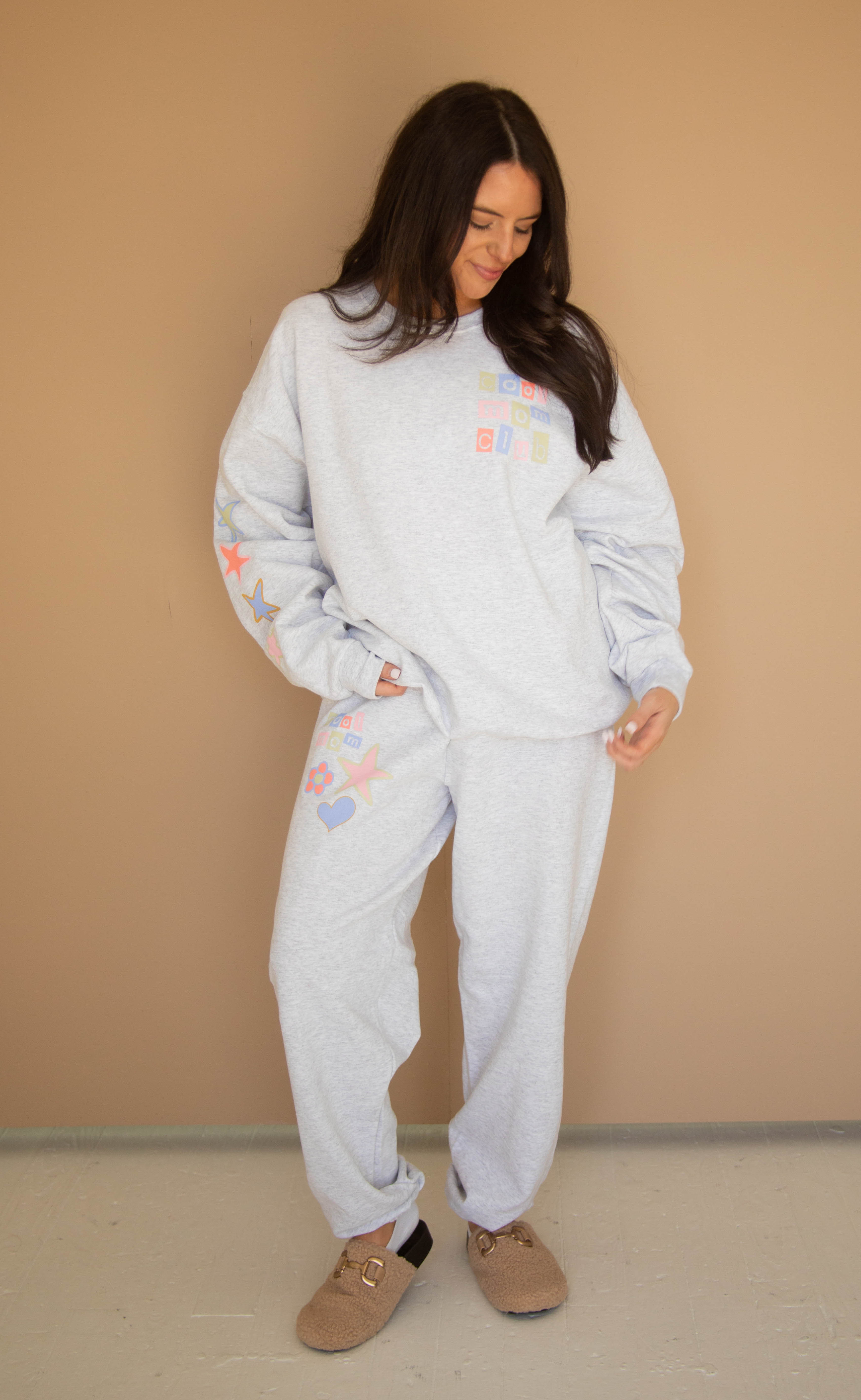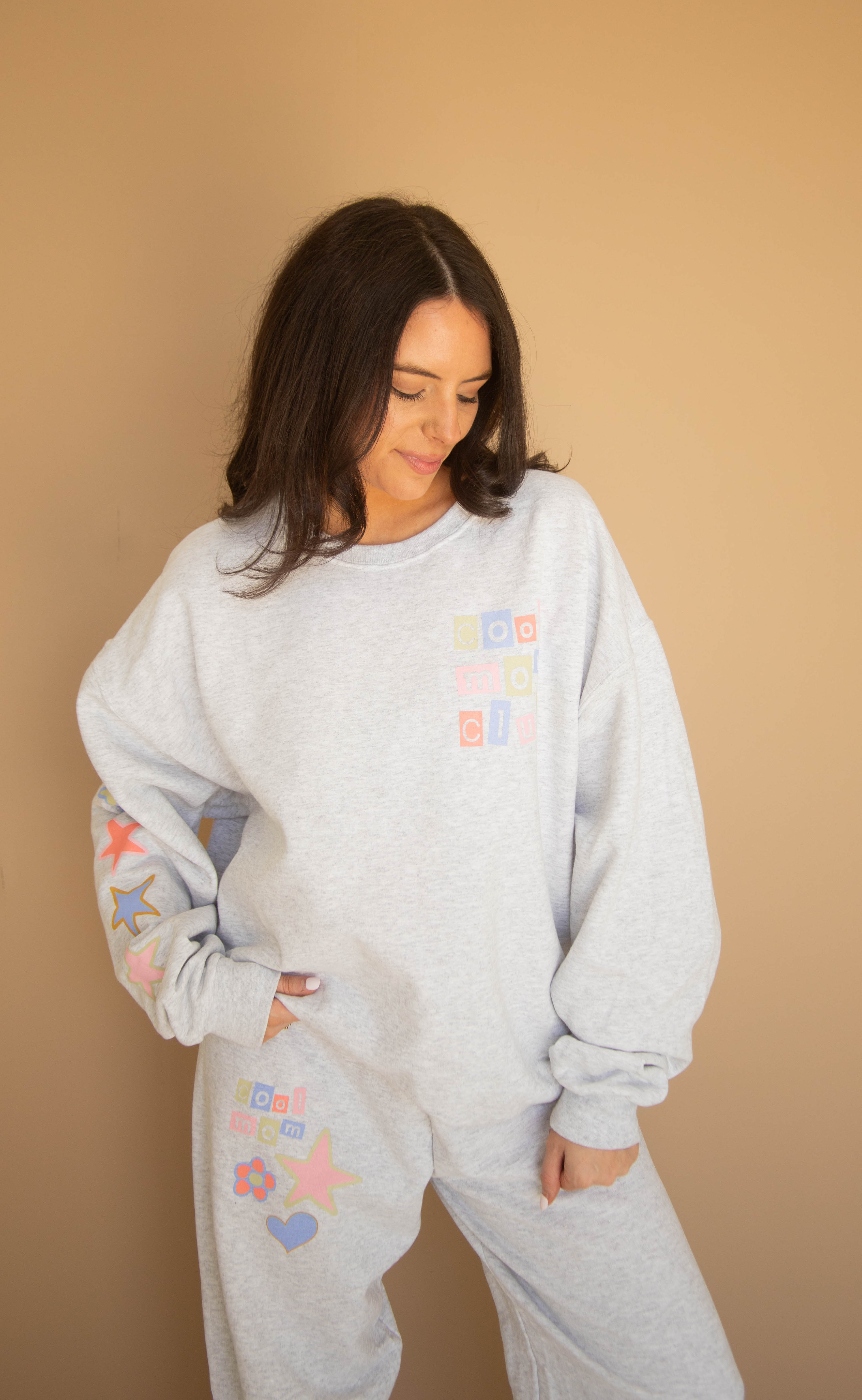 Our #1 best-seller is back and better than ever! This ash grey crewneck features our signature "Cool Mom Club" block graphic in a dreamy pastel palette. With a relaxed, oversized fit and playful star details trailing down the sleeve, it’s the ultimate uniform for school drop-offs, coffee runs, and everything in between. It’s not just a sweatshirt; it’s a membership to the best club there is.