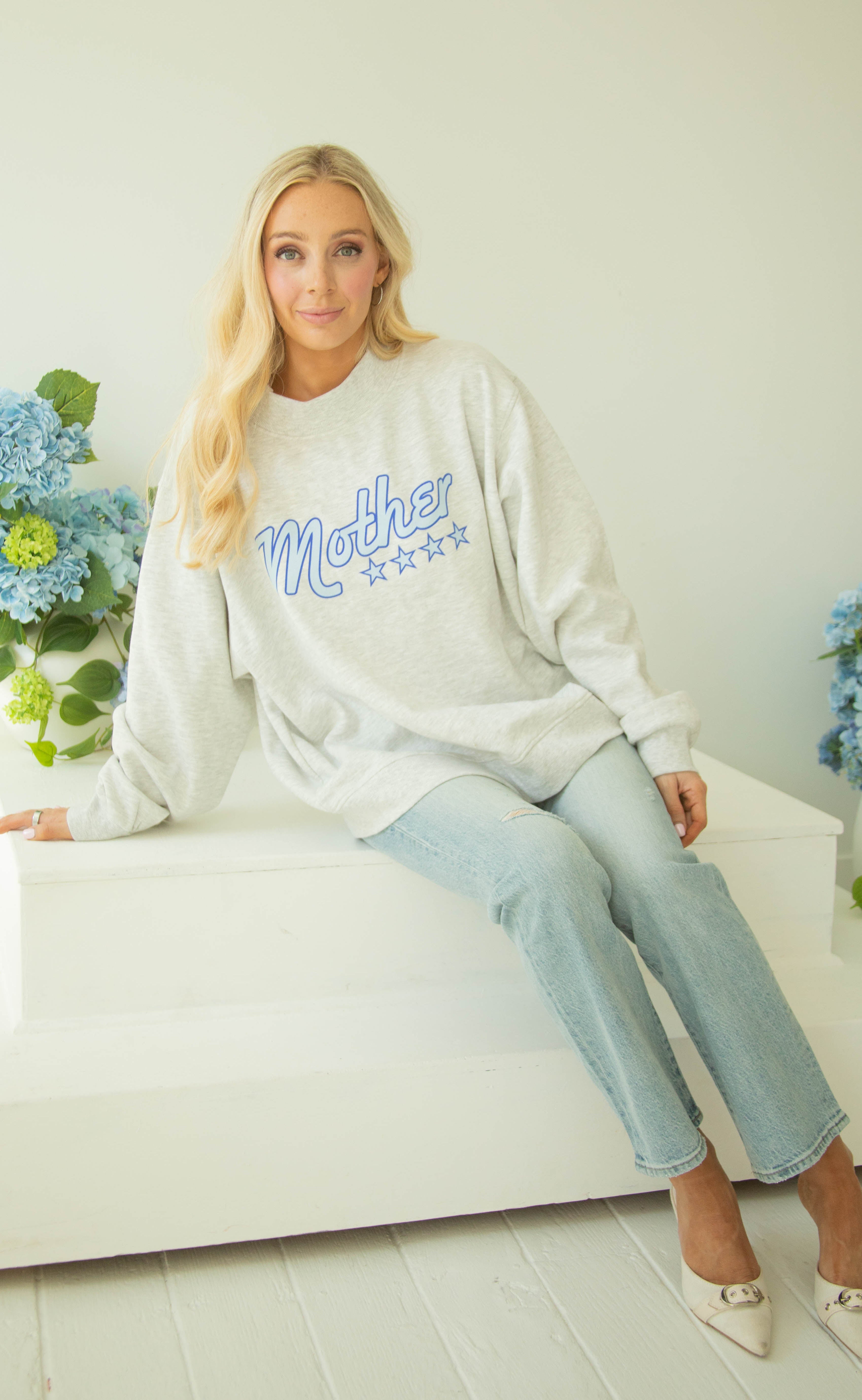 A timeless ash grey mock neck with a soft blue Mother script and star details that feel both chic and meaningful. It’s lightweight, cozy, and just oversized enough for that lived-in comfort you’ll reach for again and again. A perfect everyday piece you can style year-round.