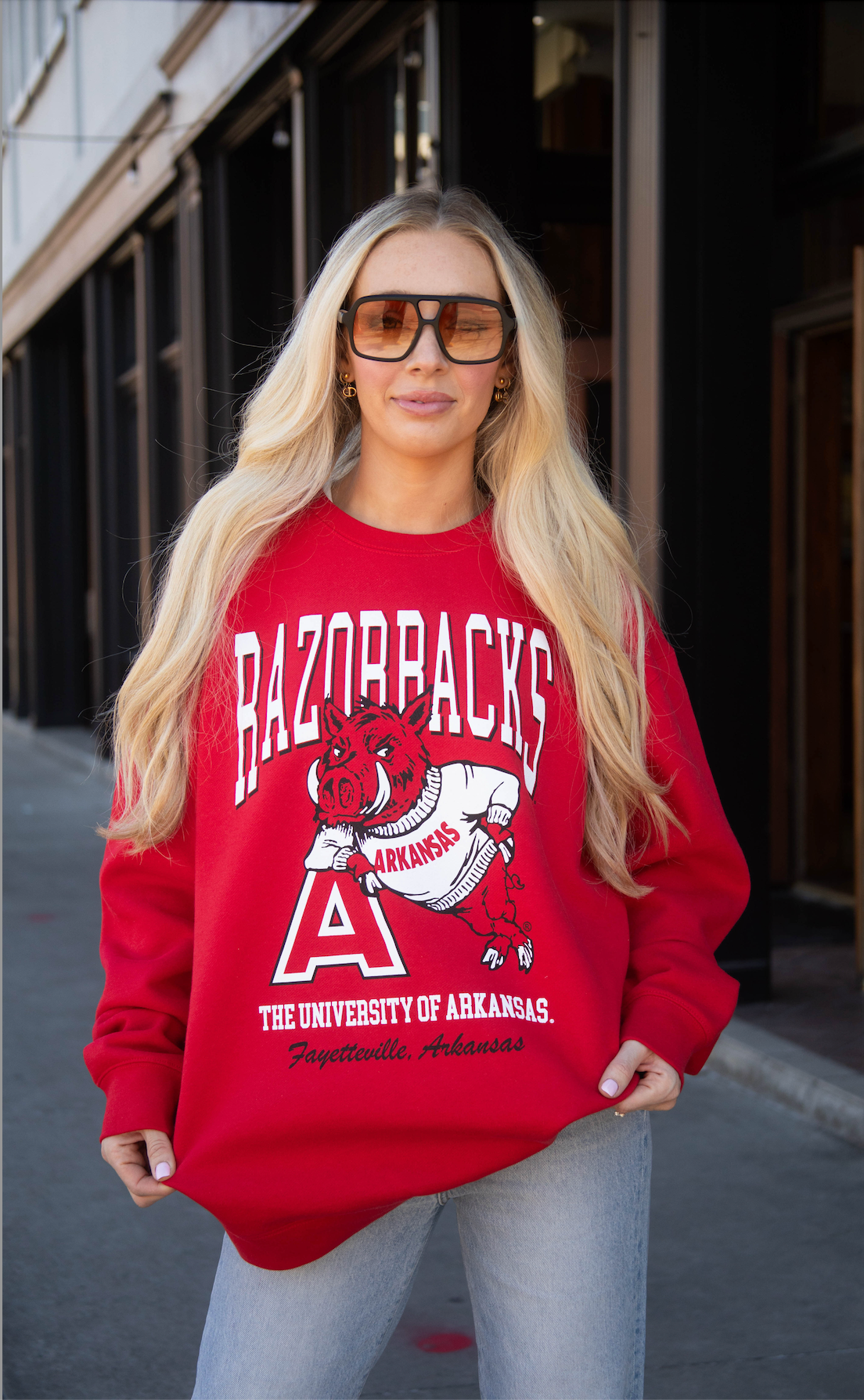 This vintage leaning Hog from the vault with big and bold lettering makes for the perfect sweatshirt for any Razorback fan! Get one for yourself and then gift it to a U of A student or any Razorback fan in your life.