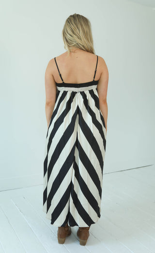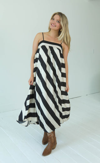 A RRHQ fave! The Chic Streak Maxi Dress is a stunning black and ivory striped silky maxi dress with delicate adjustable straps. We love the asymmetrical stripe pattern and the elegance meets simplicity design.