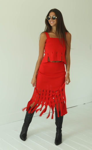 The Fringe Please set in bright red features a lightweight two-piece design perfect for making a bold statement. The cropped tank showcases a square neckline and trendy cut-out fringe details, while the matching midi skirt offers a pull-on fit with coordinating fringe accents.
