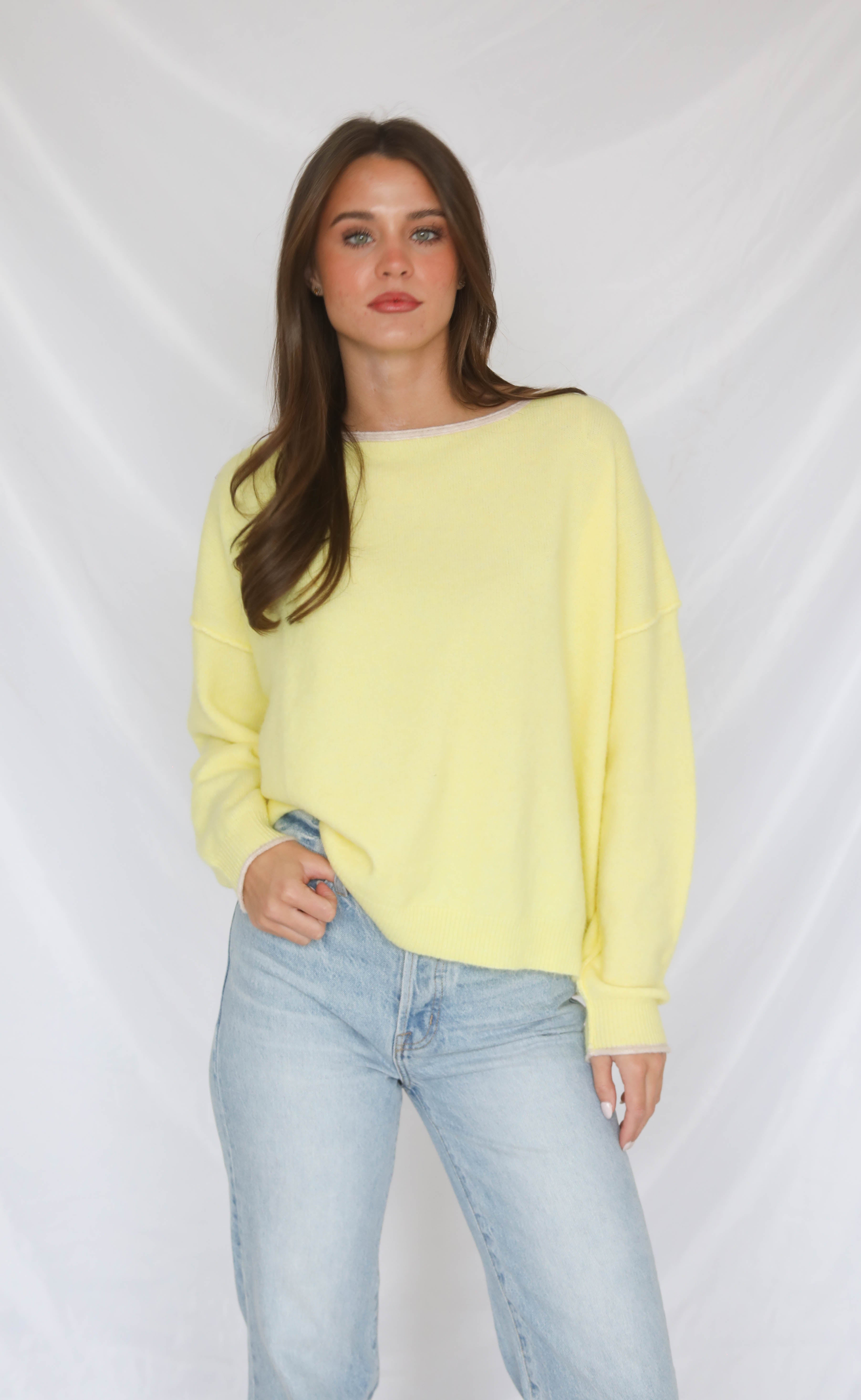 This lightweight, super-soft sweater is all about easygoing style. The boat neckline, relaxed drop shoulders, and boxy oversized fit make it effortlessly chic, while the subtle rolled hems add a polished, casual finish. Perfect for layering or wearing on its own, it’s a cozy staple you’ll reach for again and again.