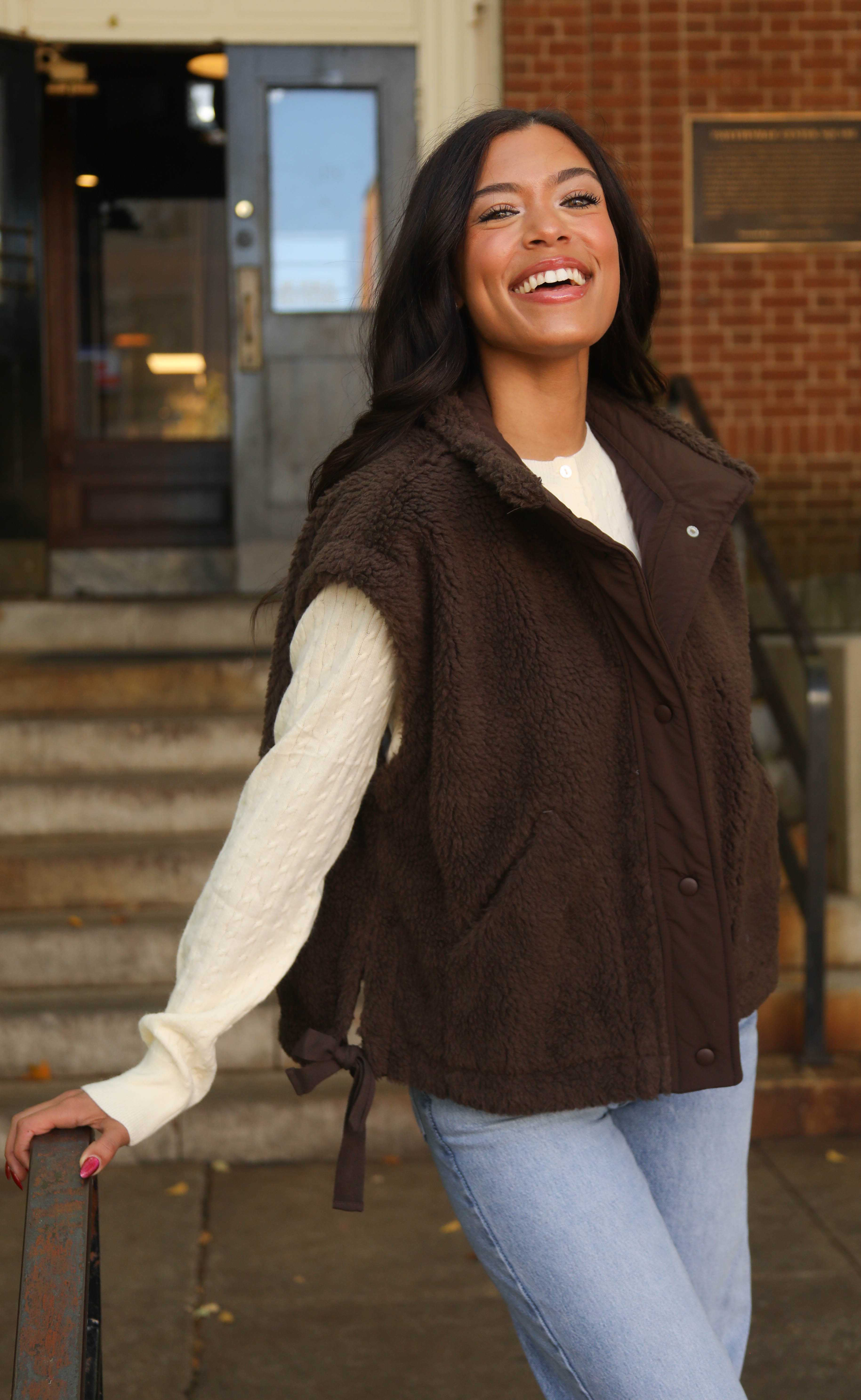This chocolate brown sherpa vest features an oversized collar, snap-front closure, functional pockets, and feminine side tie details for a flattering fit. Perfect for adding warmth and texture to fall outfits.