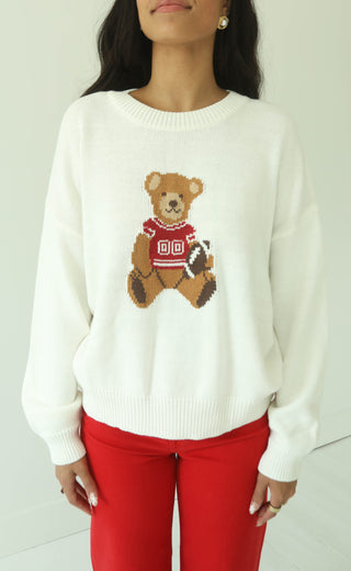 The Quarterbear Cutie long sleeve sweater is a cozy white crewneck with long sleeves and relaxed drop shoulders. A playful football player teddy bear knit on the chest adds a unique, trendy touch, blending comfort with charming, sporty style for everyday wear.