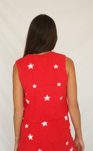 Be the star of the tailgate in the Super Star Knit Set. This two piece sweater set features a n-neck, sleeveless boxy top and pull on skirt in a bright red with embroidered white stars.