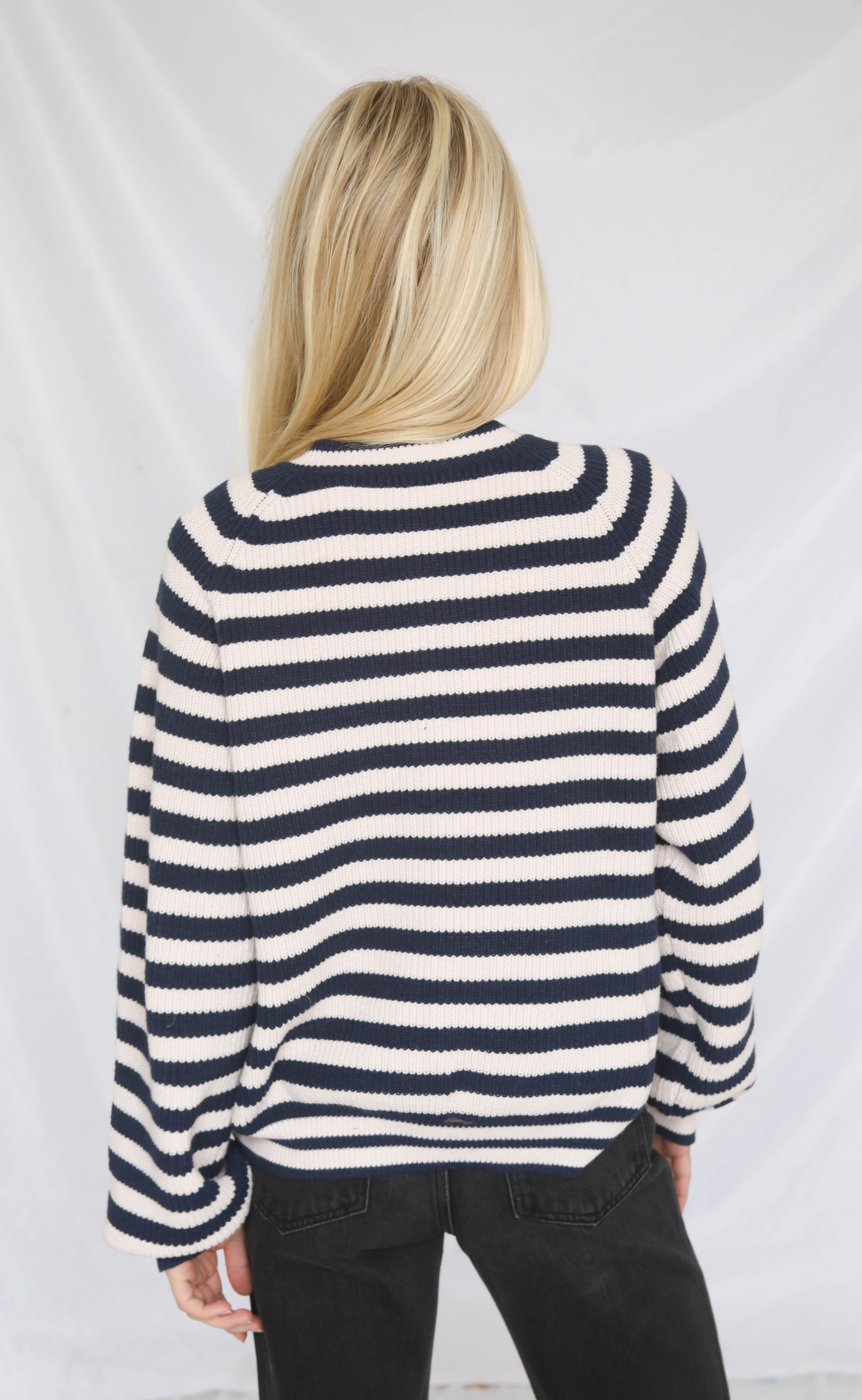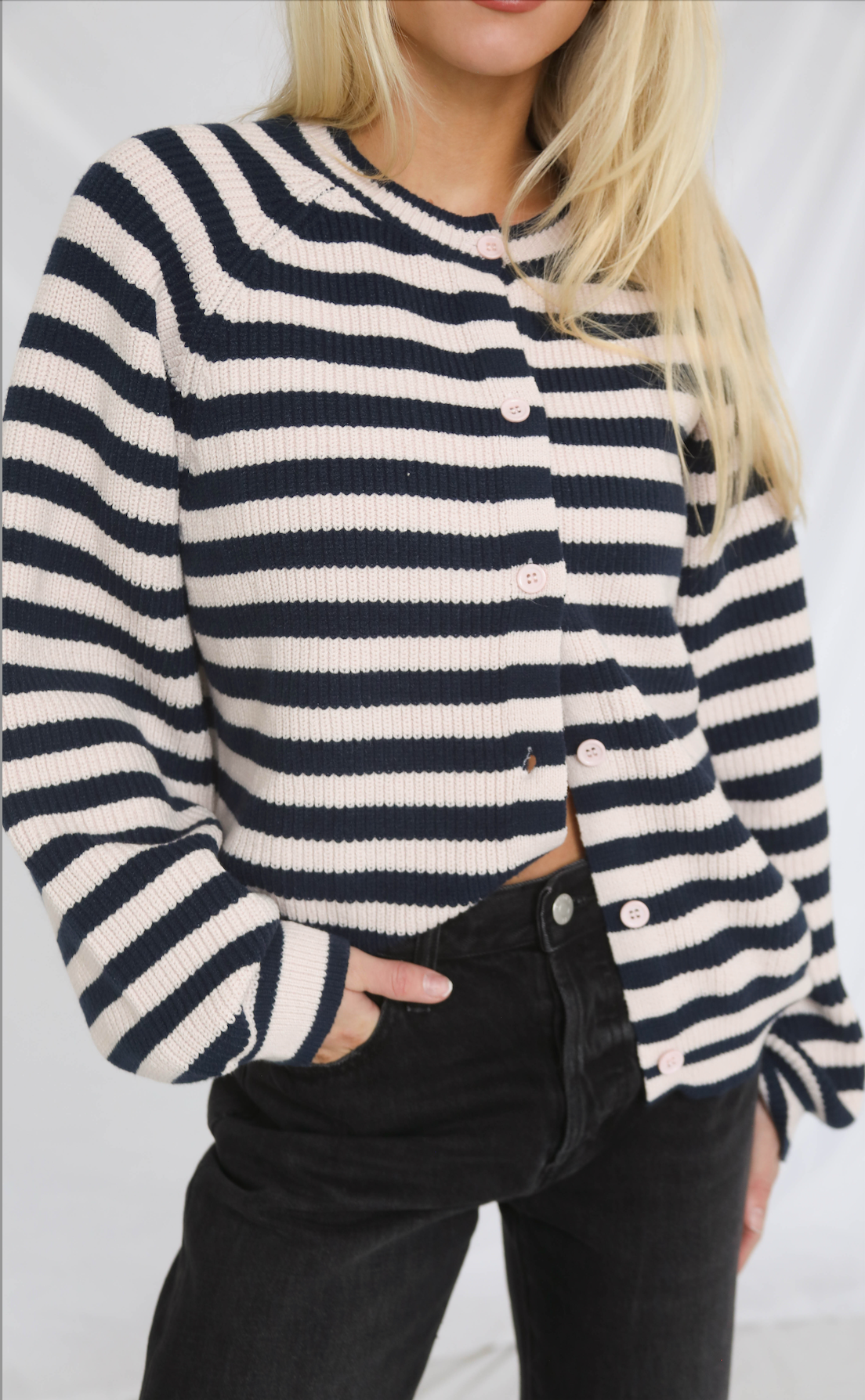This navy and light pink striped cardigan is cozy with a touch of playful color. Its relaxed fit and soft knit make it perfect for layering over tees or dresses, while the classic stripes add a timeless, versatile vibe you’ll reach for again and again.