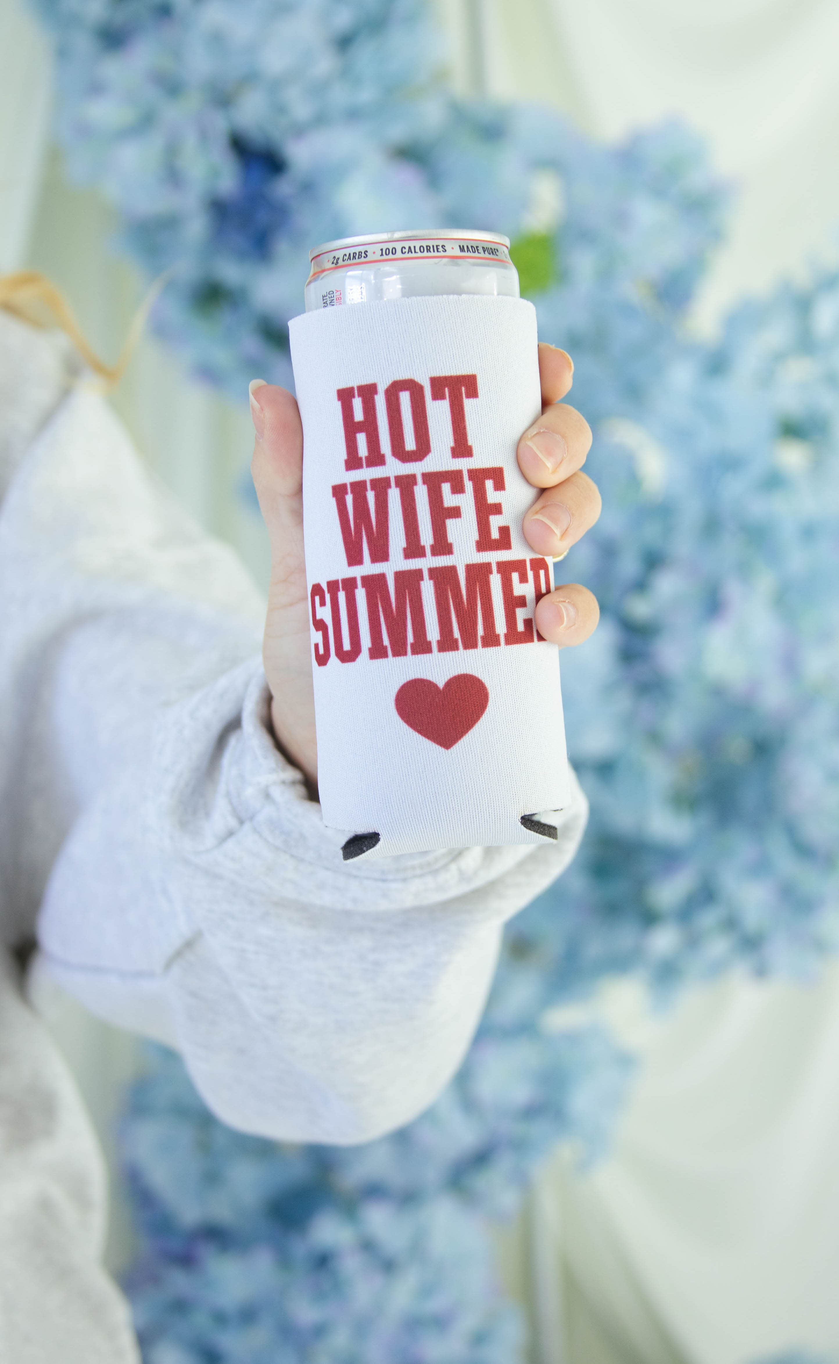 Keep your drinks cold with the ultimate waterside accessory. This crisp white slim can sleeve features a bold "HOT WIFE SUMMER" block text in a vibrant cherry red, finished with a matching heart for that perfect pop of color. Whether you’re celebrating at your bachelorette party or lounging on your honeymoon, it’s the essential sidekick for every iced coffee or seltzer.