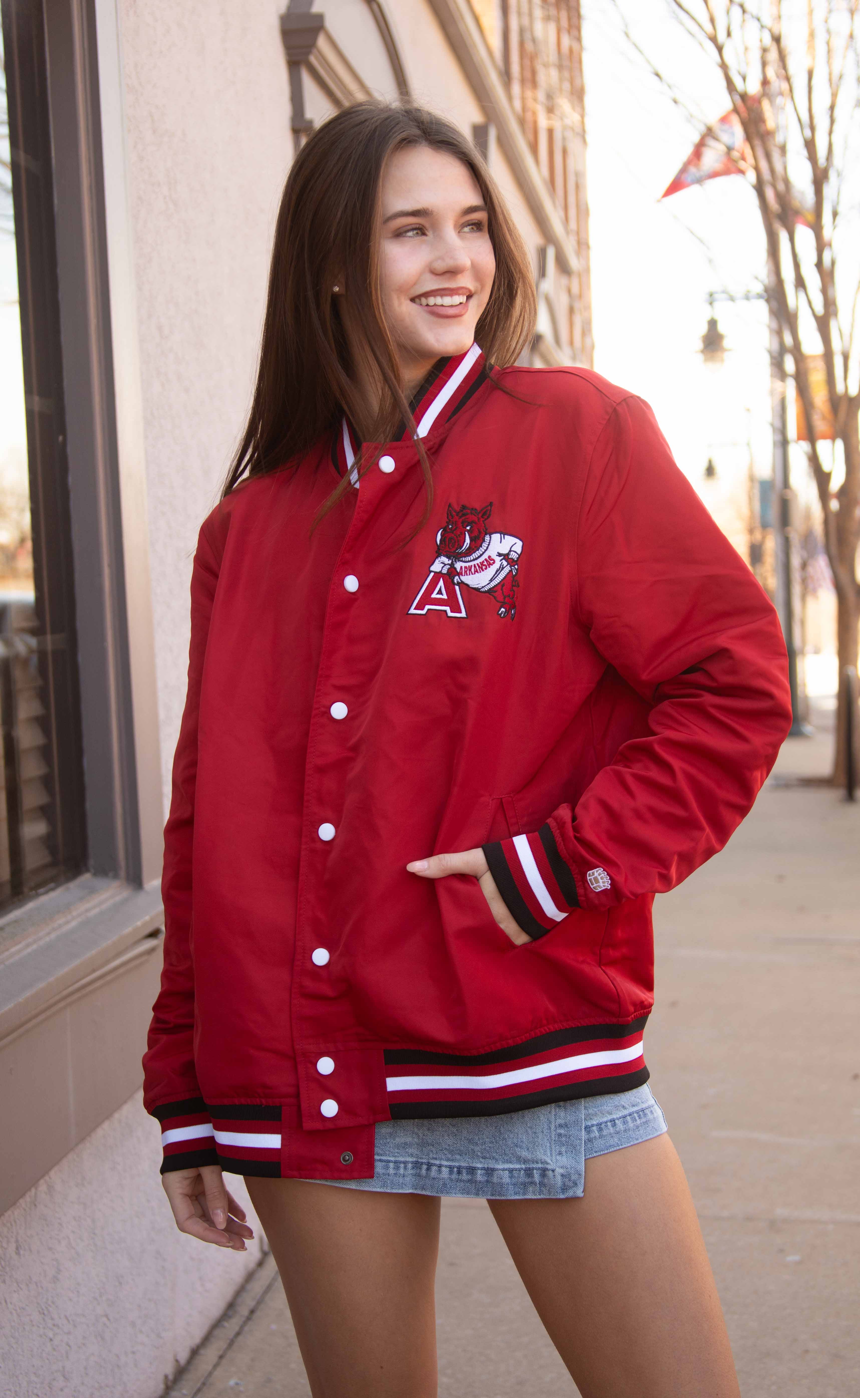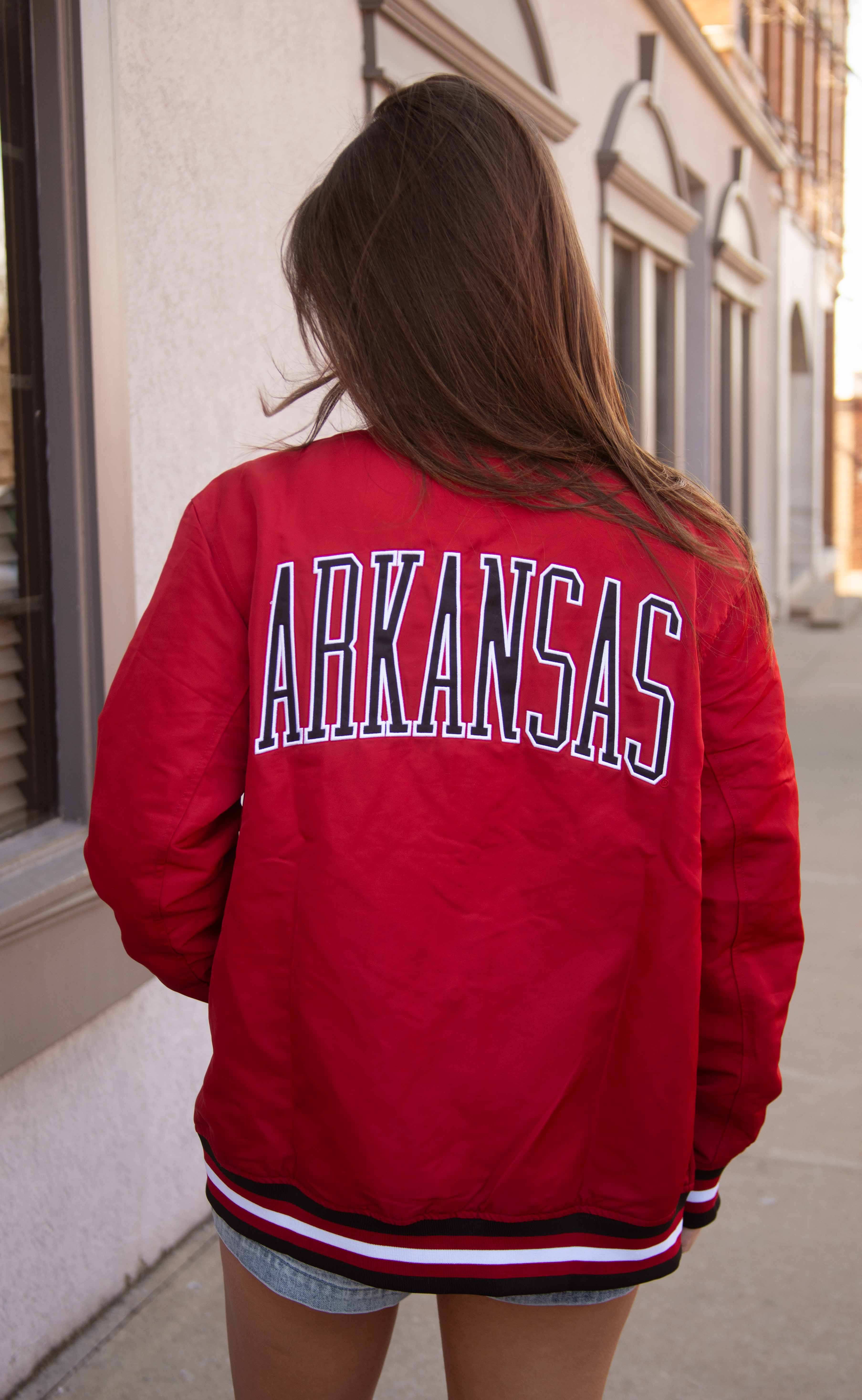 Another vintage inspired varsity jacket you're sure to love! This red vintage varsity jacket features red and black striped hem, cuff and collar, "ARKANSAS" across the back and your favorite leaning hog on the front chest! It's the final (most essential) piece to your gameday outfit!