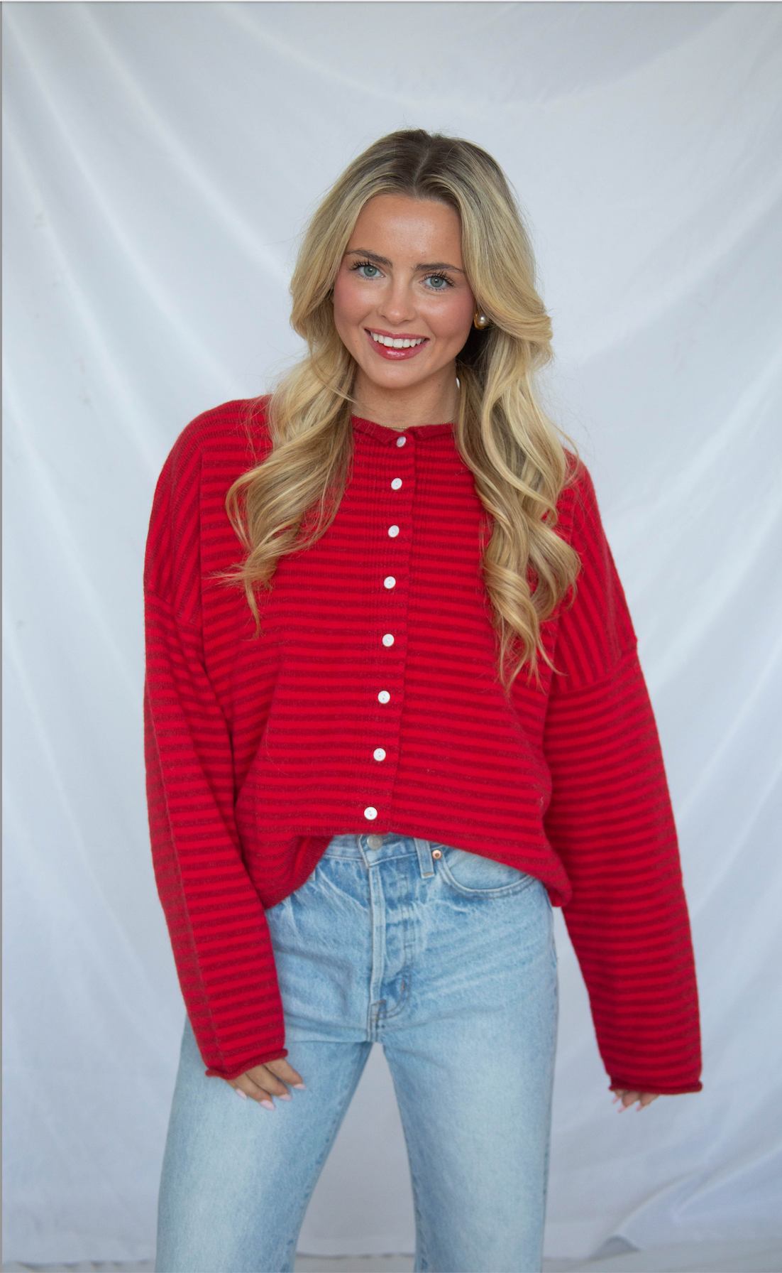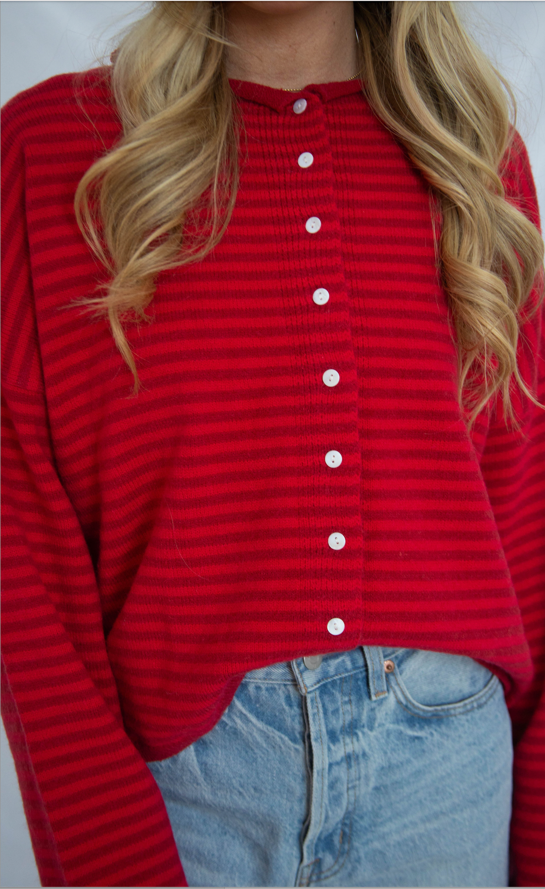 This midweight button-front cardigan features relaxed drop shoulders, long sleeves, and soft rolled hems for an effortless, lived-in feel. Designed in bold deep fuchsia and red stripes, it makes a cozy statement while staying easy to wear.