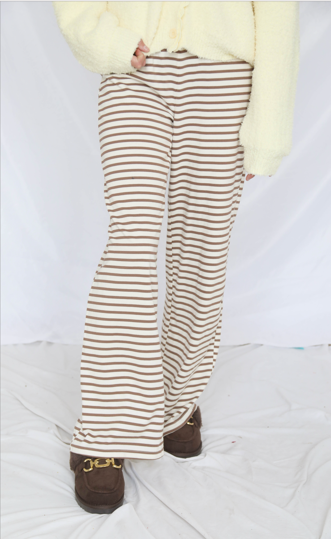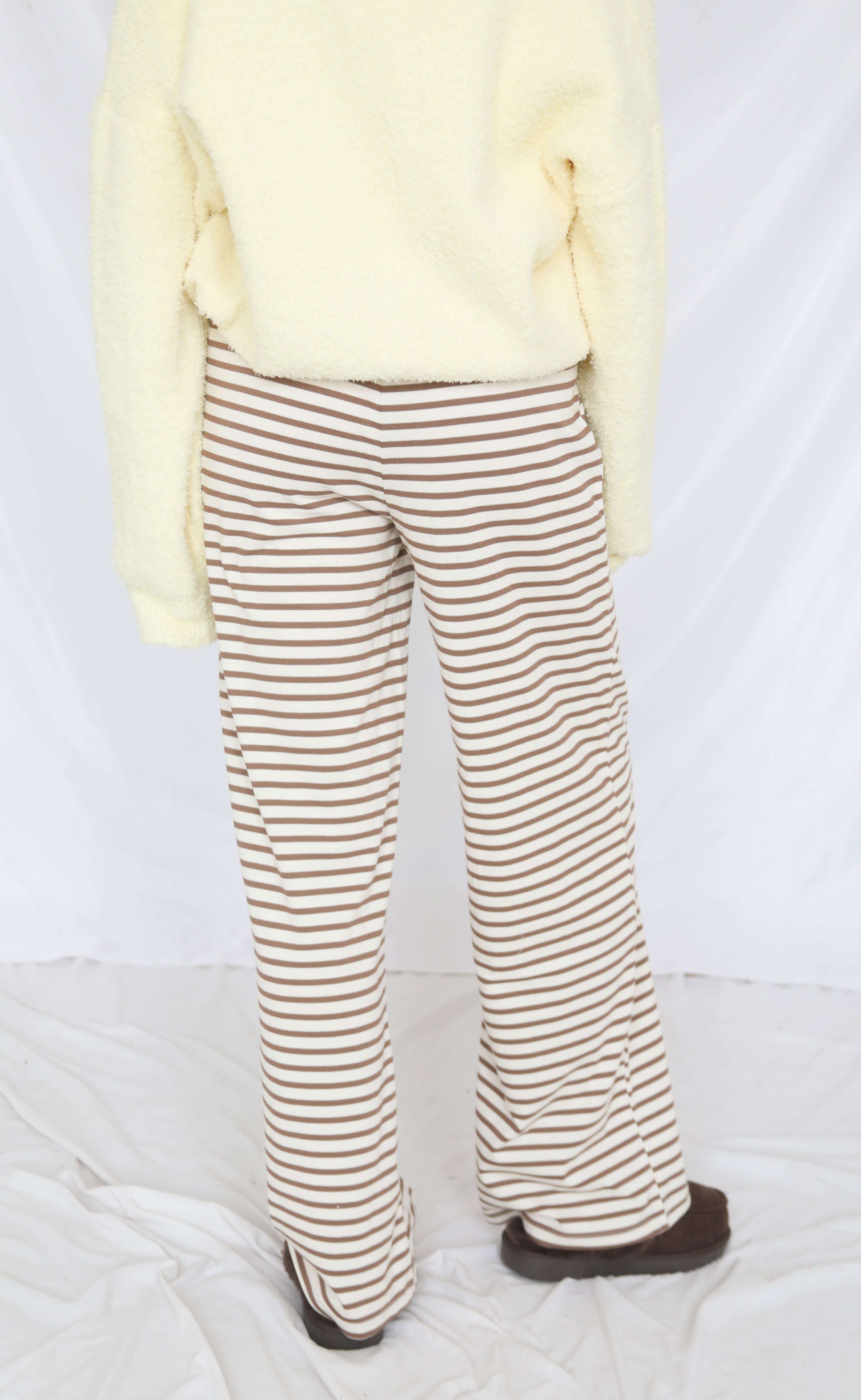 These pull-on wide leg pants bring an easy, elevated feel with their cream and brown stripe pattern. The lightweight drape and elastic waist make them effortless for everyday wear, while the wide leg silhouette keeps things polished and comfy. Pair them with a simple tee, an oversized sweater, or the matching stripes for a look that feels cool without trying.