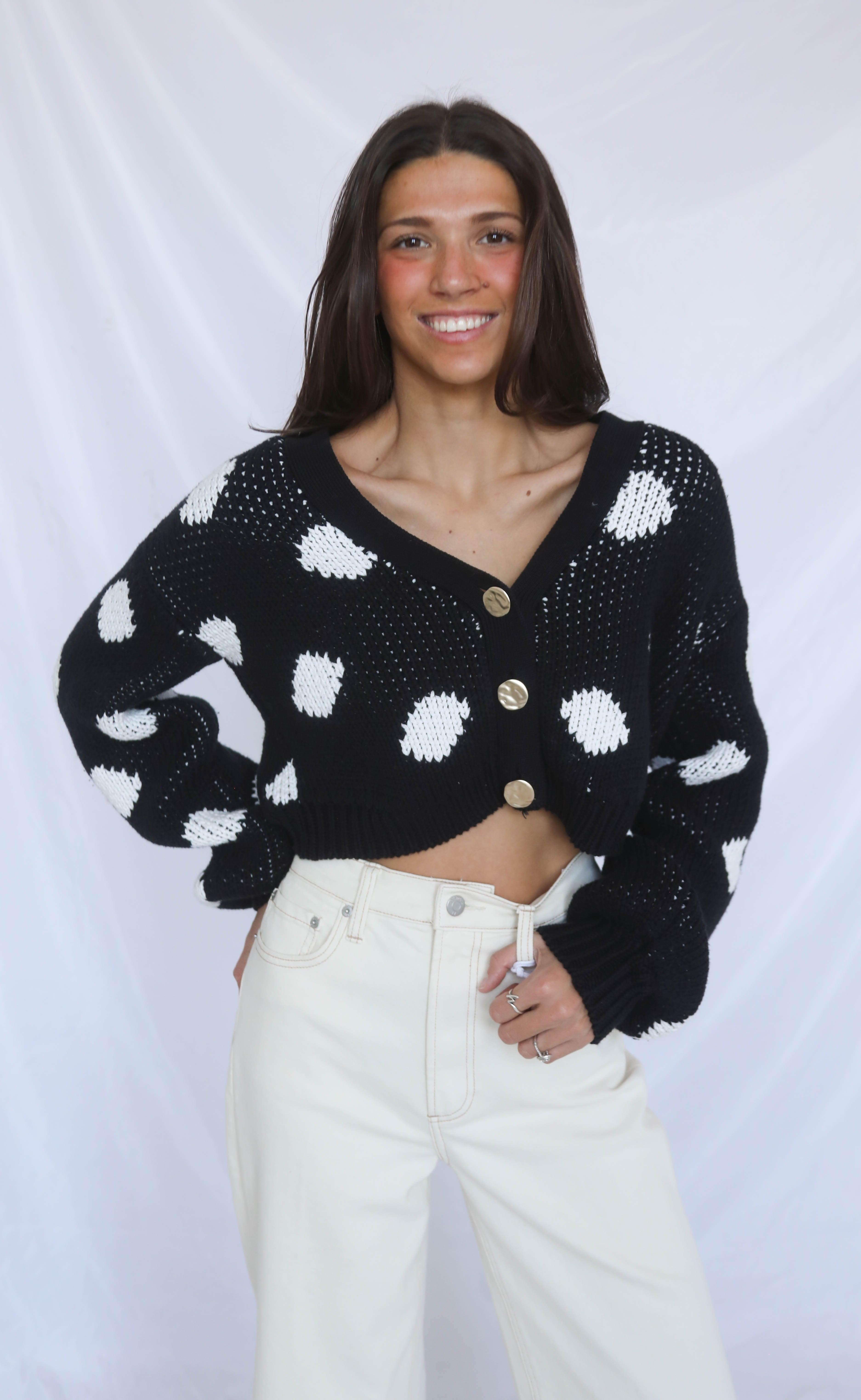 Cozy up in the effortless Clemmie Cardi. This black and white polka dot cardigan has a v neckline, oversized buttons, bishop sleeves and the perfect cropped fit. Wear on it's own or wear her open over your favorite tee!