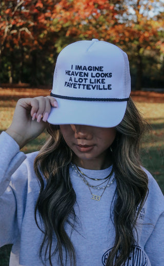 We imagine heaven looks a lot like Farmer's Market Saturday mornings, Dickson Street weekends and shopping on Block Street. It's basically Fayetteville. This white rope trucker features a contrasting black, block font.