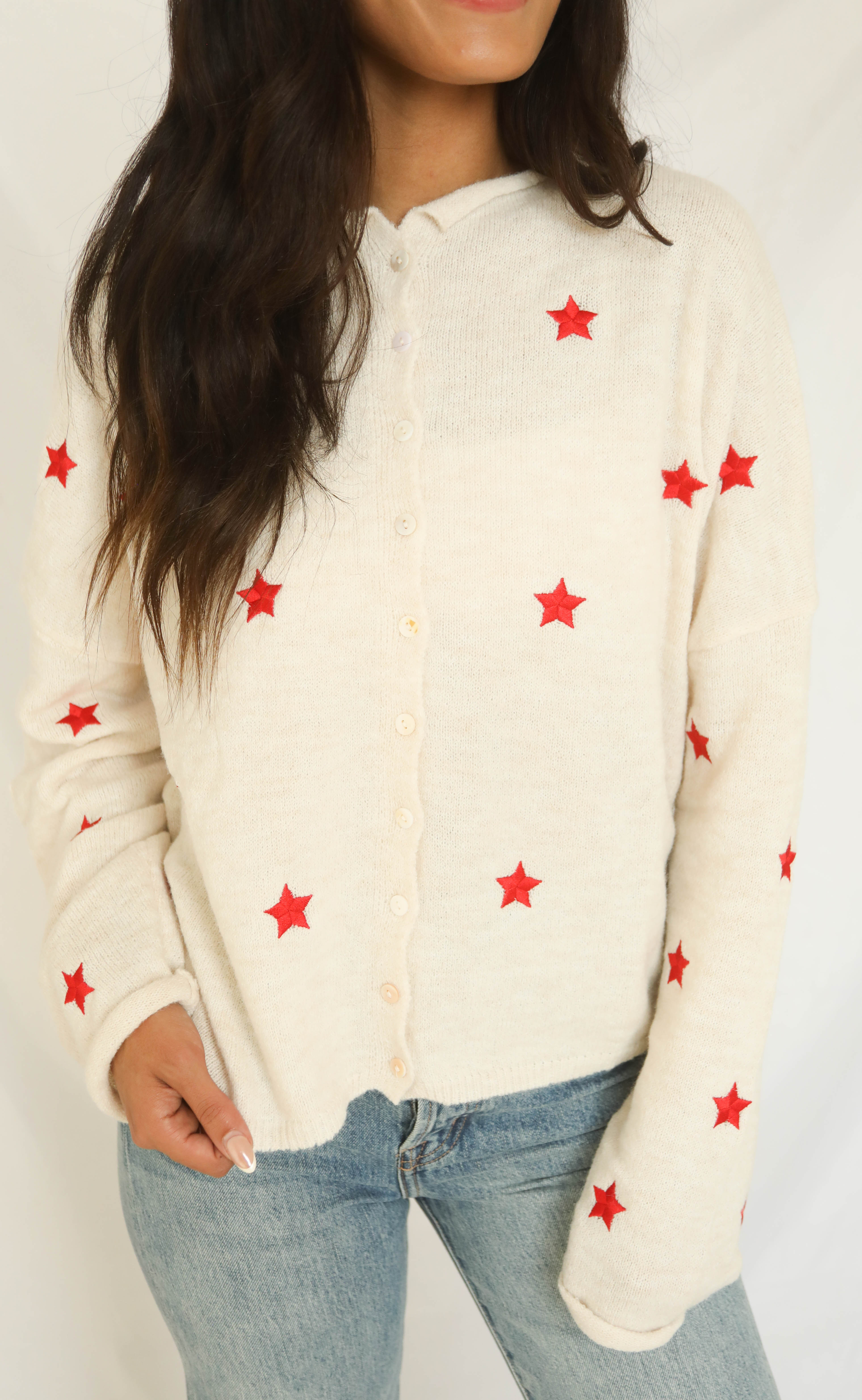 Our best-selling Beat of Your Heart Cardigan is back and better than ever. This ultra-soft, boxy cardigan features a relaxed drop-shoulder fit, button-front closure, and red embroidered stars scattered across a creamy knit. Cozy meets cool - it’s the effortless layer your fall wardrobe’s been waiting for.