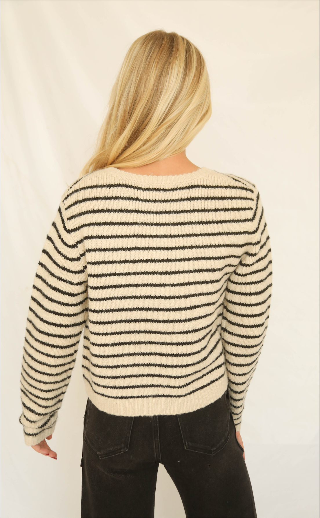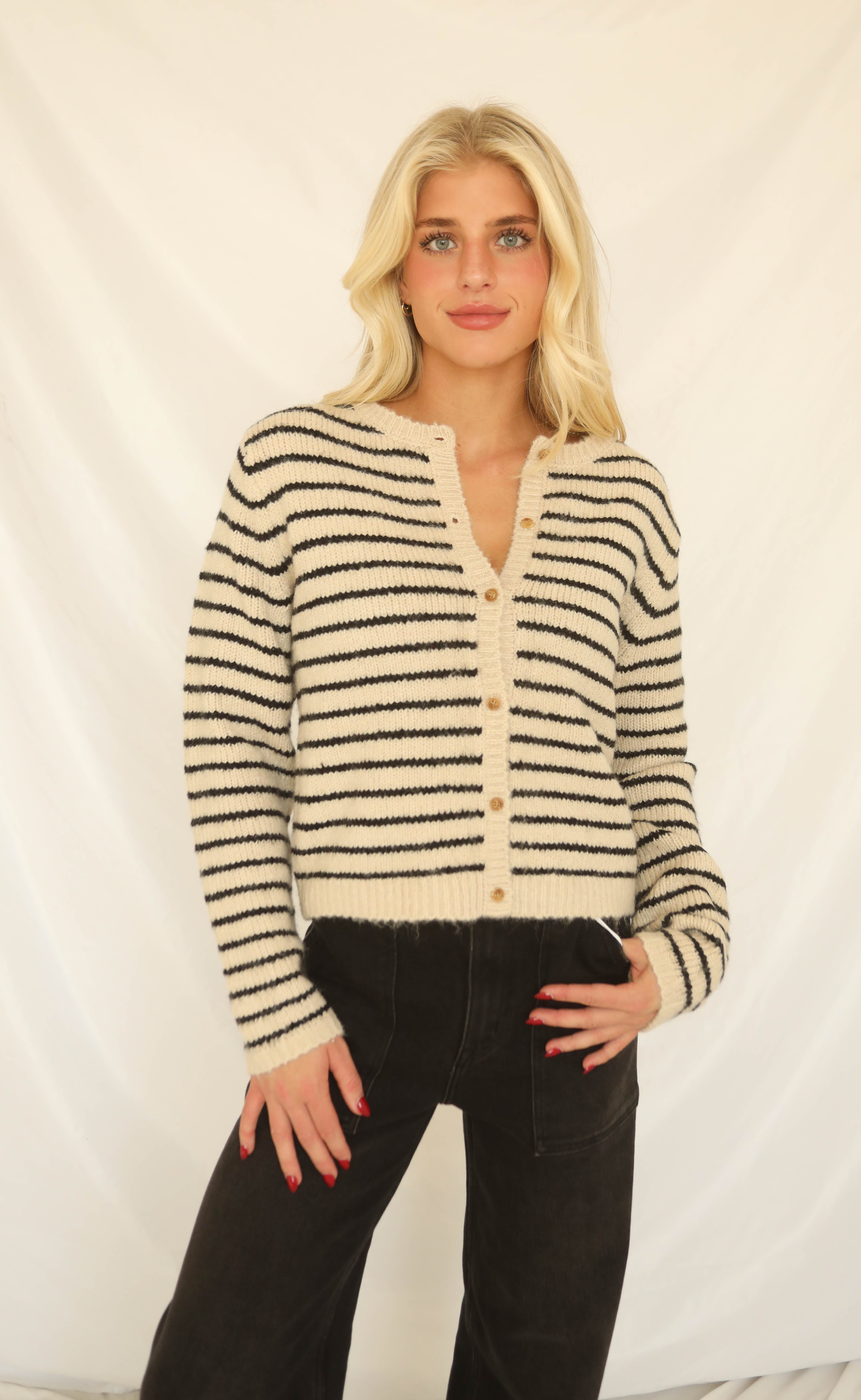 Effortless style meets everyday comfort in this dark taupe and black striped knit cardigan. Featuring long sleeves, a subtle boxy fit, and a delicate button-front closure, it’s the perfect layer for fall. Pair it with jeans, skirts, or dresses for a versatile, polished look.