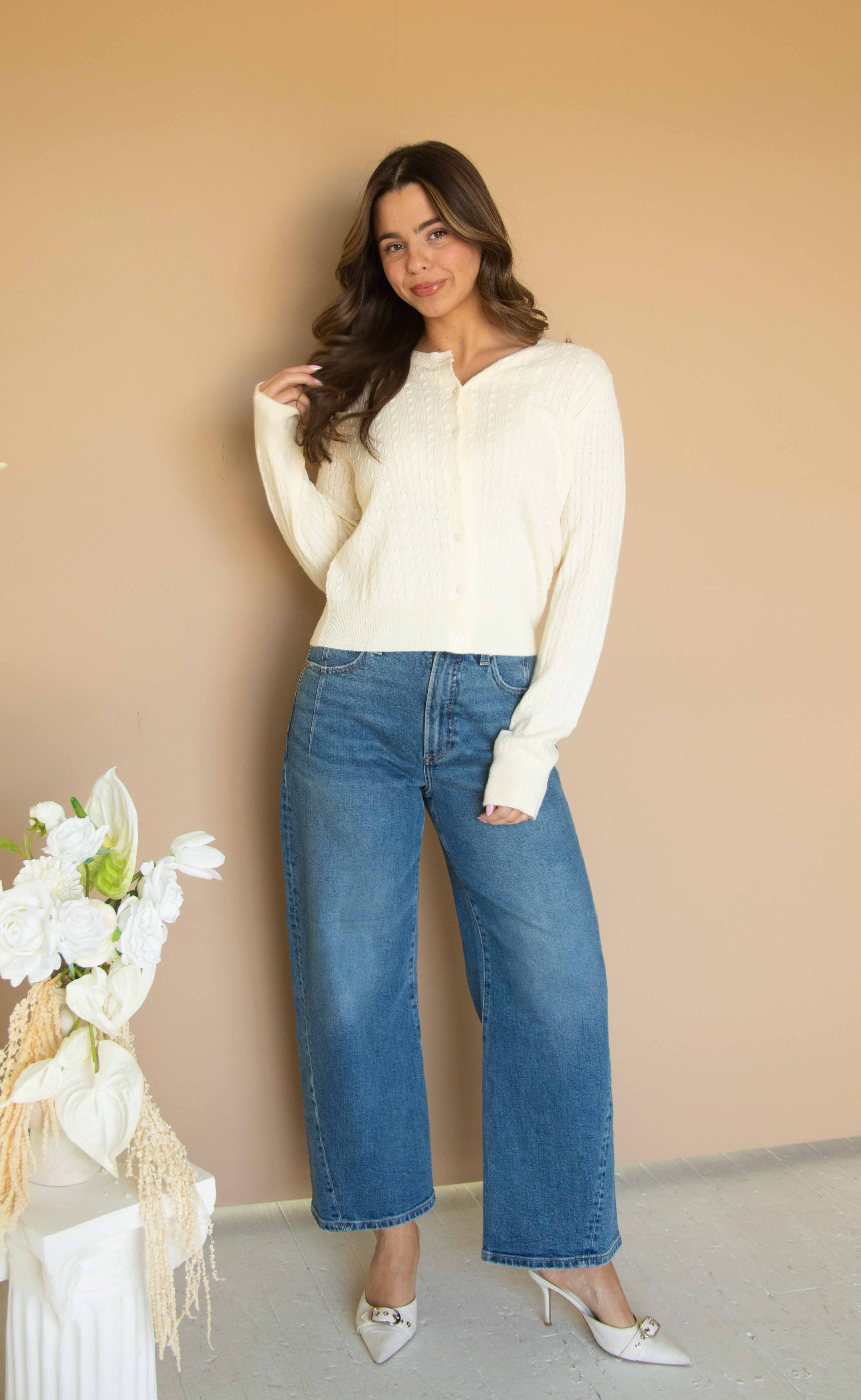 Lightweight, cozy, and classic. This cream-colored cable knit button-front cardigan offers timeless style with a soft, breathable feel. Perfect for layering over tees, blouses, or dresses for crisp fall days and effortlessly chic seasonal outfits.