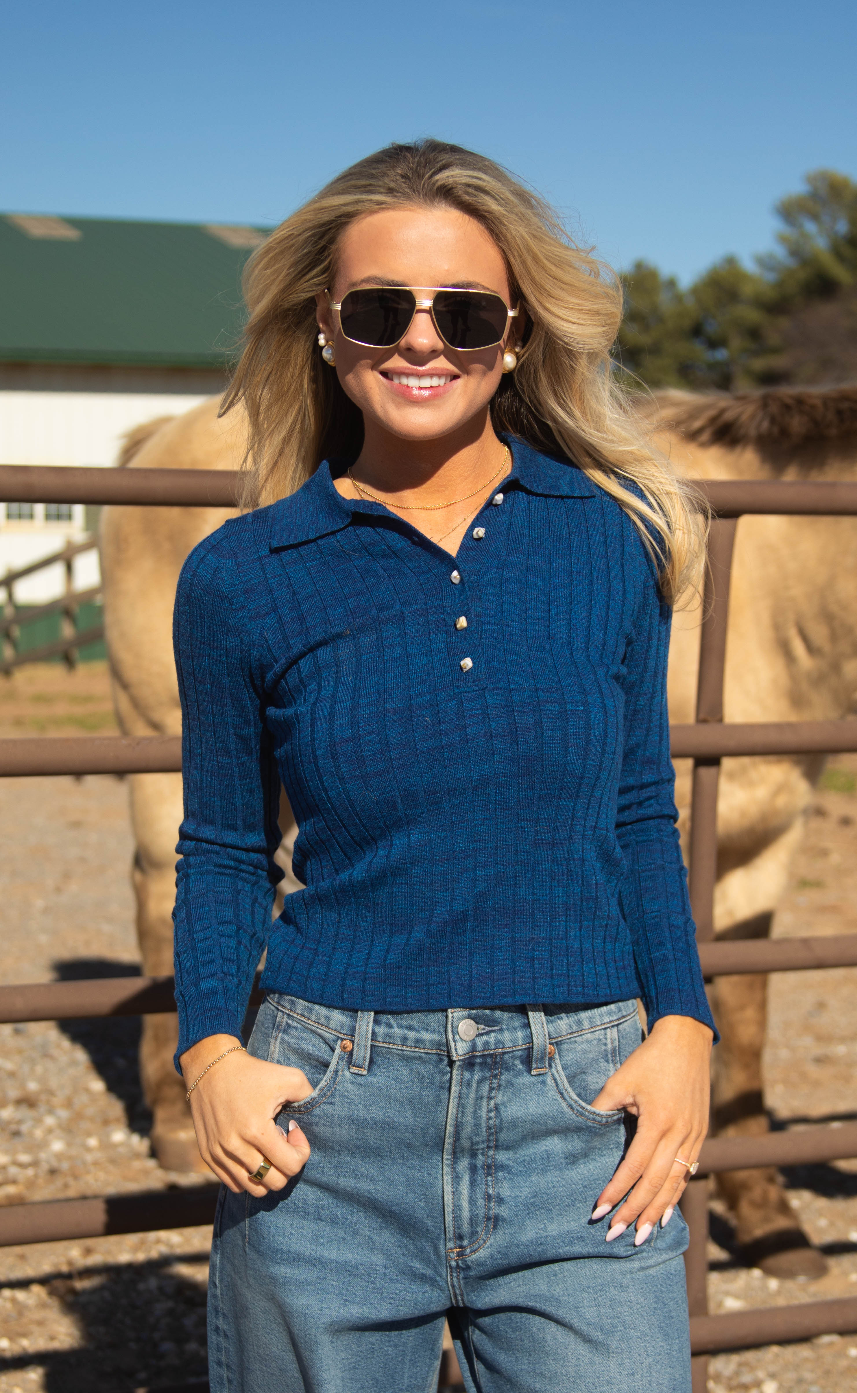 The Burning Blue Ribbed Top features a fitted silhouette in a vibrant blue, with a classic collar and long sleeves that balance comfort and style. Button details add a playful touch, making this piece a trendy staple that’s easy to dress up or down.