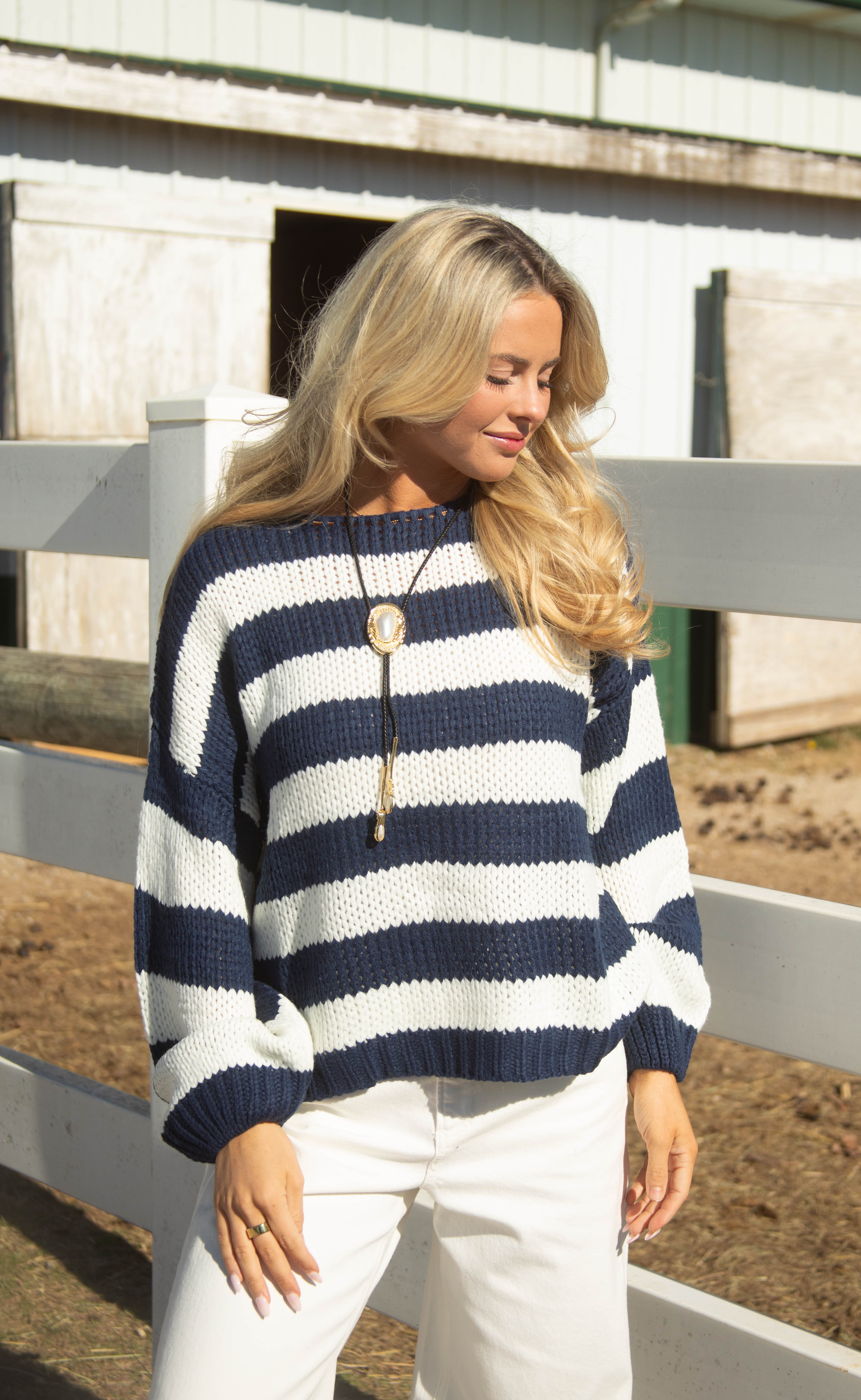 This breezy, chunky knit sweater blends cozy texture with effortless style. Designed with an oversized neckline, relaxed drop shoulders, and a boxy fit, it drapes beautifully for an easy, laid-back look. The navy and white stripes add a classic touch with a modern, playful vibe.