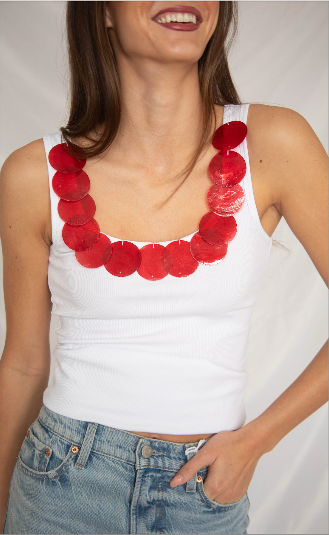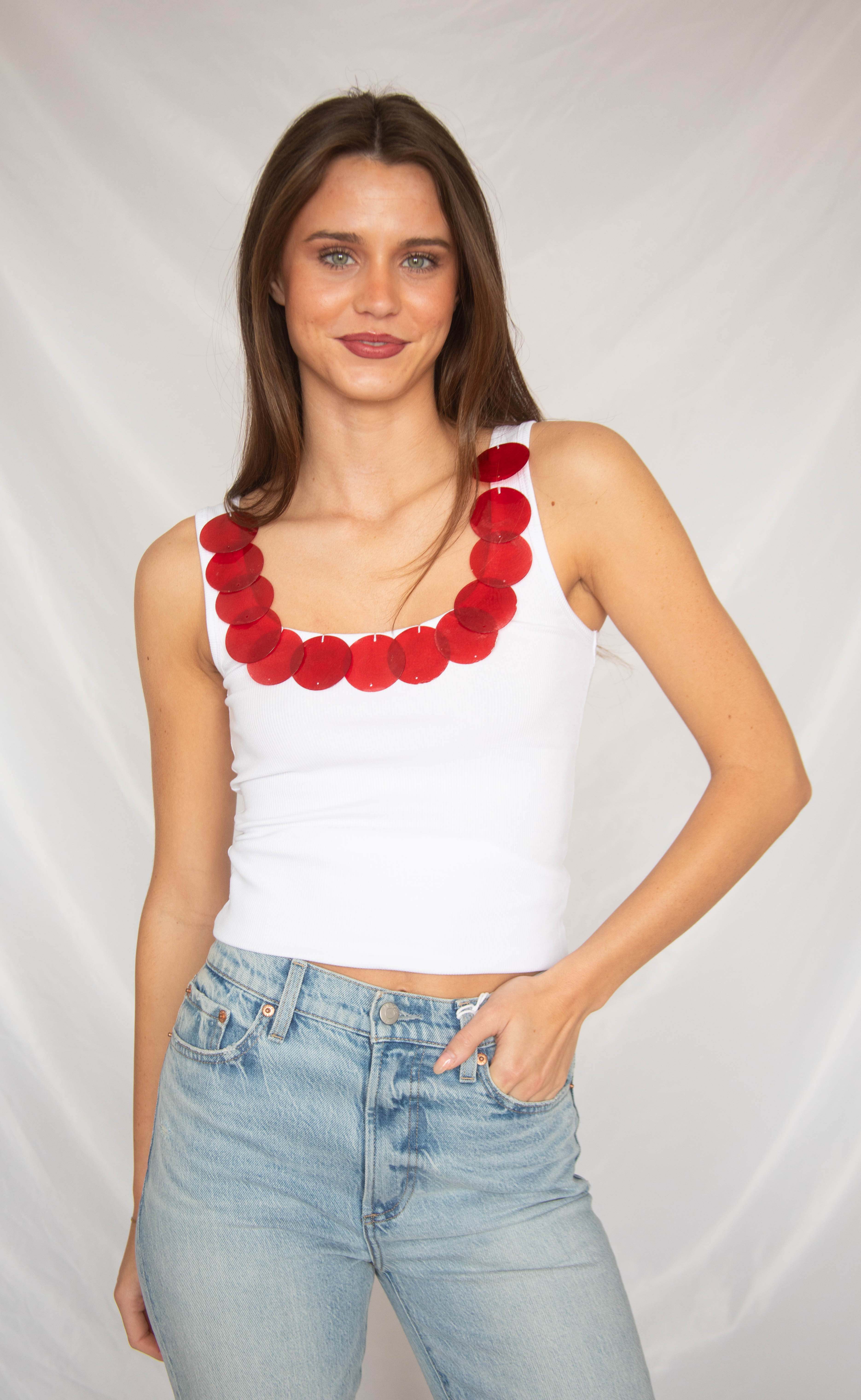 Elevate your gameday essentials with this unique white ribbed tank, featuring a striking scoop neckline. The piece is meticulously detailed with vibrant red shells, each individually hand-sewn to create a bold look. Combining the casual comfort of soft cotton-rib with an artisanal coastal flair, it’s the perfect statement top for sun-drenched days.