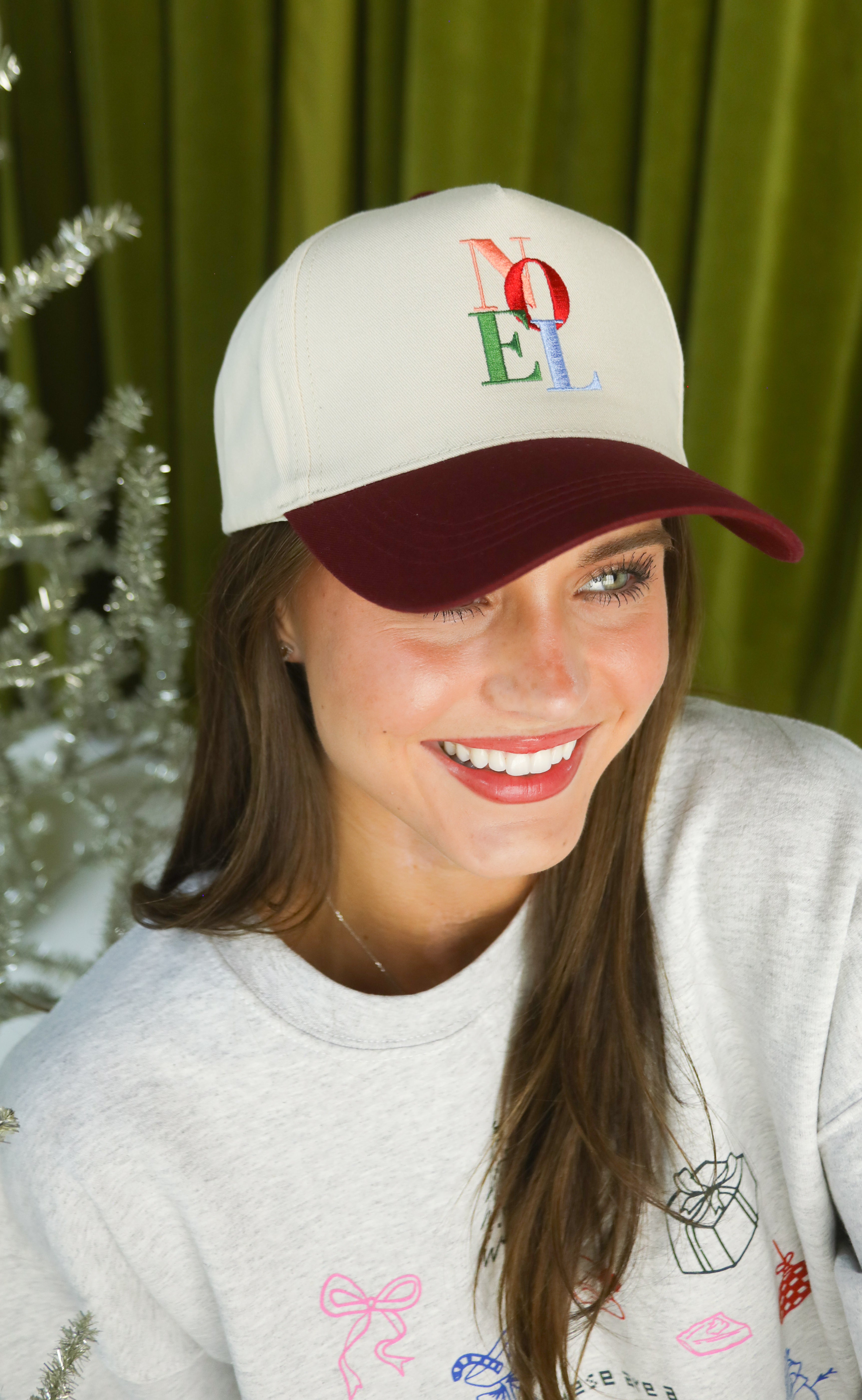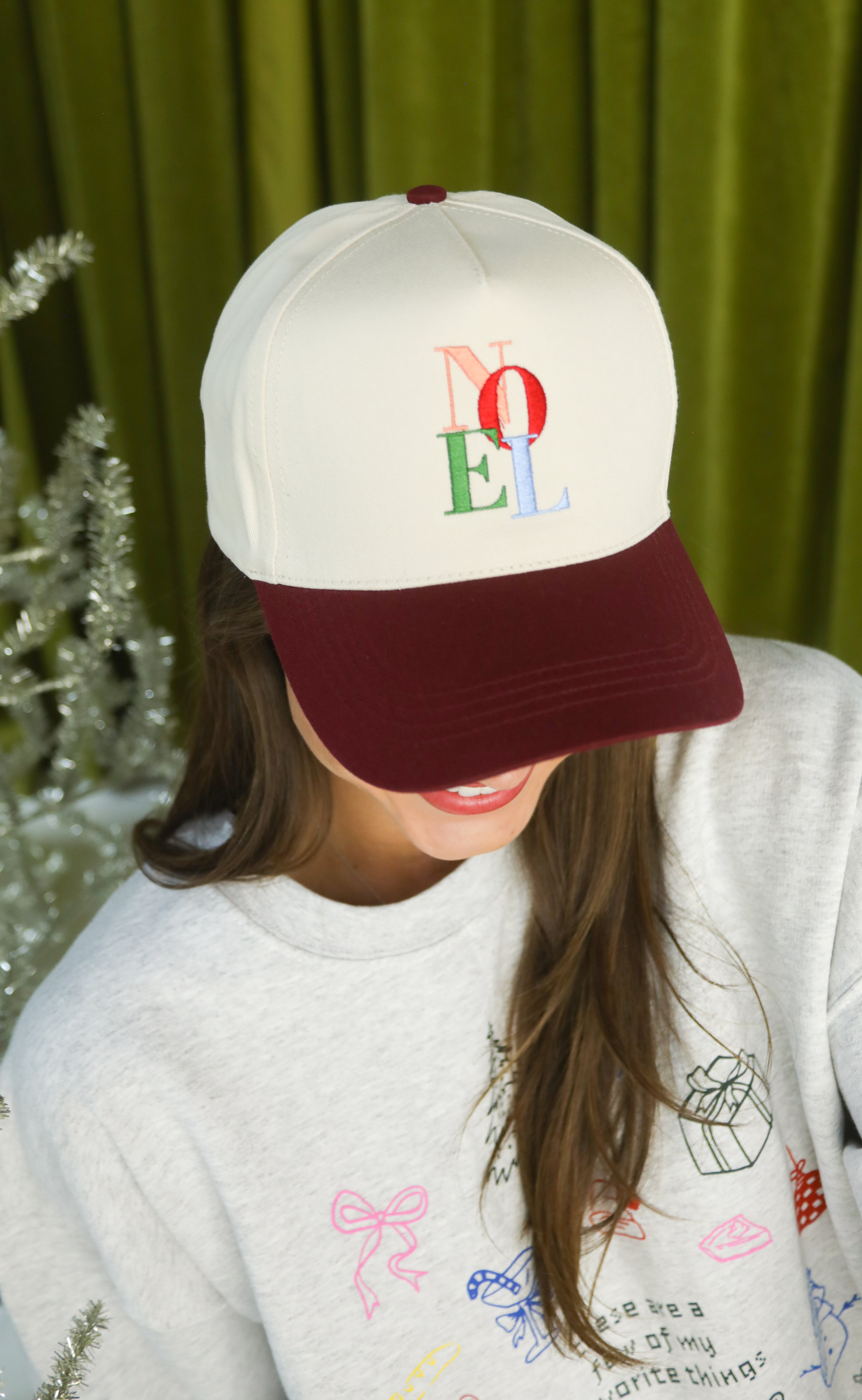 Top off your holiday look with a little cheer. This ivory and maroon embroidered trucker hat features “NOEL” in a playful stacked multicolor design. Perfect for gifting or for those festive errands when you still want to look cute.