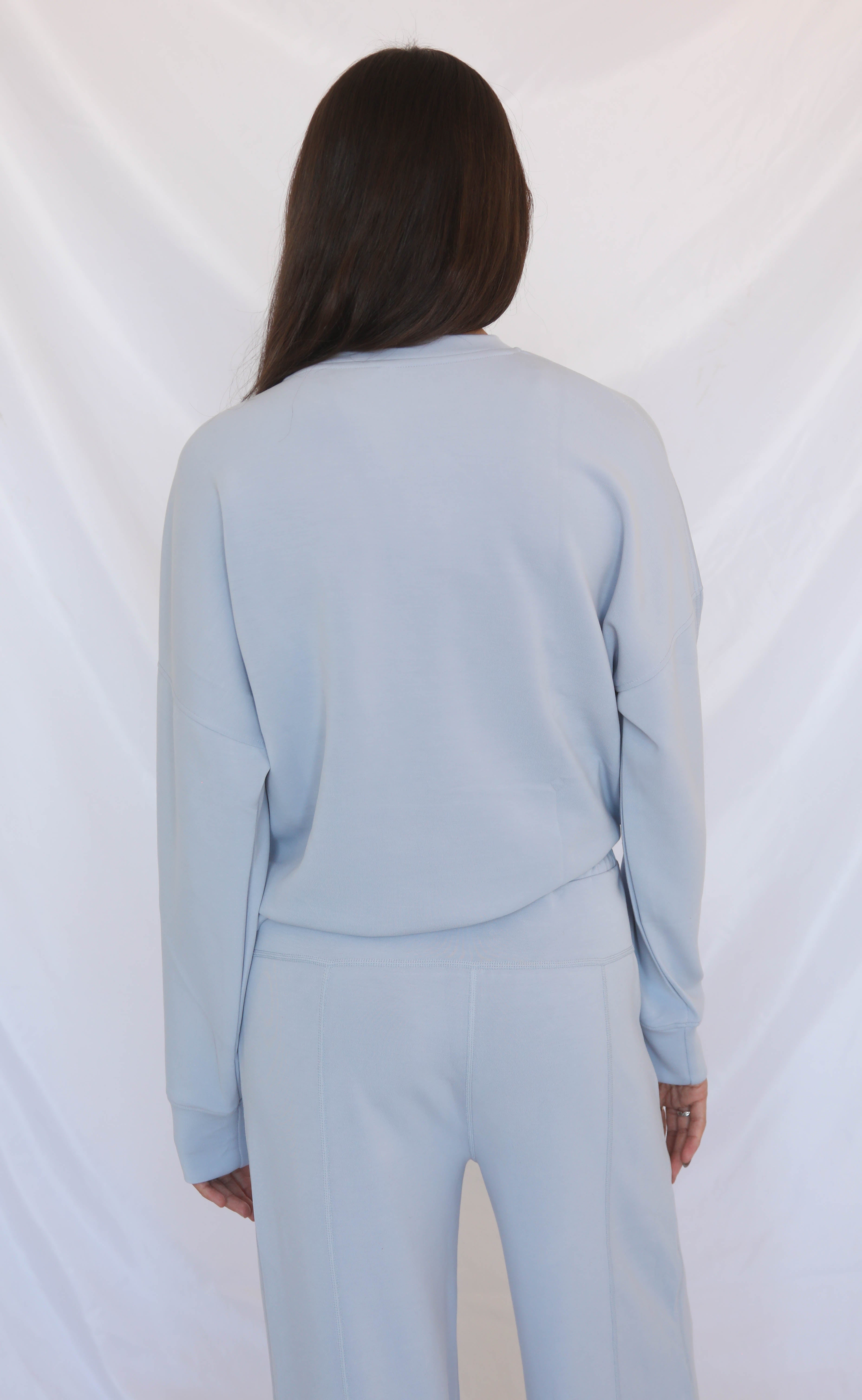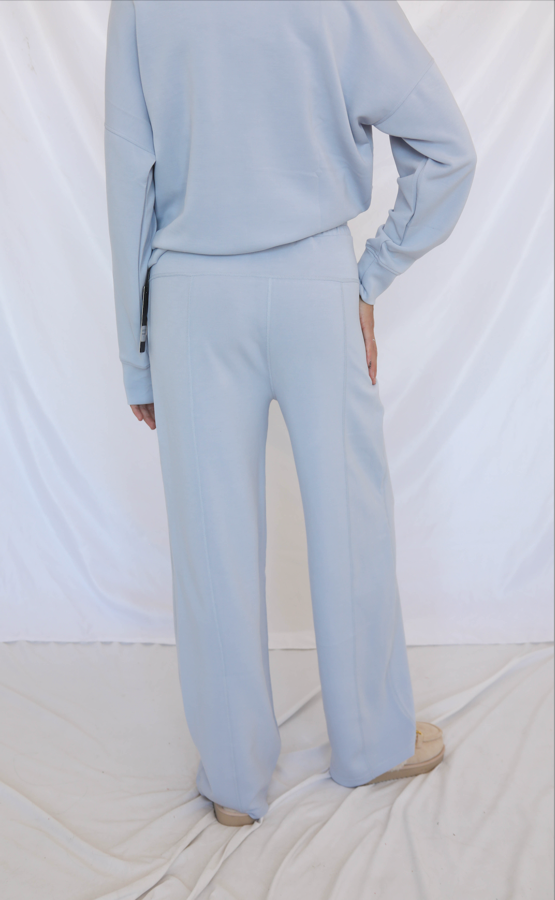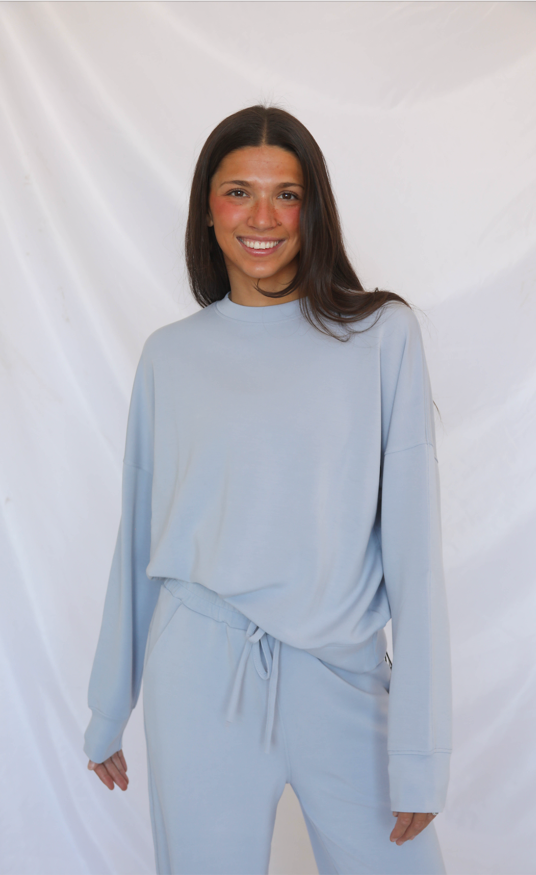 Slip into your softest day ever. This two piece modal lounge set comes in a dreamy soft blue and features a crewneck long sleeve top with drop shoulders and an oversized, boxy fit. The matching wideleg pants have an elastic waistband and functional drawstring for ultimate comfort. Chic enough for errands, cozy enough for the couch, this set was made for taking it slow in style.