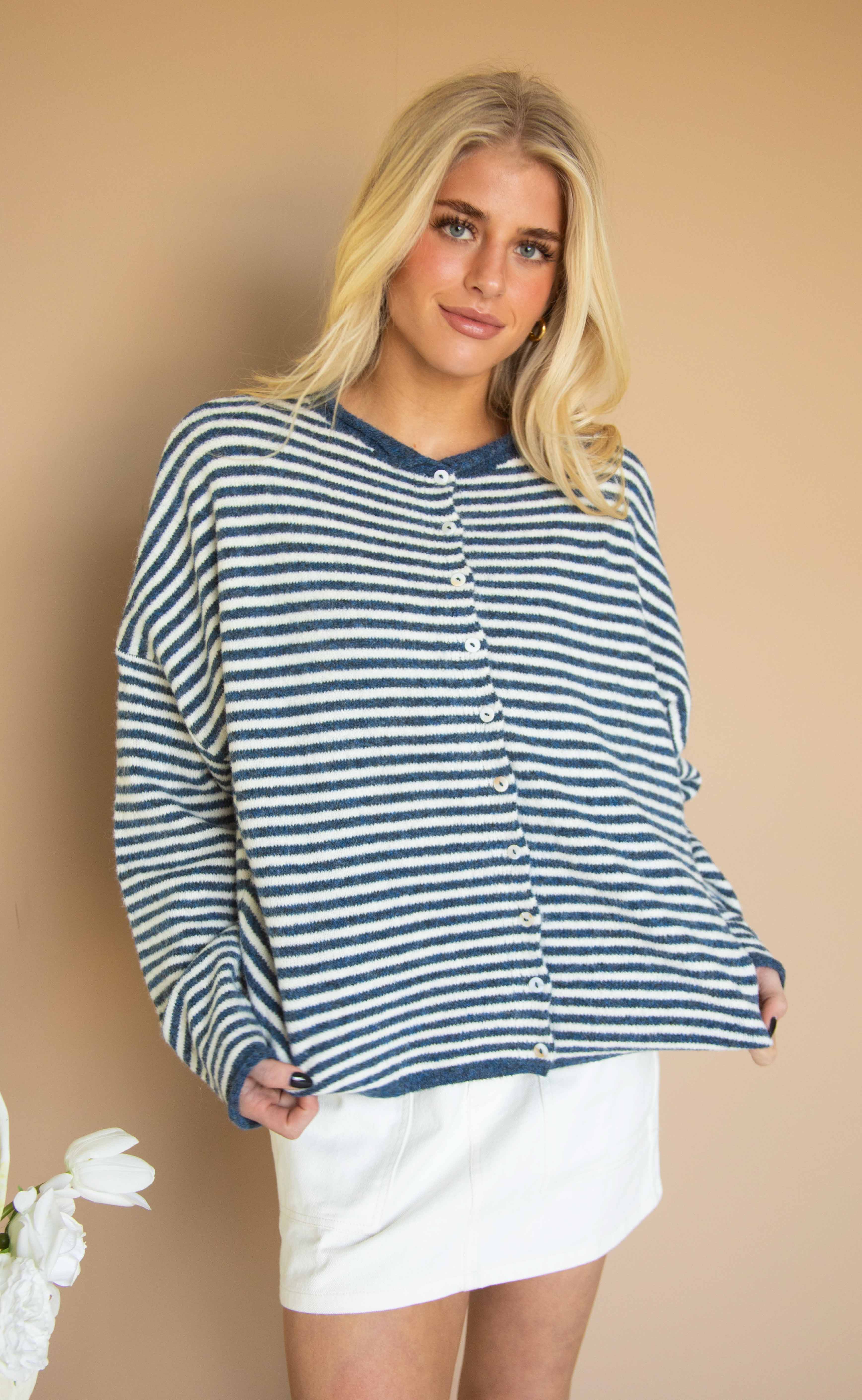 Your favorite cardigan is back in a fresh cream and white stripe. This soft lightweight layer has relaxed drop shoulders, long sleeves, and a classic button up front. It’s effortless, easy to style, and perfect for adding a cozy touch to any outfit. A true closet staple that keeps selling out for a reason.