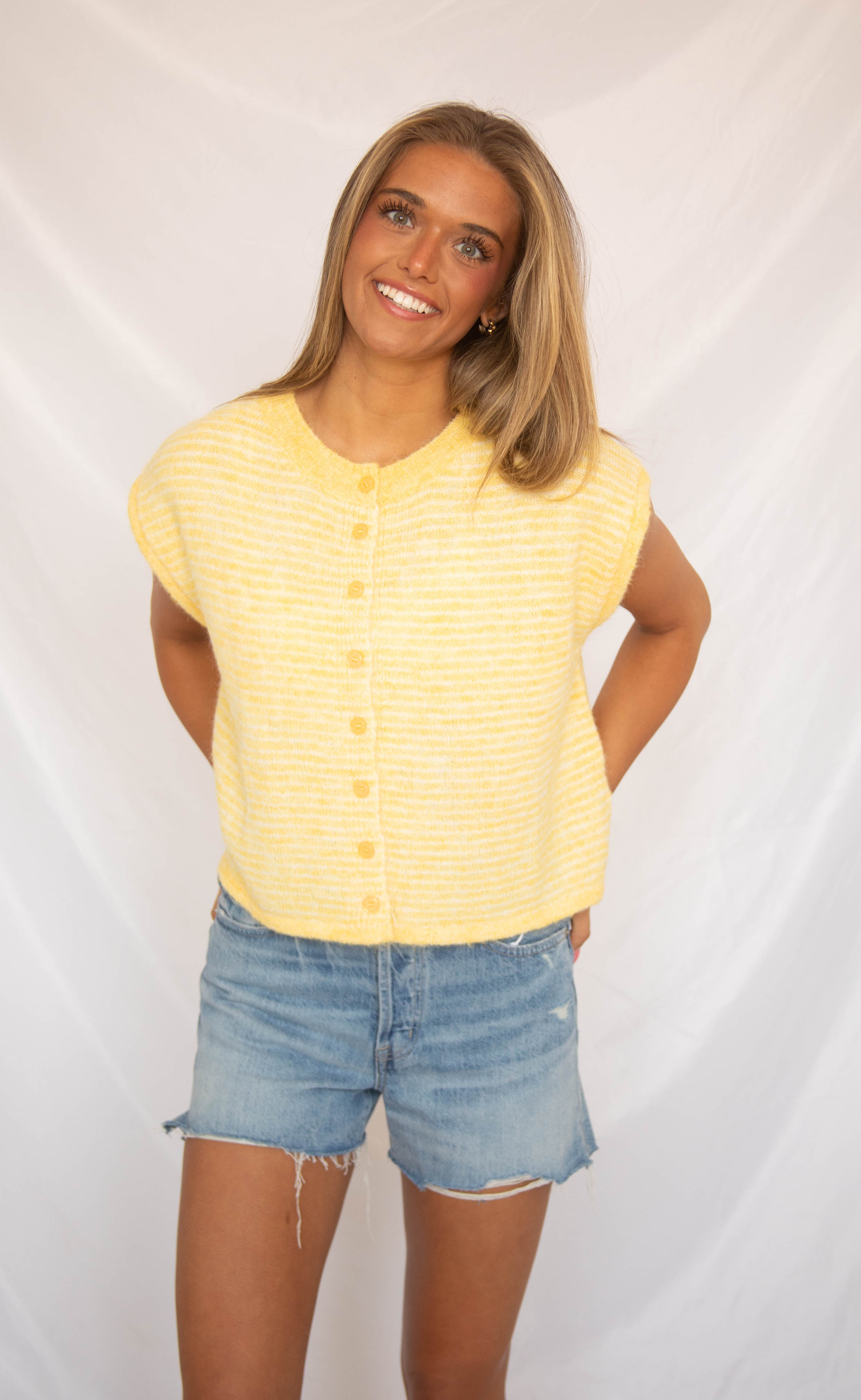Add a touch of preppy charm to your closet with this yellow and white striped sleeveless cardigan. Featuring a button-front design and a soft knit texture, this versatile vest is perfect for layering or wearing on its own for a breezy, elevated summer look.