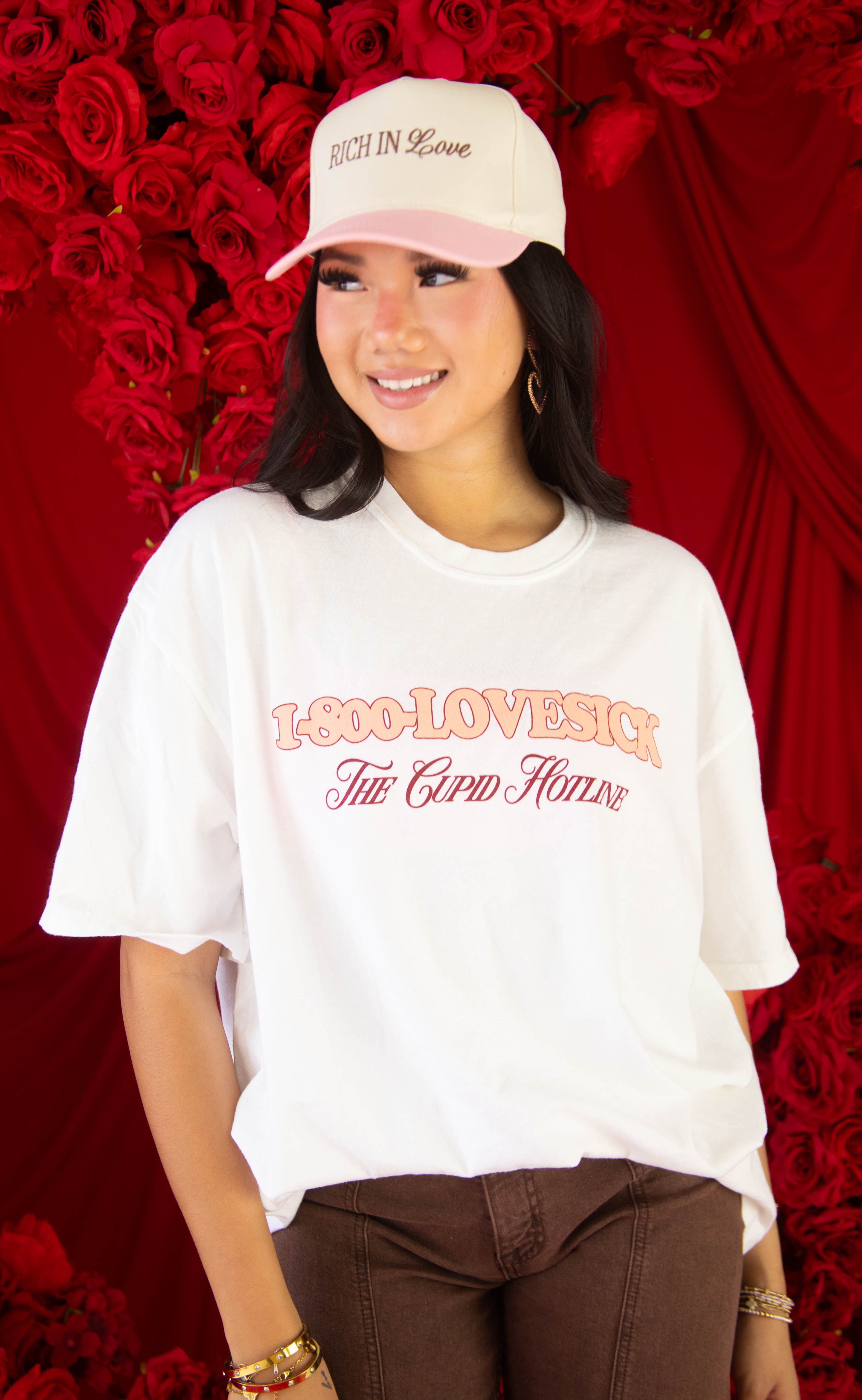 Better call Cupid! This adorable white tee features a front and back graphic with the lovesick hotline: 1-800-LOVESICK to talk directly to Cupid. We love the vintage phone graphic!