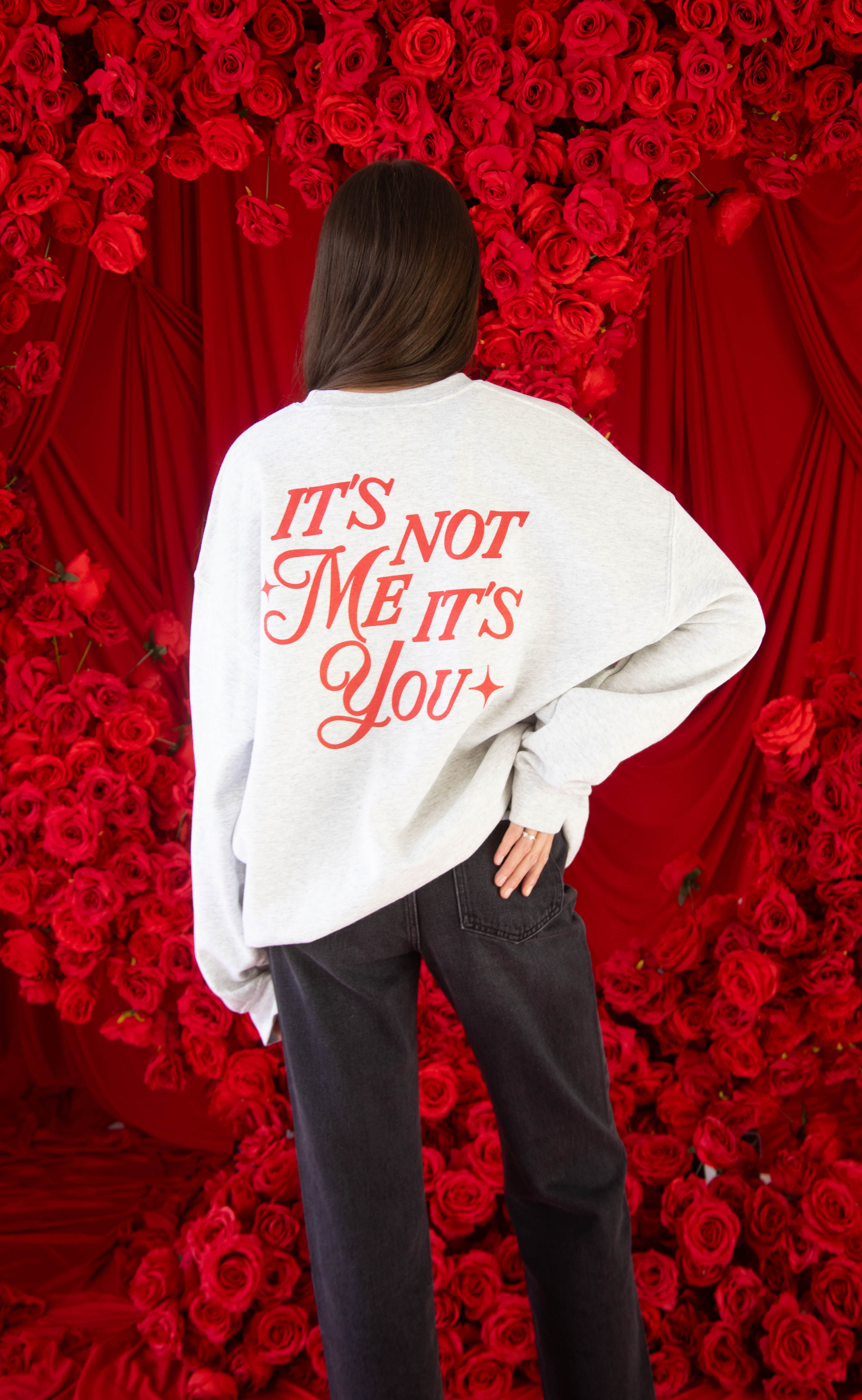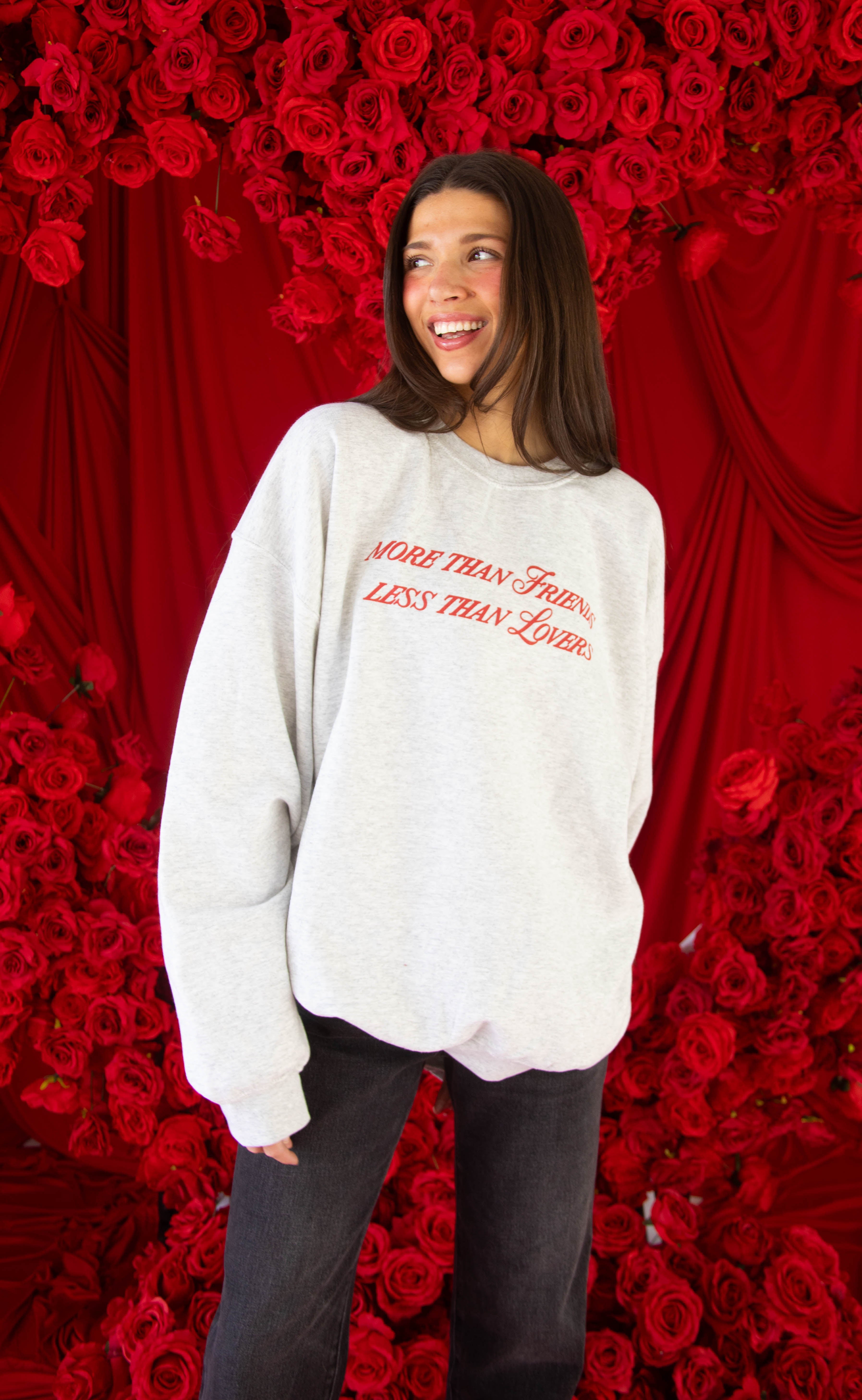 It's complicated . . . This ash grey crewneck is printed with a red front and back graphic perfect for the girl that's not sure what the relationship status is on Valentine's Day!