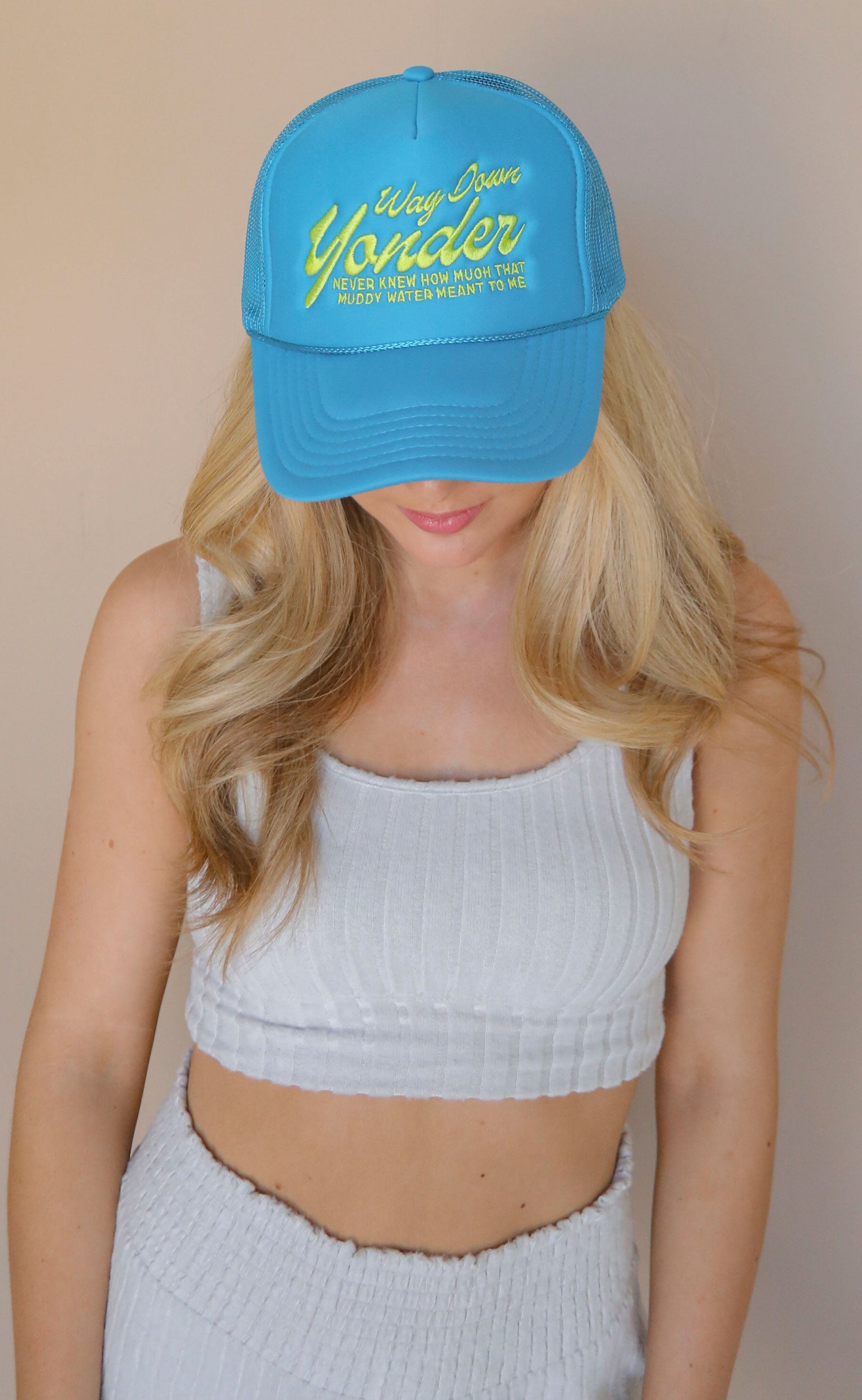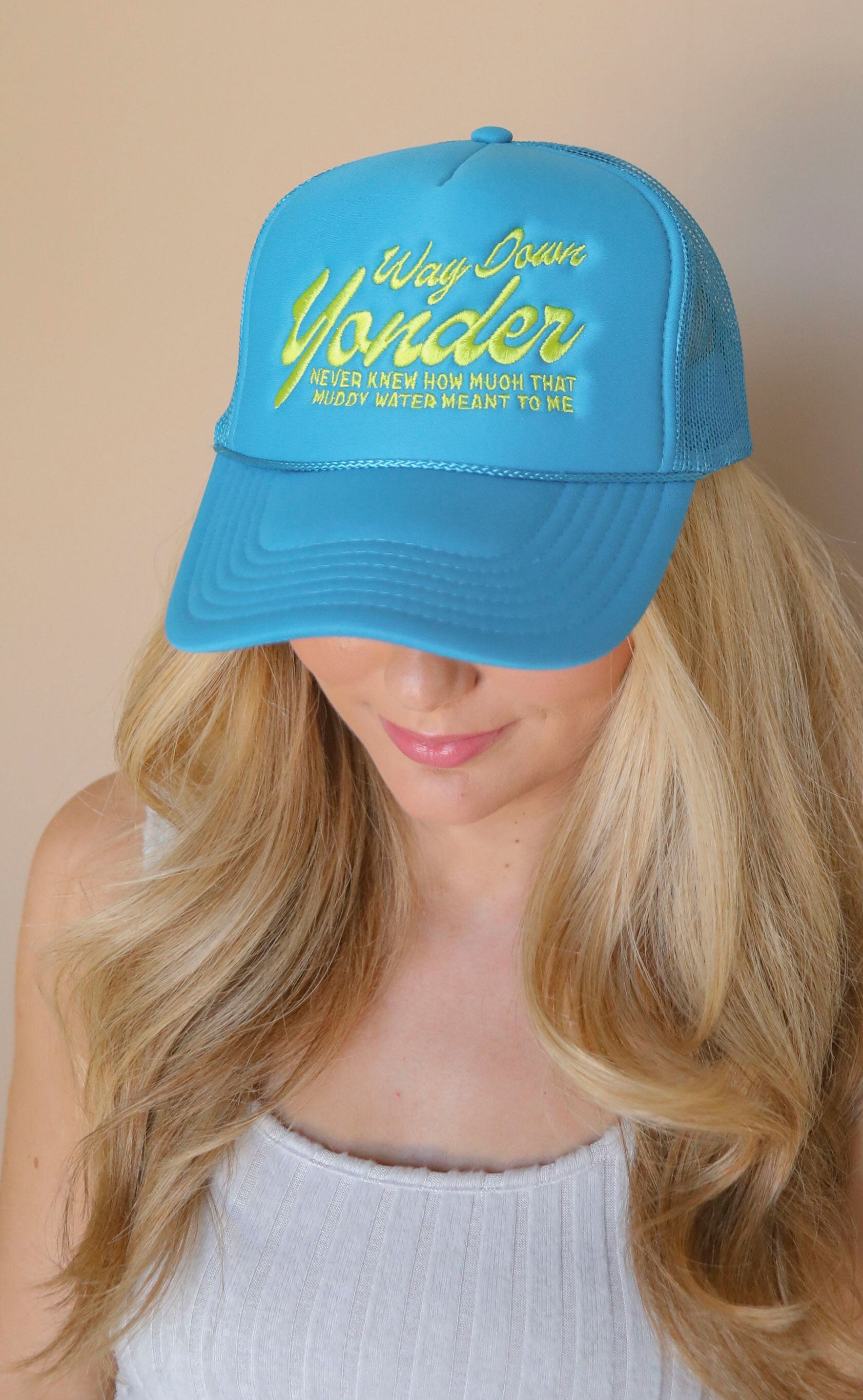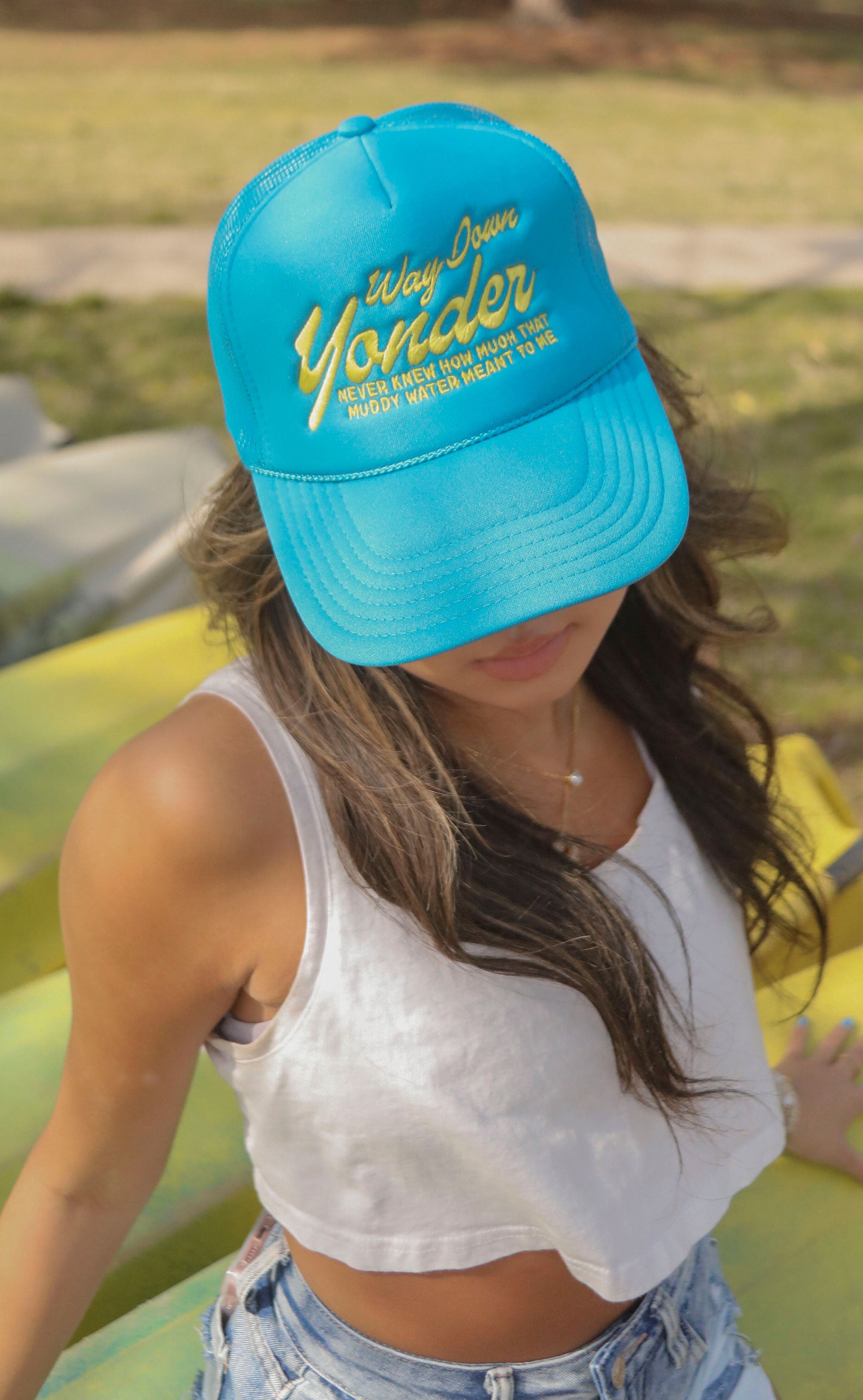 No summer trucker collection is complete without a tribute to Alan Jackson and the Chattahoochie! This bright blue trucker hat features a yellow embroidered ode to that "muddy water."
