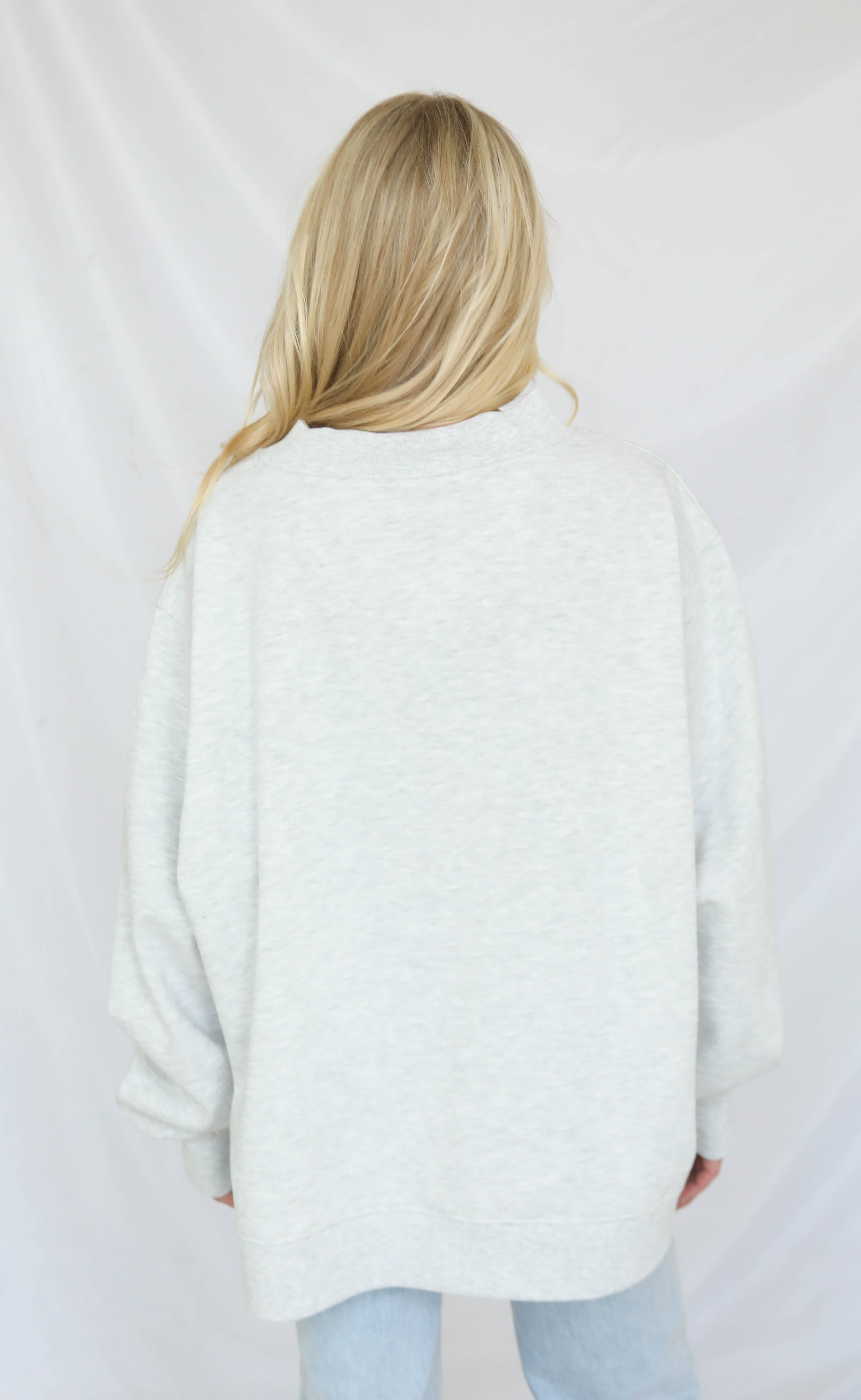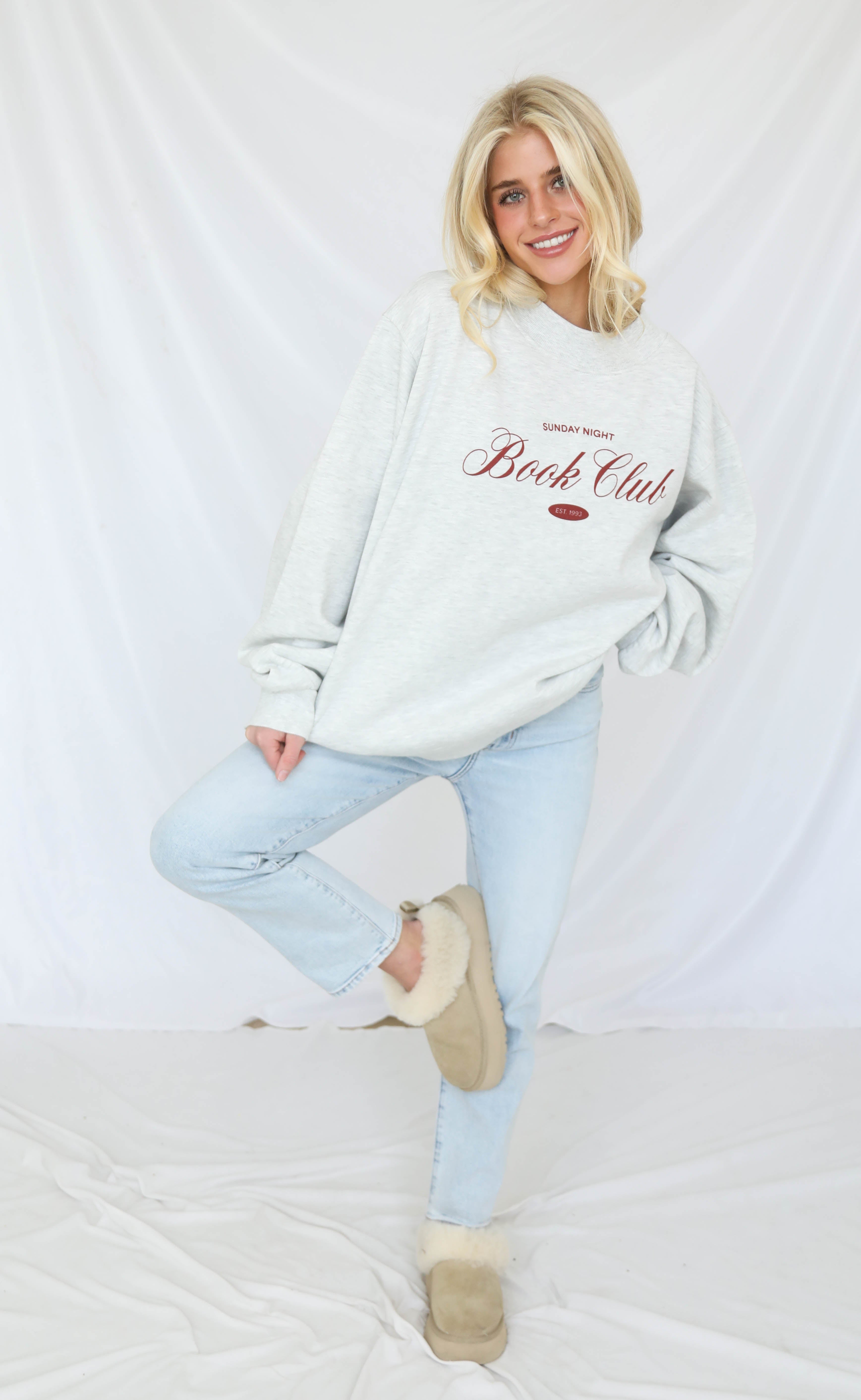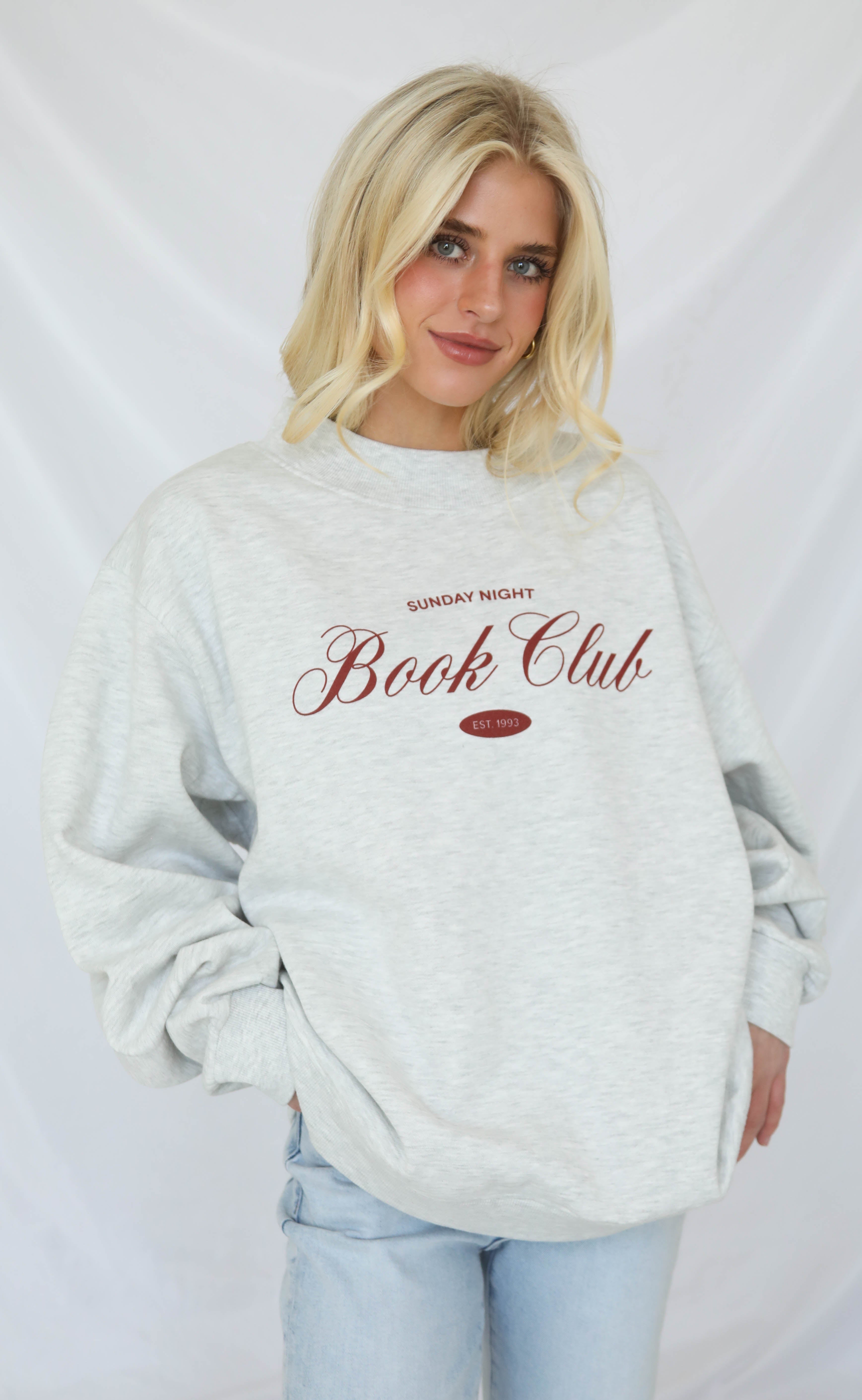 Meet your new Sunday night ritual. This ash grey mock neck sweatshirt features “Sunday Night Book Club” across the front in an easy relaxed fit you’ll want to live in. Cozy, cute, and perfect for curling up with your current read — or just pretending you are. A total vibe for book girls, lounge lovers, and anyone who wants their off-duty style to feel a little more special.