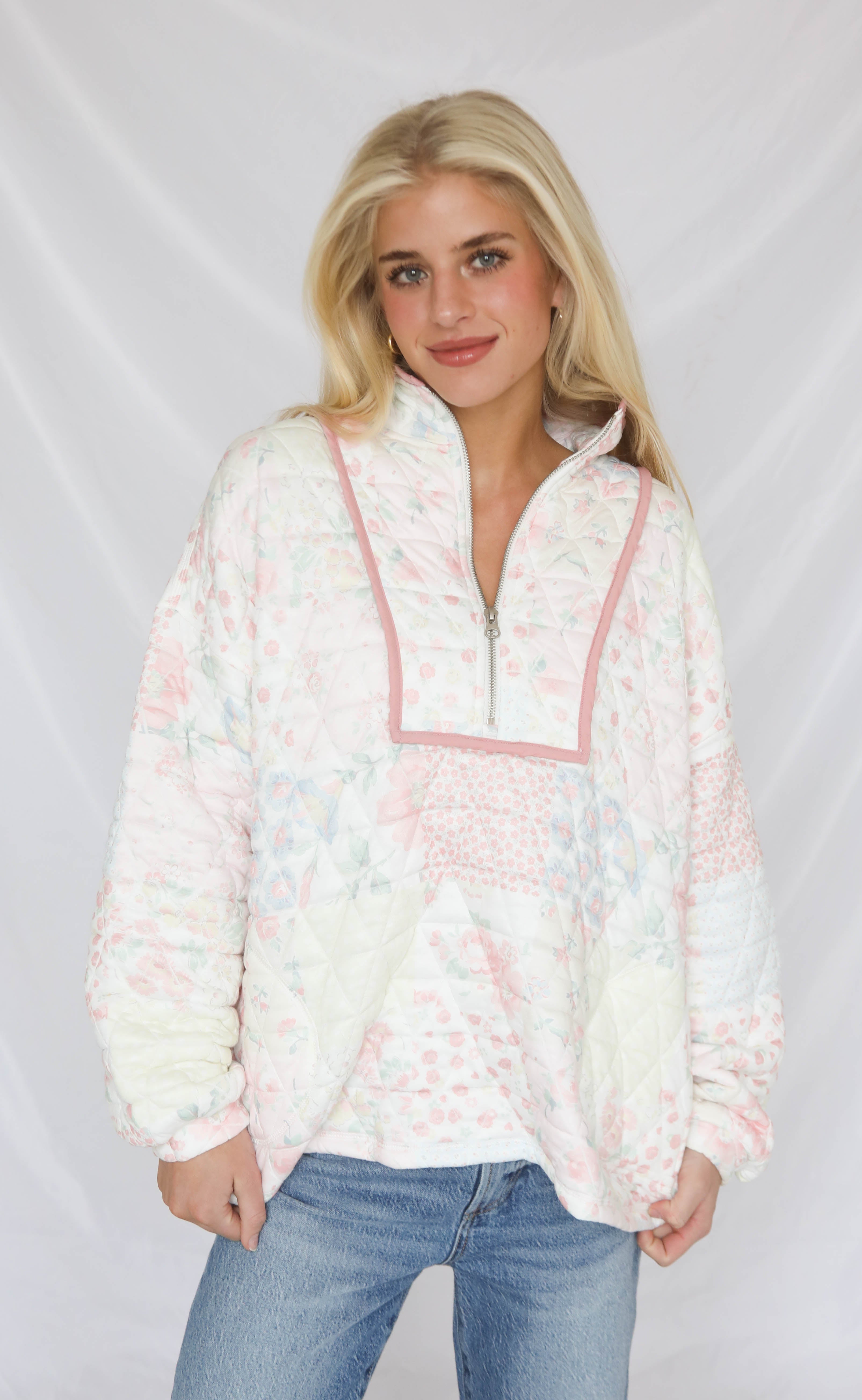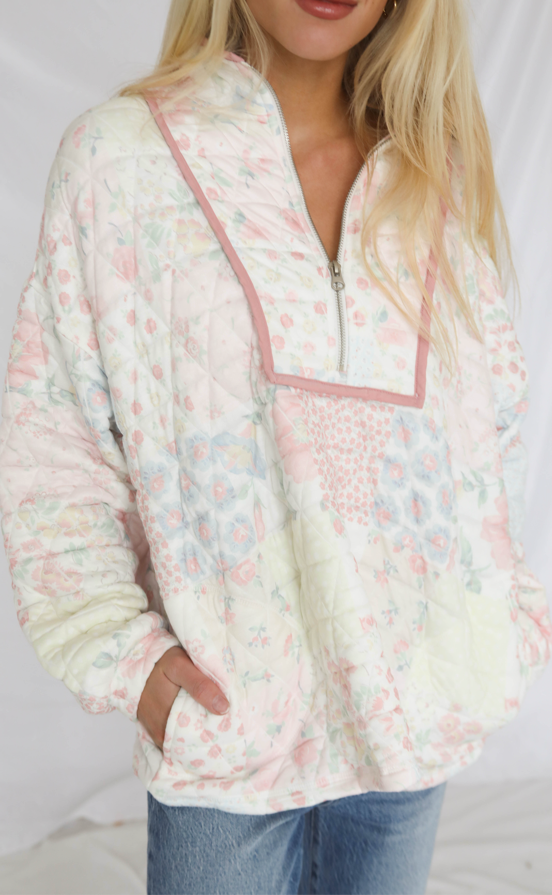 This light floral colorblock quilted half-zip brings vintage charm with modern ease. The cozy quilted fabric, practical pockets, and adjustable zip make it perfect for layering or wearing on its own, while the soft floral panels add a nostalgic, timeless touch.