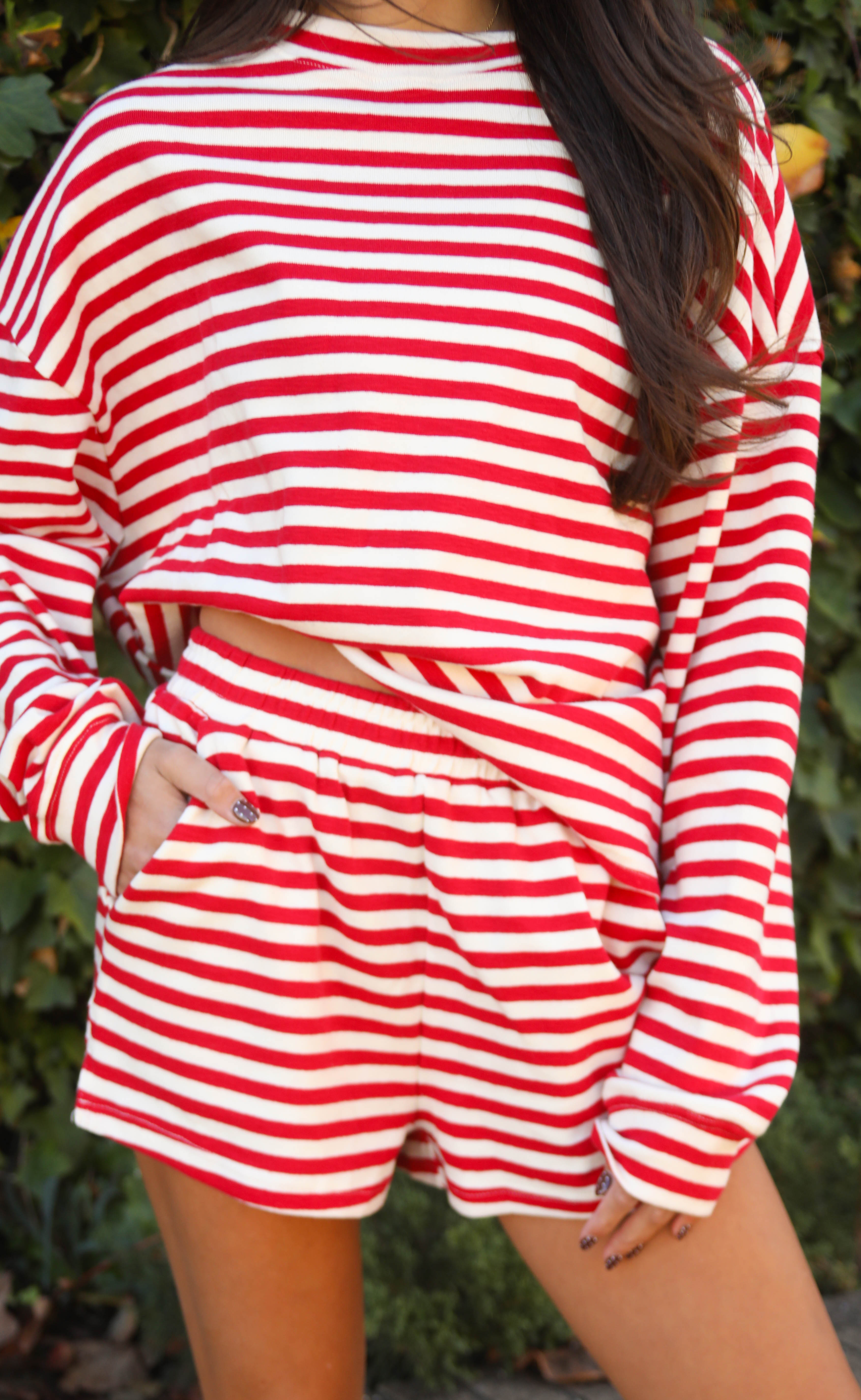 Your new favorite set just landed. This boxy, oversized long sleeve pullover and matching pull-on shorts in bold red and white stripes are as comfy as they are cute. Effortless to throw on, impossible to take off and already an HQ favorite. Consider this your heads-up: they’re predicted to sell out fast.