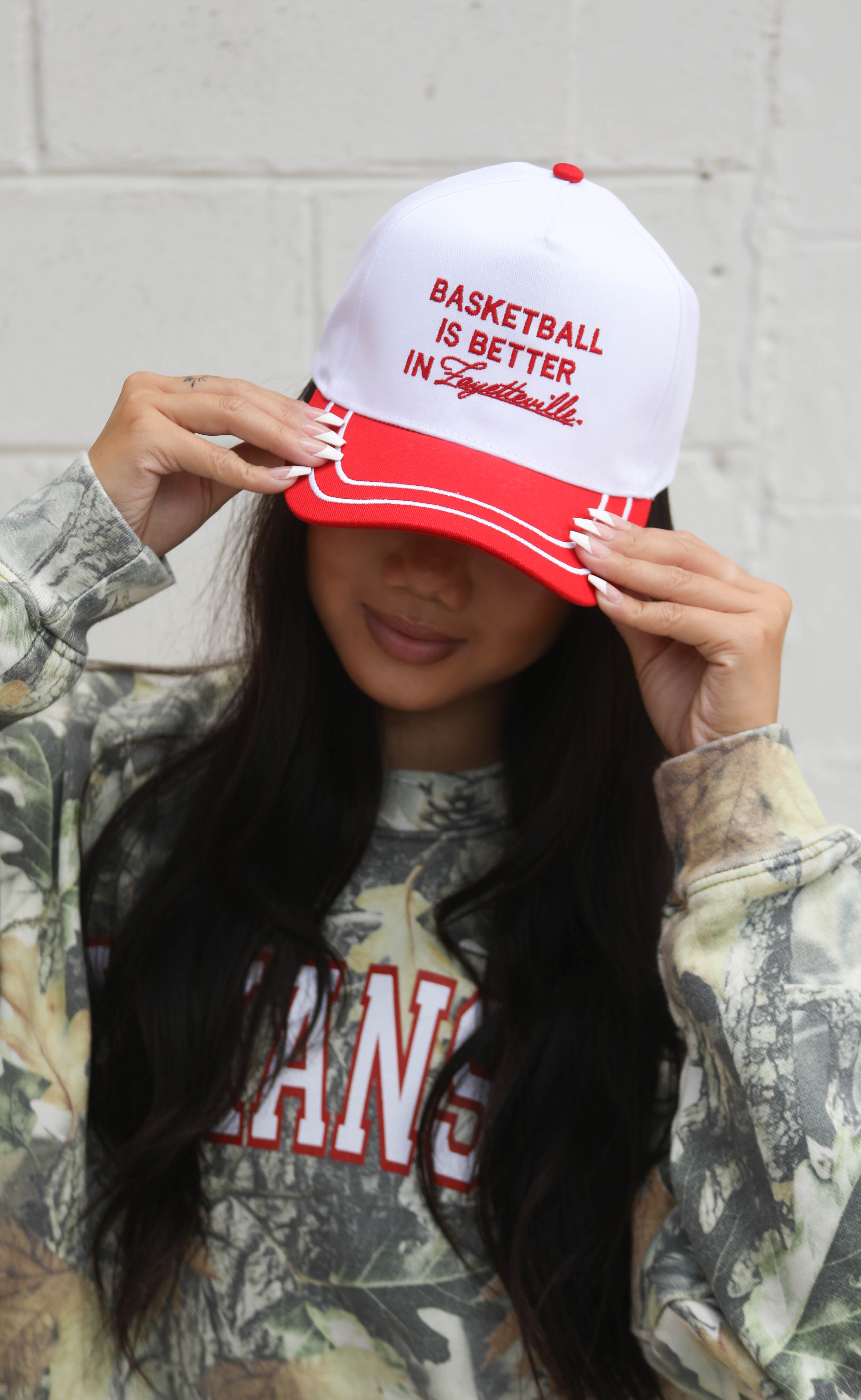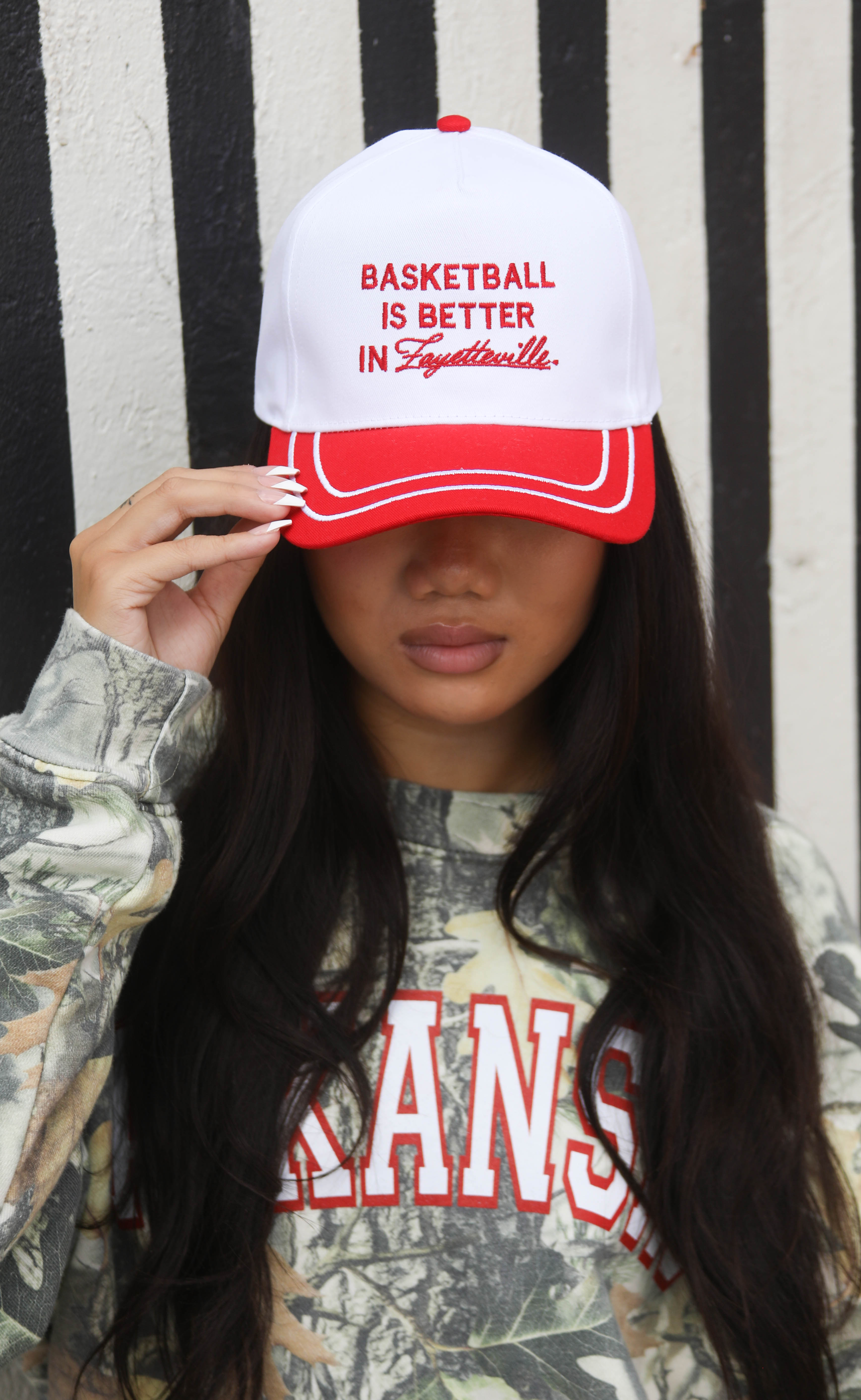 Show your Razorback pride wherever you go with this crisp white and red two-tone trucker. Featuring a bold “Basketball is Better in Fayetteville” graphic, it’s the perfect mix of sporty and casual, giving any outfit a little extra court-side flair.