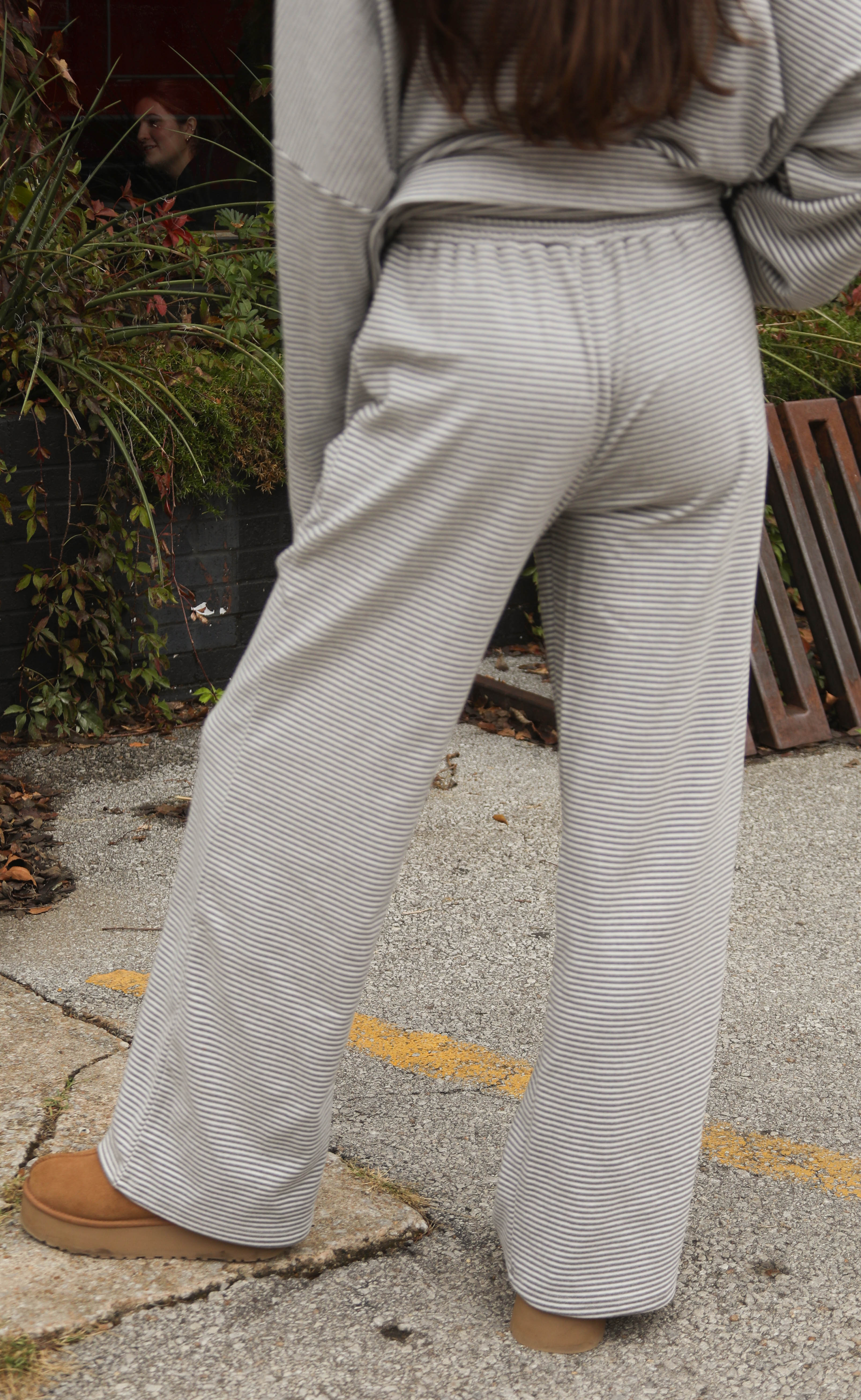 Cozy up in the Daydreaming Striped Fleece Pants. These pull on, wide leg pants are ridiculously soft and come in a grey and white stripe. Don't forget to grab the matching top.