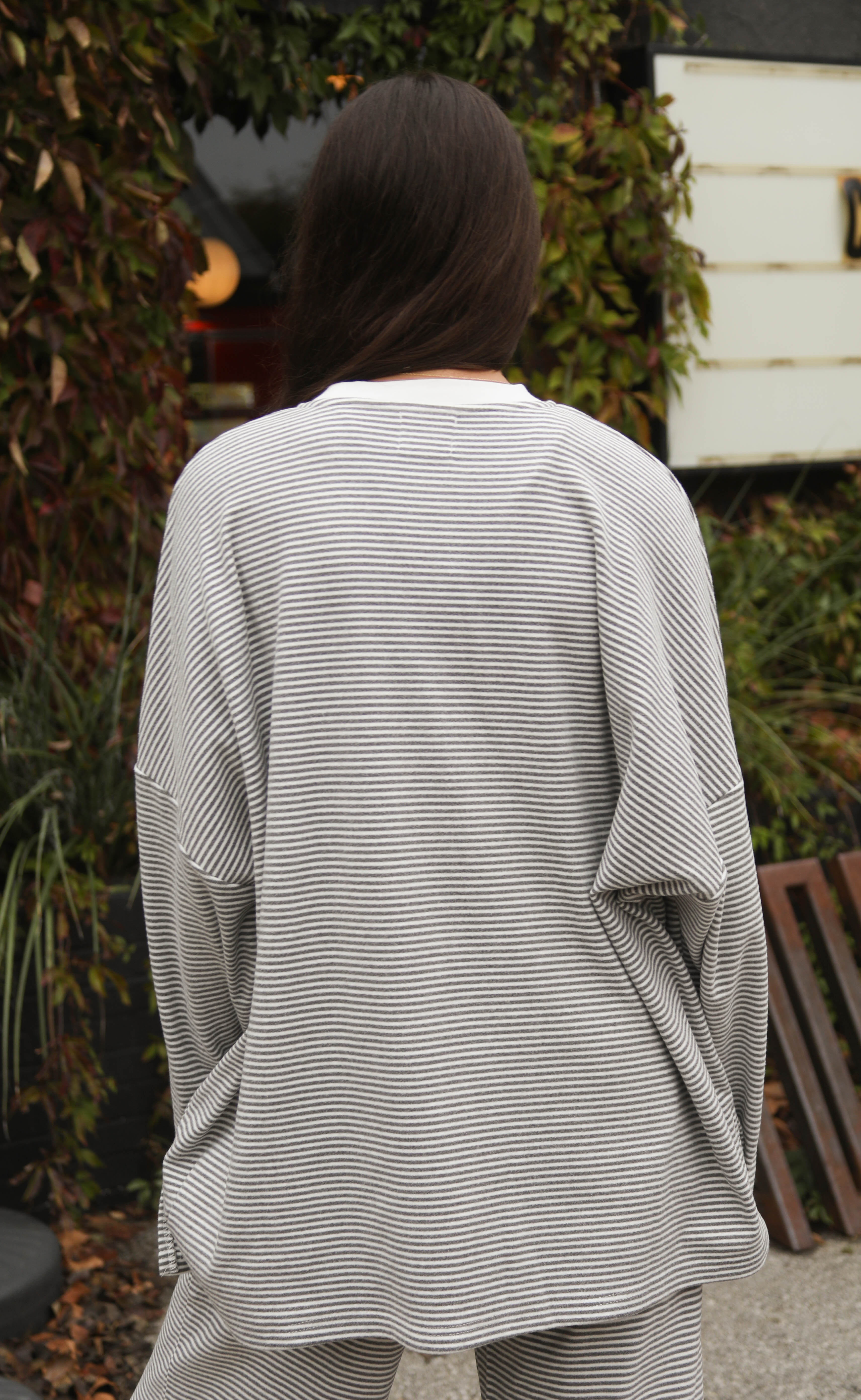 Cozy up in the fleece Daydreaming Striped Top. This grey and white striped top is boxy and oversized and pairs perfectly with the matching pants.
