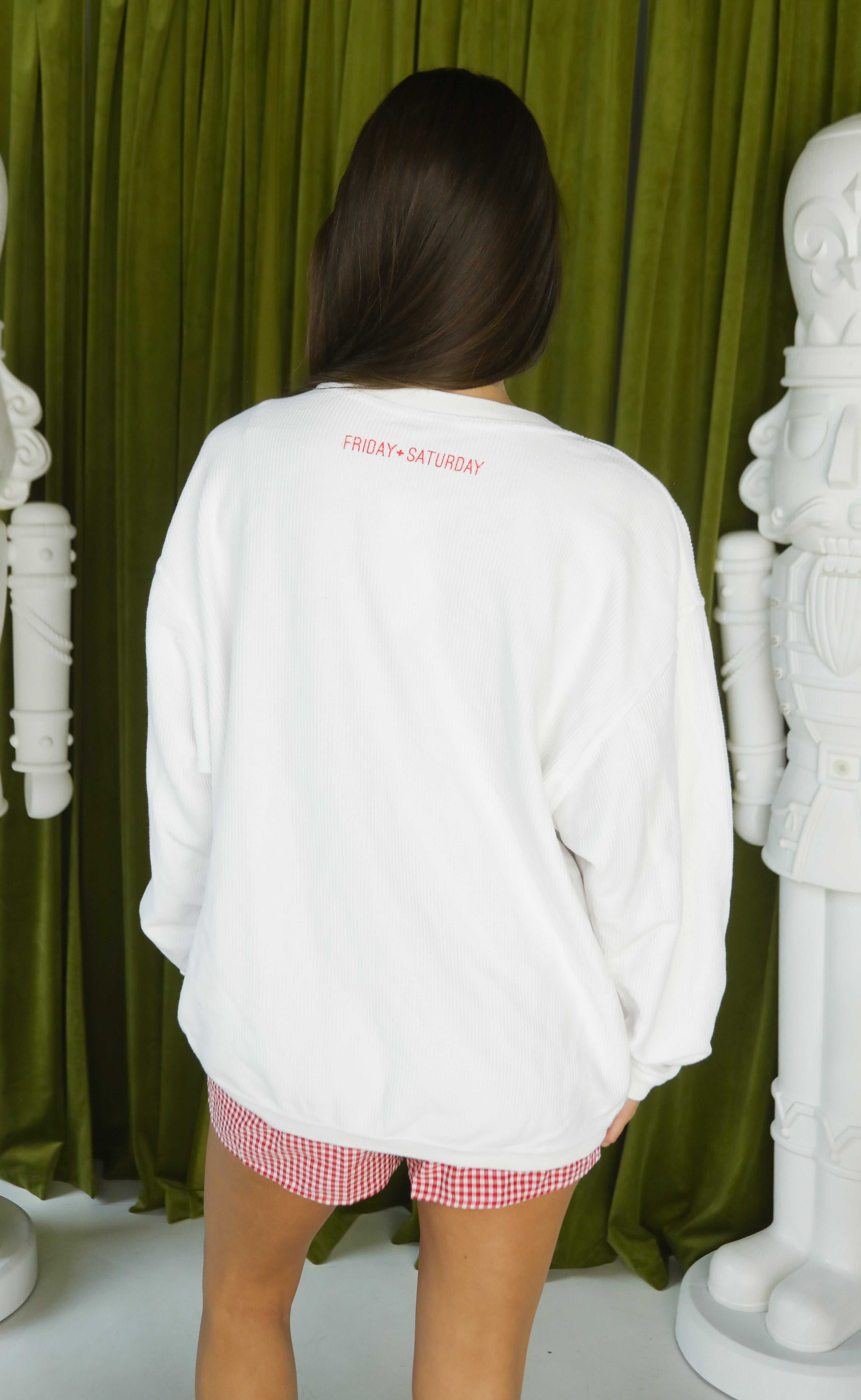 Have yourself a merry little Christmas in this cord! Featured on a crisp white cord and multi color fonts, this will pair with your fun holiday pjs or a bright bottom. Wear during your Christmas shopping or holiday baking.