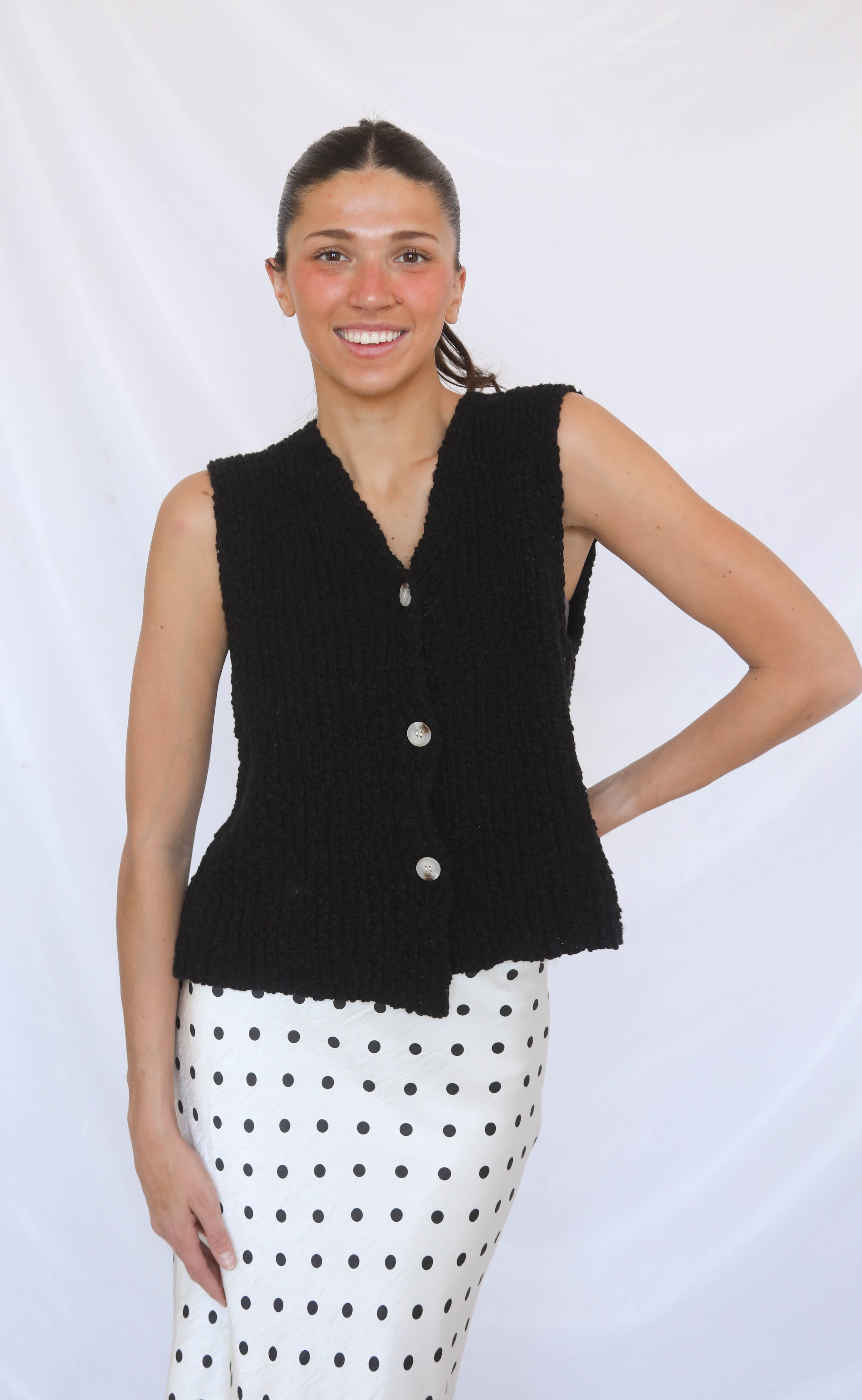 Sweater season is here and you can ease in with this sleeveless knit cardigan vest. This one is black with light grey tortoise style buttons. It's a simple, timeless and a sweater you'll be reaching for over and over again.